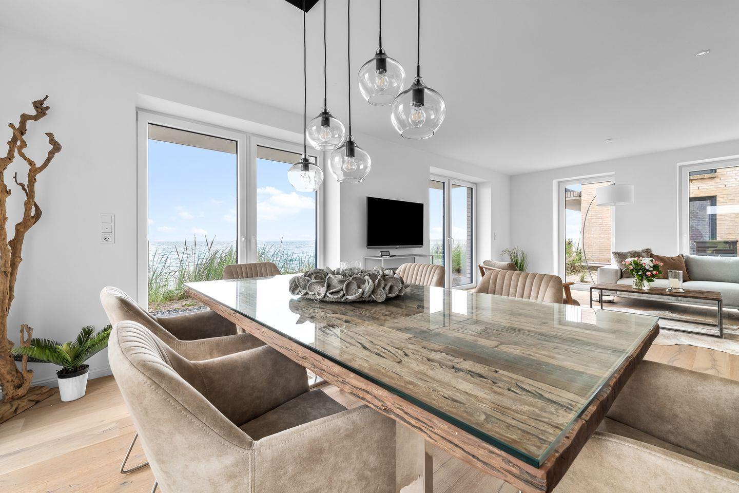 Auf großzügigen 118 m² bietet die Ferienwohnung "Nordglanz" Platz für bis zu 5 Personen. Der offene Wohn-Essbereich mit seiner voll ausgestatteten, modernen Küche im grifflosen Design lädt zu gemeinsamen Kocherlebnissen ein, während der Blick über das Wasser schweift. Ein gemütlicher Küchentresen mit Frühstücksbar und ein kommunikativer Esstisch mit direktem Meerblick machen jede Mahlzeit zum Erlebnis und sorgen dafür, dass man immer in bester Gesellschaft ist.