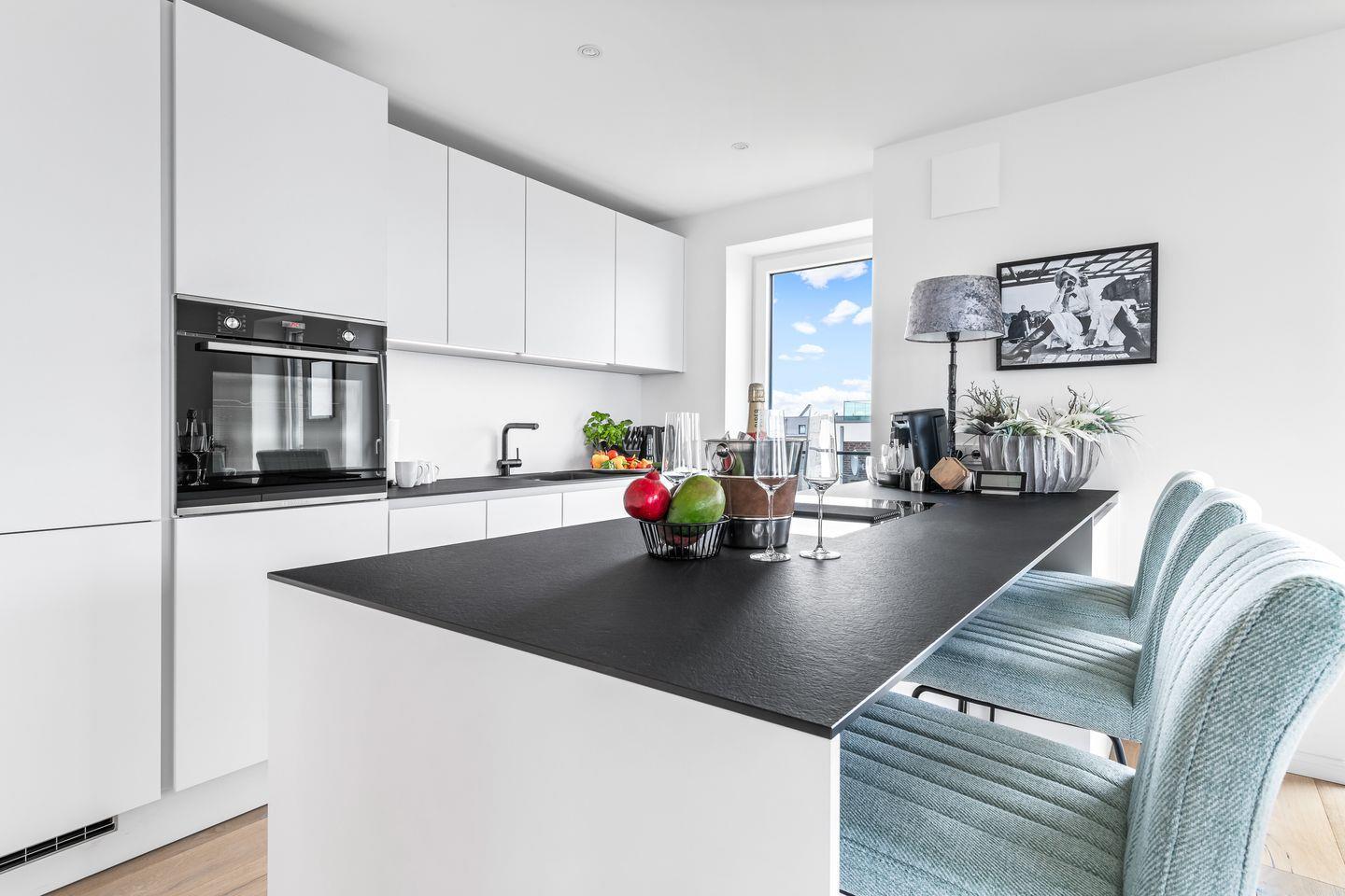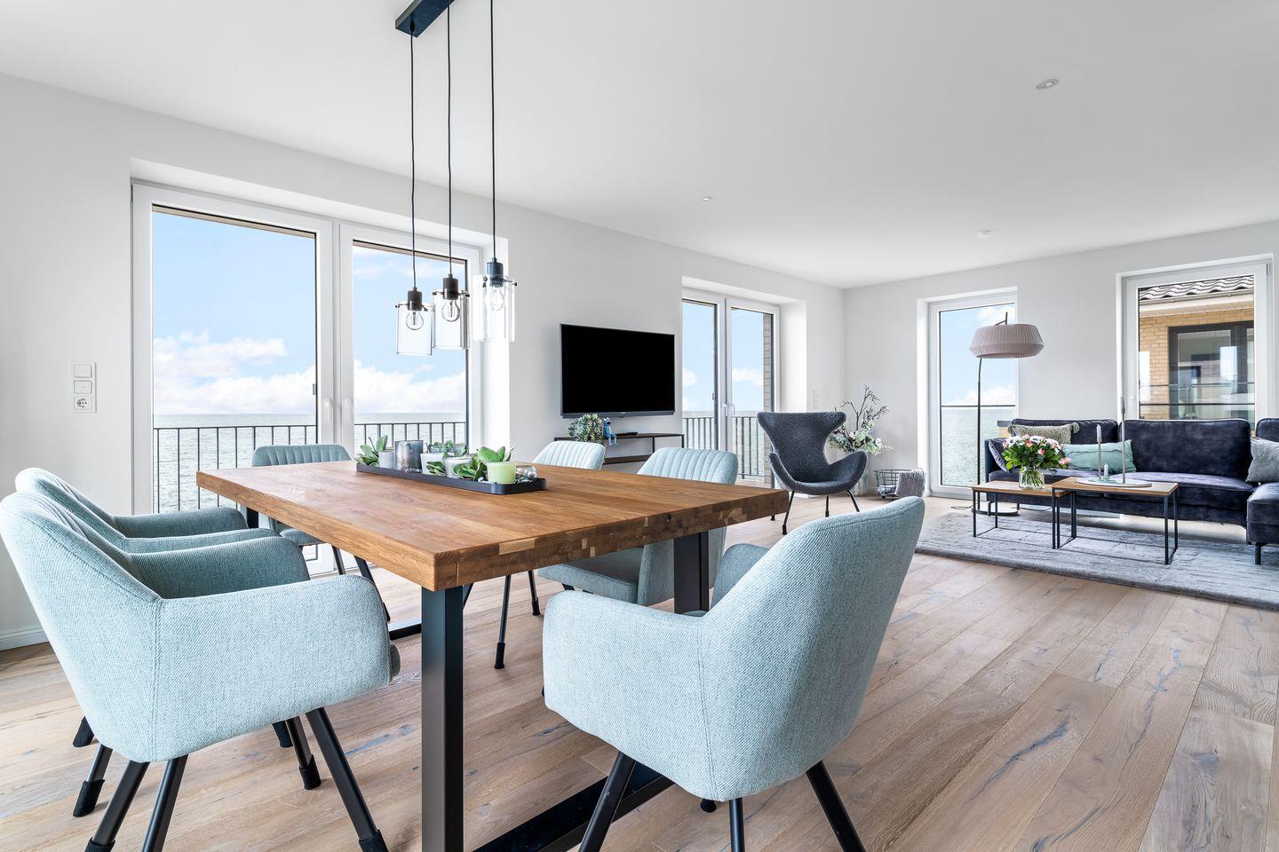 Der offene Wohn-Essbereich mit seiner voll ausgestatteten, modernen Küche ermöglicht es Ihnen, beim Kochen den Blick aufs Meer zu genießen. Der kommunikative Küchentresen mit Frühstücksbar und der gemütliche, große Esstisch bieten perfekte Plätze für gesellige Stunden mit Blick auf die Ostsee. Entspannen Sie auf dem komfortablen Sofa oder im behaglichen Sessel und lassen Sie Ihren Blick über das Wasser schweifen.