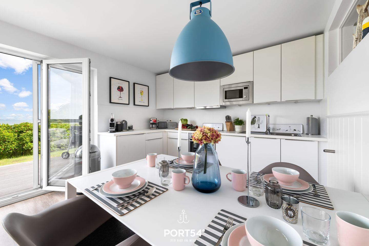 Das "Strandgut" ist eine hochwertig ausgestattete Ferienwohnung und bietet auf ca. 89m² Platz für bis zu 4 Personen. Es befindet sich im Erdgeschoss einer Doppelhaushälfte in einer ruhigen Sackgasse des OstseeResorts Olpenitz. Beim Betreten der Wohnung gelangen Sie in einen Flur, vom dem die beiden Schlafzimmer und das Bad abgehen. Das eine Schlafzimmer ist mit einem komfortablen Boxspring-Doppelbett (180x200cm) ausgestattet, während das andere zwei Einzelbetten (90x200cm) bereithält. Die Einzelbetten lassen sich aus hervorragend aneinanderstellen. Beide Schlafzimmer verfügen über einen Kleiderschrank, über Verdunkelungsmöglichkeiten und einen Zugang zu der vorderen überdachten Terrasse. Das Doppelschlafzimmer verfügt über einen TV. Direkt gegenüber von den Schlafzimmern befindet sich ein großzügig geschnittenes Badezimmer mit einer ebenerdigen Dusche und Infrarot-Sauna – ideal um sich an kühleren Tagen aufzuwärmen und zu entspannen! Zudem befinden sich im Bad ein Kosmetikspiegel und ein Fön. Vom Flur aus gelangen Sie ebenfalls zu dem gemütlichen und offenen Wohn- und Essbereich. Von hier aus haben Sie einen fantastischen Ausblick auf die Schlei und die Schleimündung. Genießen Sie einen spannenden Film auf dem Sofa, oder verbringen Sie gemeinsame Spieleabende am Esstisch. Die angrenzende offene Küche ist voll ausgestattet und hält alles wichtige für die Zubereitung leckerer Gerichte für Sie bereit. Alternativ können Sie auch auf der Terrasse unvergessliche Grillabende verbringen. Genießen Sie bei einen kühlen Getränk auf den Liegestühlen die atemberaubende Aussicht und beobachten Sie die Vögel und Schiffe auf dem Wasser. Die Wohnung ist selbstverständlich mit einer Fußbodenheizung ausgestattet, bietet an allen Fenstern einen Sichtschutz und verfügt über einen Waschtrockner. Für die kleinen Gäste stehen ein Kinderhochstuhl und ein Kinderreisebett zur Verfügung. Direkt vor dem "Strandgut" befindet sich ein kostenfreier Parkplatz mit einer E-Ladesäule. Weitere Fahrzeuge finden auf dem öffentlichen Parkstreifen Platz. Ihre Fahrräder können Sie im eigenen abschließbaren Fahrradschuppen trocken und sicher abstellen. Hier befinden sich auch zwei hauseigene Tretroller, die Sie kostenfrei auf eigene Gefahr benutzen dürfen.