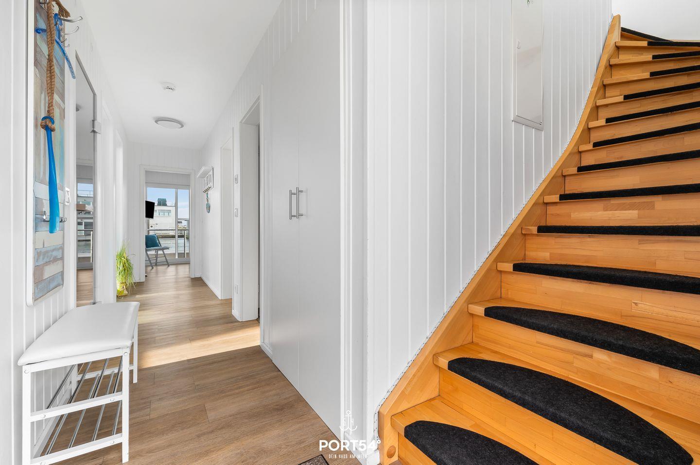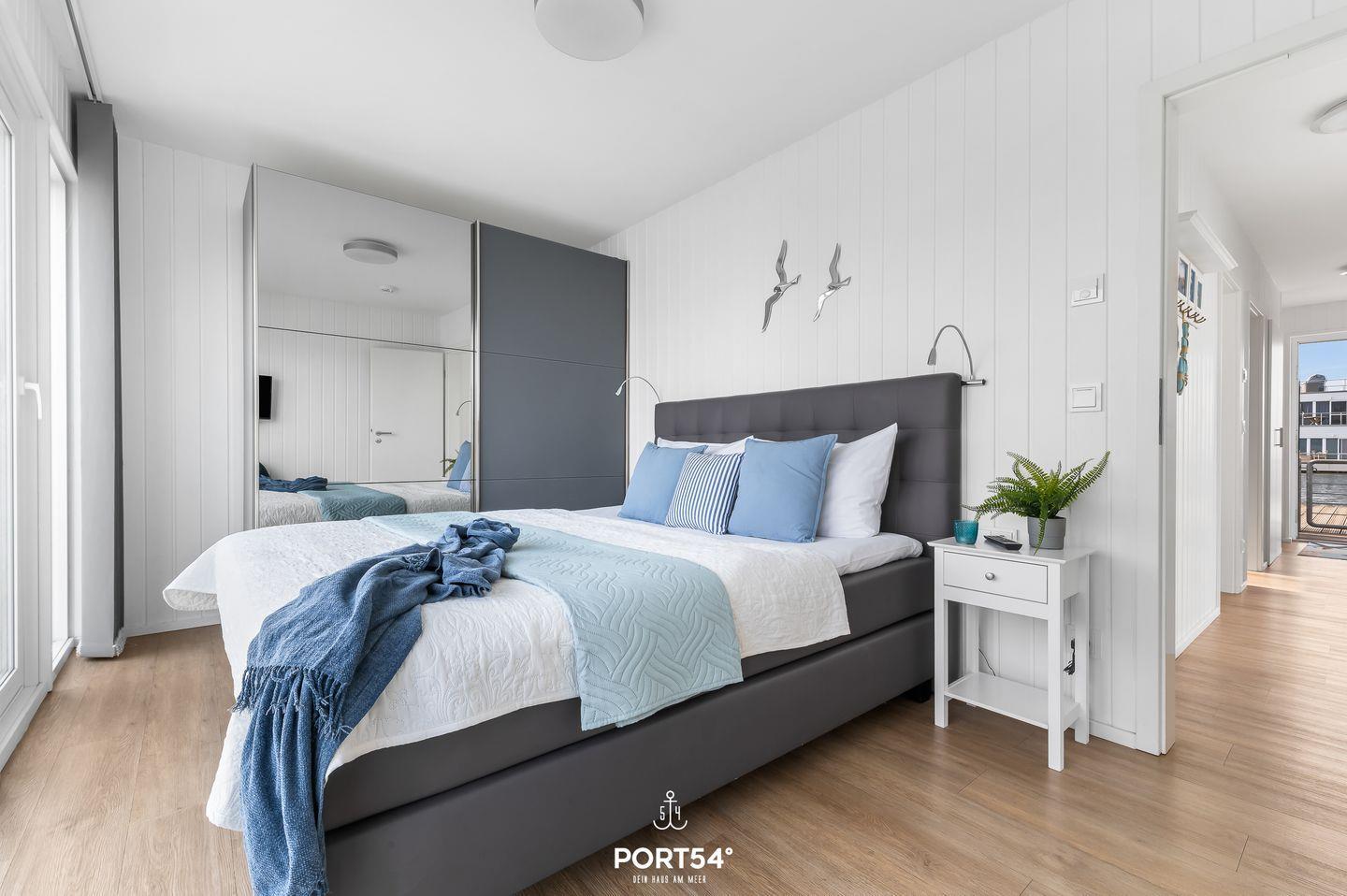 Das luxuriöse schwimmende Ferienhaus "Sea Lounge" befindet im OstseeResort Olpenitz und ermöglicht Ihnen einen unvergesslichen Urlaub an der Ostsee. Die stilvoll eingerichtete Unterkunft bietet auf insgesamt 97m² Platz für bis zu 4 Personen und verfügt über zwei liebevoll gestaltete Schlafzimmer. Das eine ist mit einem Boxspring-Doppelbett (180x200cm) und einem Kleiderschrank ausgestattet, während das andere Schlafzimmer mit 2 Einzelbetten (90x200cm) überzeugt. Beide Schlafzimmer ermöglichen dank Verdunkelungsmöglichkeiten und Insektenschutzgitter einen erholsamen Schlaf. Ebenfalls sind beide Schlafzimmer mit einem Flachbild-Fernseher ausgestattet, sodass es an Unterhaltung nicht mangelt. Das Hauptschlafzimmer ermöglicht Ihnen sogar einen direkten Zugang zur Terrasse - hier können Sie direkt nach dem Aufstehen die frische Meeresluft genießen. Auch das Tageslicht-Duschbad befindet sich im Erdgeschoss. Hier finden Sie auch einen Kosmetikspiegel, einen Handtuchheizkörper und Insektenschutzgitter vor. Für absolute Entspannung sorgt die private finnische Sauna, in der Sie nach einem langen Strandtag oder einer Wanderung entlang der Küste die wohltuende Wärme genießen können. Im Obergeschoss lädt der großzügige, offene Wohn- und Essbereich in modernem Design gehalten und zum Entspannen ein. Große Panoramafenster bieten einen herrlichen Blick auf das Wasser und schaffen eine lichtdurchflutete, angenehme Atmosphäre. Die Küche ist für kulinarische Abende hervorragend ausgestattet. Im Wohnbereich können Sie es sich wunderbar auf dem Sofa bequem machen und sich auf dem Flachbild-Fernseher gemeinsam einen Film ansehen. Angrenzend befindet sich der Balkon, auf dem Sie den Tag in komfortablen Gartenmöbeln ausklingen lassen oder den Morgen mit einem Frühstück im Freien beginnen. Für Grillabende steht Ihnen ein Elektro-Grill zur Verfügung. Ein absolutes Highlight ist die großzügige Panorama-Dachterrasse, die einen atemberaubenden 360° Blick über die Schlei und das Hafenbecken des Resorts bietet. Genießen Sie die Aussicht bei einem kühlen Getränk im Strandkorb und lassen Sie die Seele baumeln. Vor der Steganlage steht Ihnen ein kostenloser PKW-Stellplatz zur Verfügung. Die "Sea Lounge" liegt im exklusiven Ostseeresort Olpenitz, das für seine idyllische Lage und die Nähe zum Wasser bekannt ist. Von hier aus haben Sie direkten Zugang zu den Stränden der Ostsee und können die maritime Umgebung in vollen Zügen genießen. Ob Wassersport, Radfahren oder einfach nur Naturerlebnisse – hier finden Sie alles, was das Herz begehrt. Die "Sea Lounge" ist der perfekte Ort für einen luxuriösen und erholsamen Urlaub an der Ostsee.
