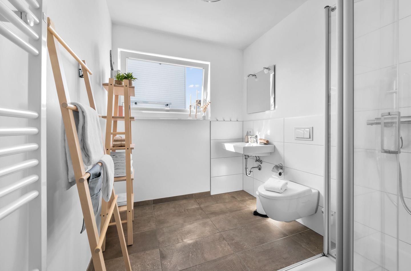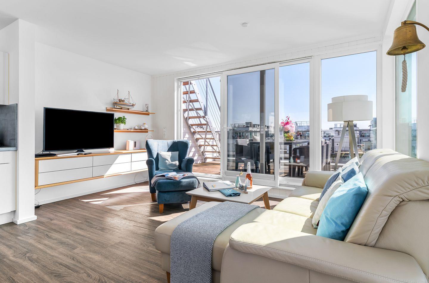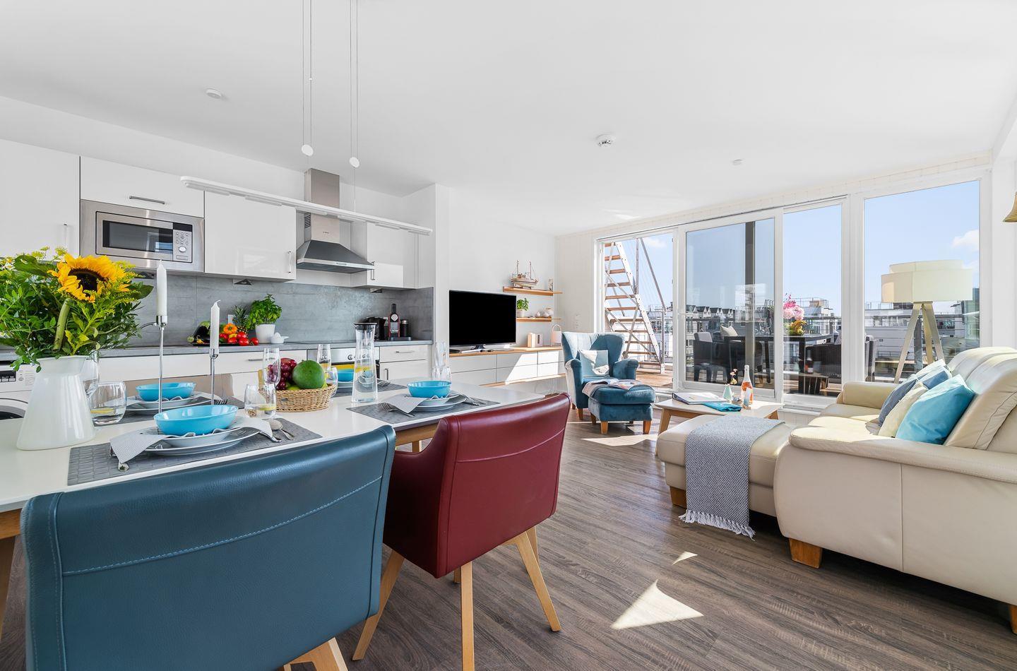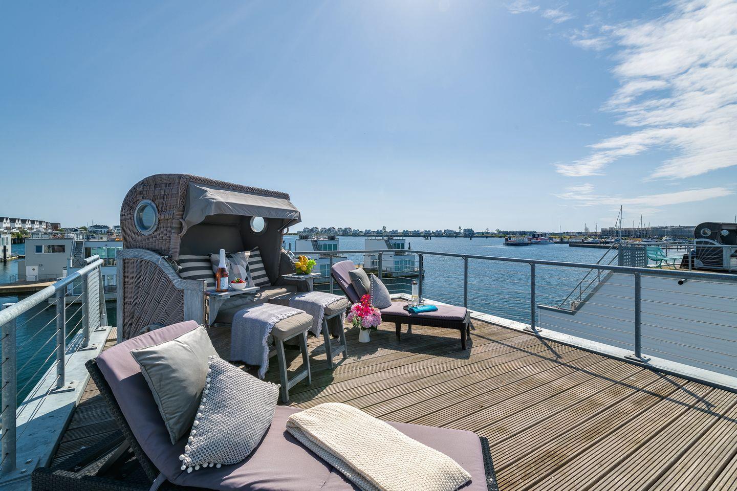 Der offen gestaltete Wohn- und Essbereich im ersten Obergeschoss beeindruckt mit großzügigen Fensterfronten, die einen spektakulären Wasserblick freigeben. Die Holzterrasse mit Südwestausrichtung ist ideal für entspannte Sommerabende und führt zu einer 30 m² großen Dachterrasse, wo Sie die Sonne den ganzen Tag über genießen und einen weiten Blick über den Hafen des Ostsee Resort Olpenitz sowie die Schlei und Ostsee haben.