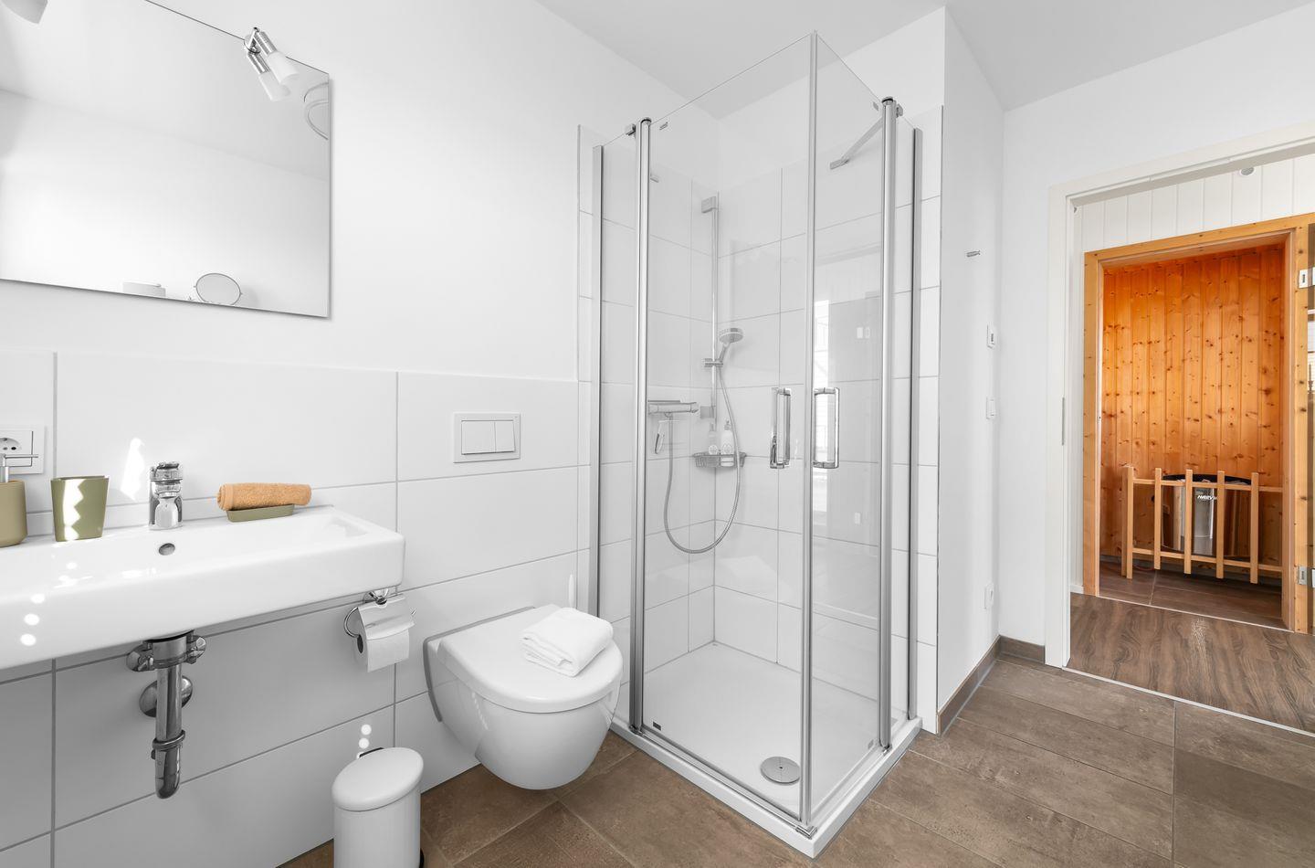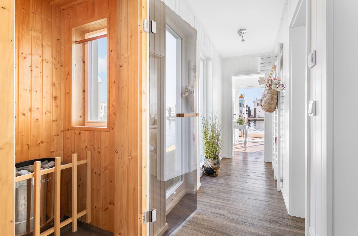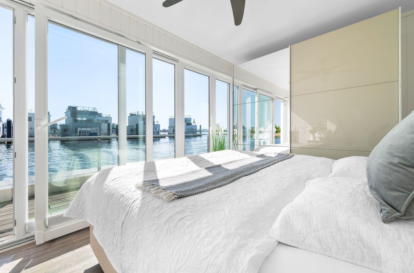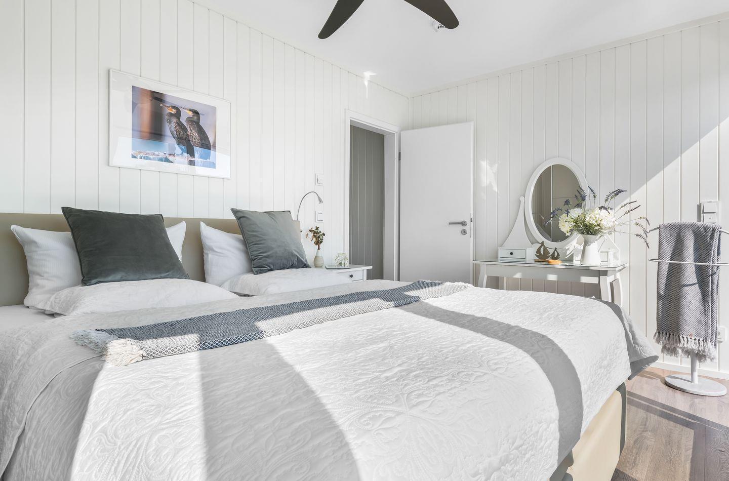 Entspannen Sie sich in der finnischen Sauna und profitieren Sie von der angenehmen Fußbodenheizung, die sich durch das gesamte Wasserhaus zieht. Im Erdgeschoss befindet sich der Schlafbereich mit einem Masterbedroom, der über ein Doppelbett und bodentiefe Panoramafenster verfügt, die direkten Zugang zur umlaufenden Terrasse bieten. Ein weiteres Schlafzimmer, mit zwei 90x200 Betten, befindet sich ebenfalls im Erdgeschoss.