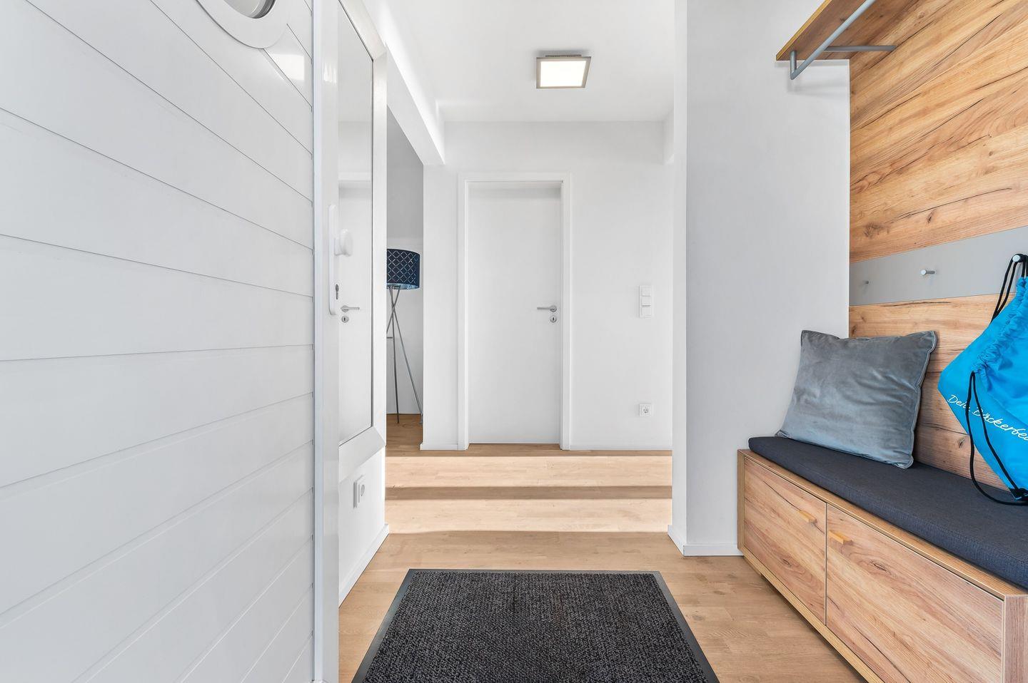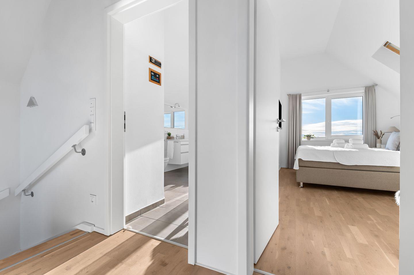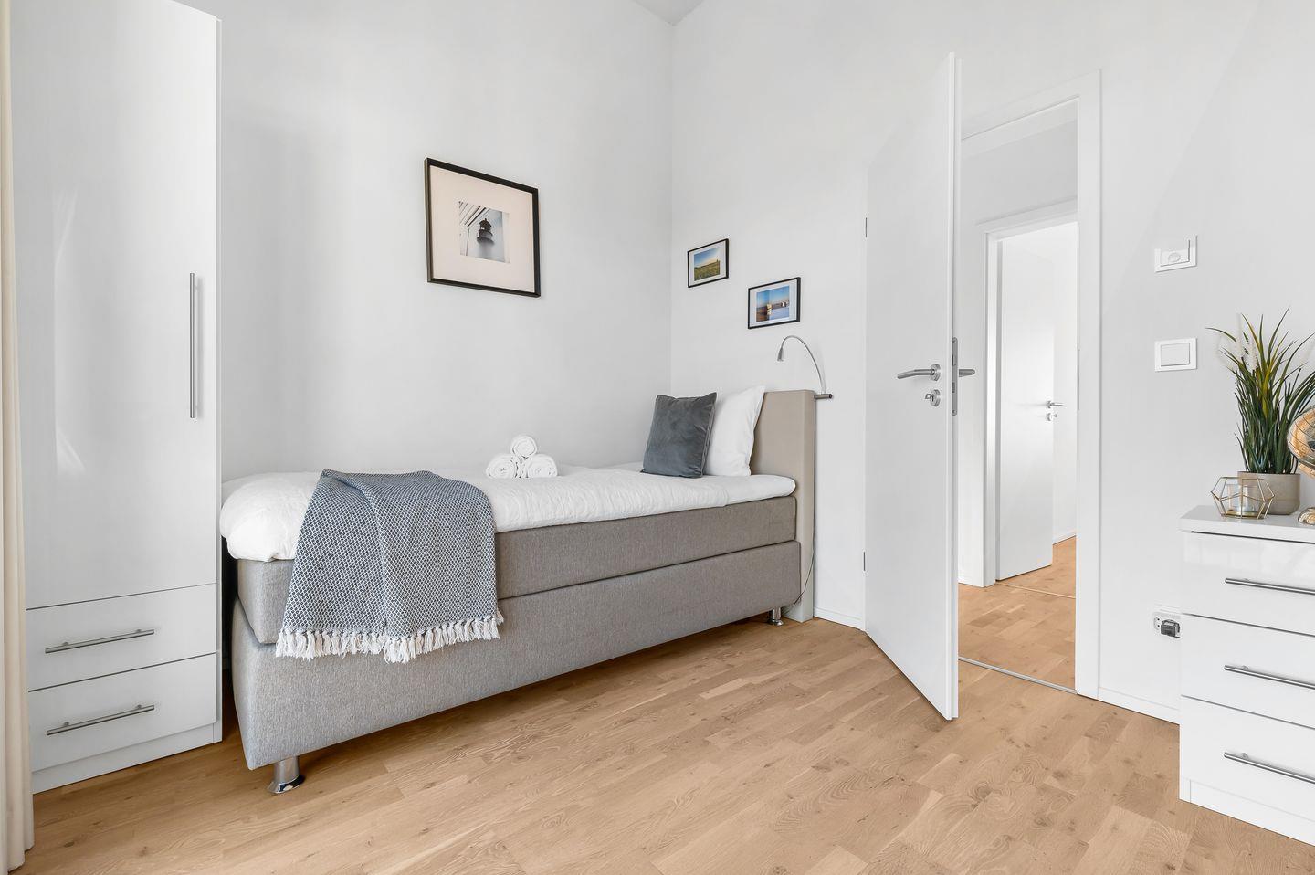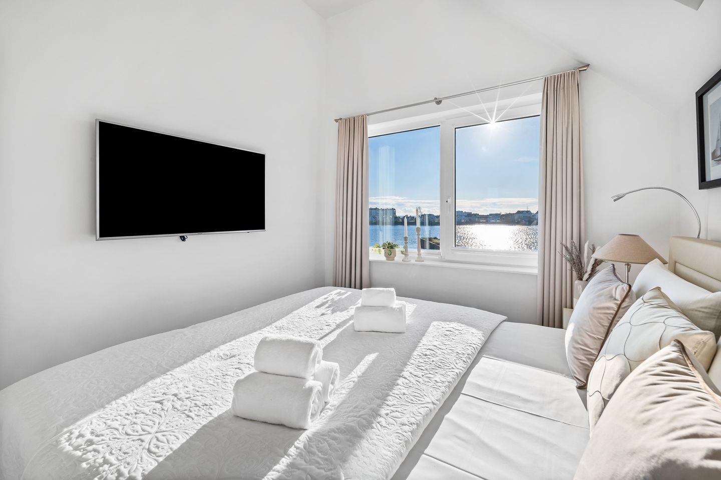 Die Ferienwohnung "Meeresflüstern" zeichnet sich durch eine durchdachte Raumaufteilung aus, die Privatsphäre und Gemeinschaft perfekt miteinander vereint. Im Dachgeschoss befinden sich zwei liebevoll gestaltete Schlafzimmer, die Wohlfühlmomente und entspannte Nächte garantieren. Das Hauptschlafzimmer mit einem komfortablen Doppelbett und Fernseher bietet einen traumhaften Blick über den Hafen und die vorbeiziehenden Segelboote. Das zweite Schlafzimmer ist mit zwei Einzelbetten ausgestattet, ideal für Freunde oder Kinder, und schaut auf die Schlei und Schleimünde.