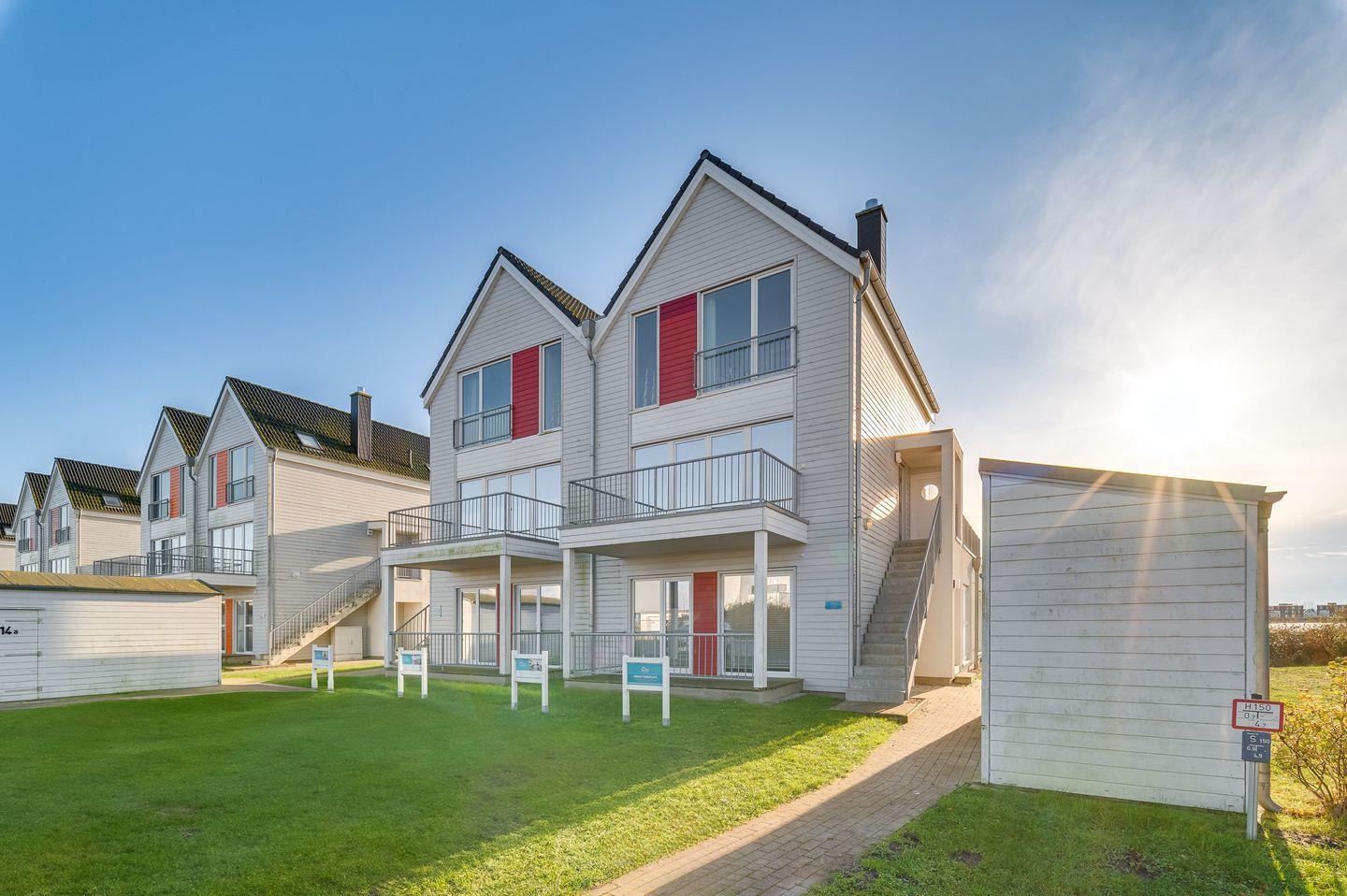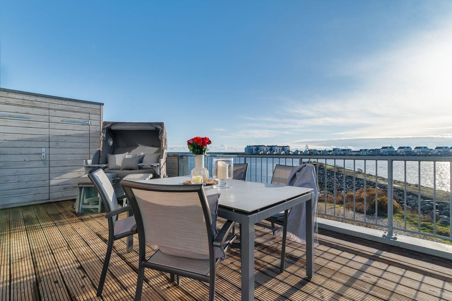 Die großzügige Terrasse im 1. Obergeschoss ist mit gemütlichen Gartenmöbeln und einem Grill ausgestattet. Sie bietet einen herrlichen Rahmen für Mahlzeiten im Freien oder einfach nur, um in der Sonne zu entspannen und die maritime Atmosphäre zu genießen.