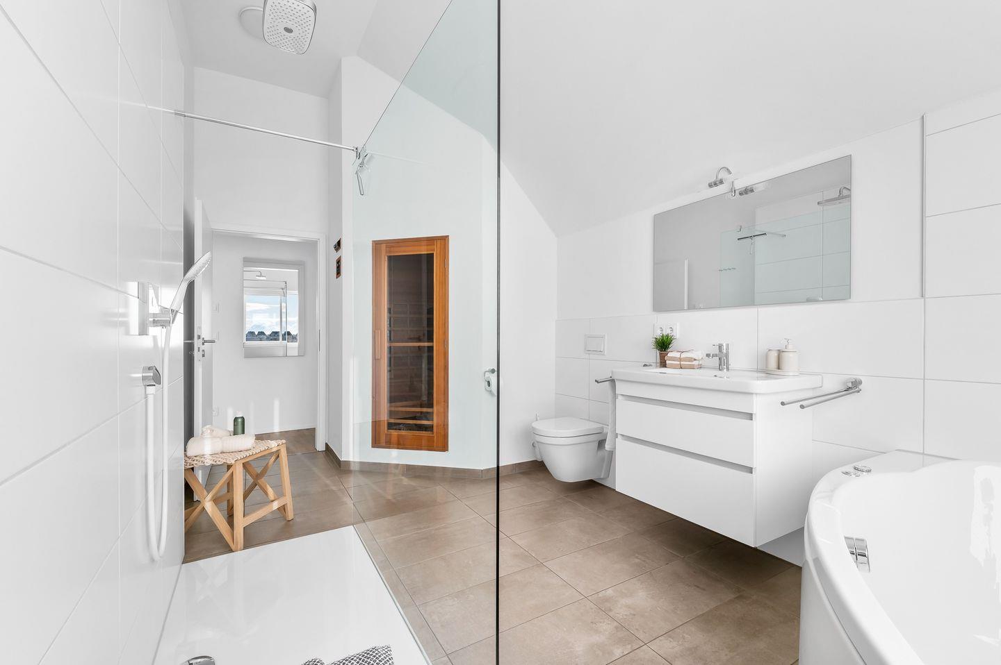 Ein Highlight der Ferienwohnung "Meeresflüstern" ist das luxuriöse Badezimmer im Obergeschoss, das keine Wünsche offenlässt. Neben einer modernen, ebenerdigen Regendusche verfügt es über eine Whirlwanne und eine private Sauna – perfekt, um nach einem langen Tag am Strand zu entspannen und neue Energie zu tanken.