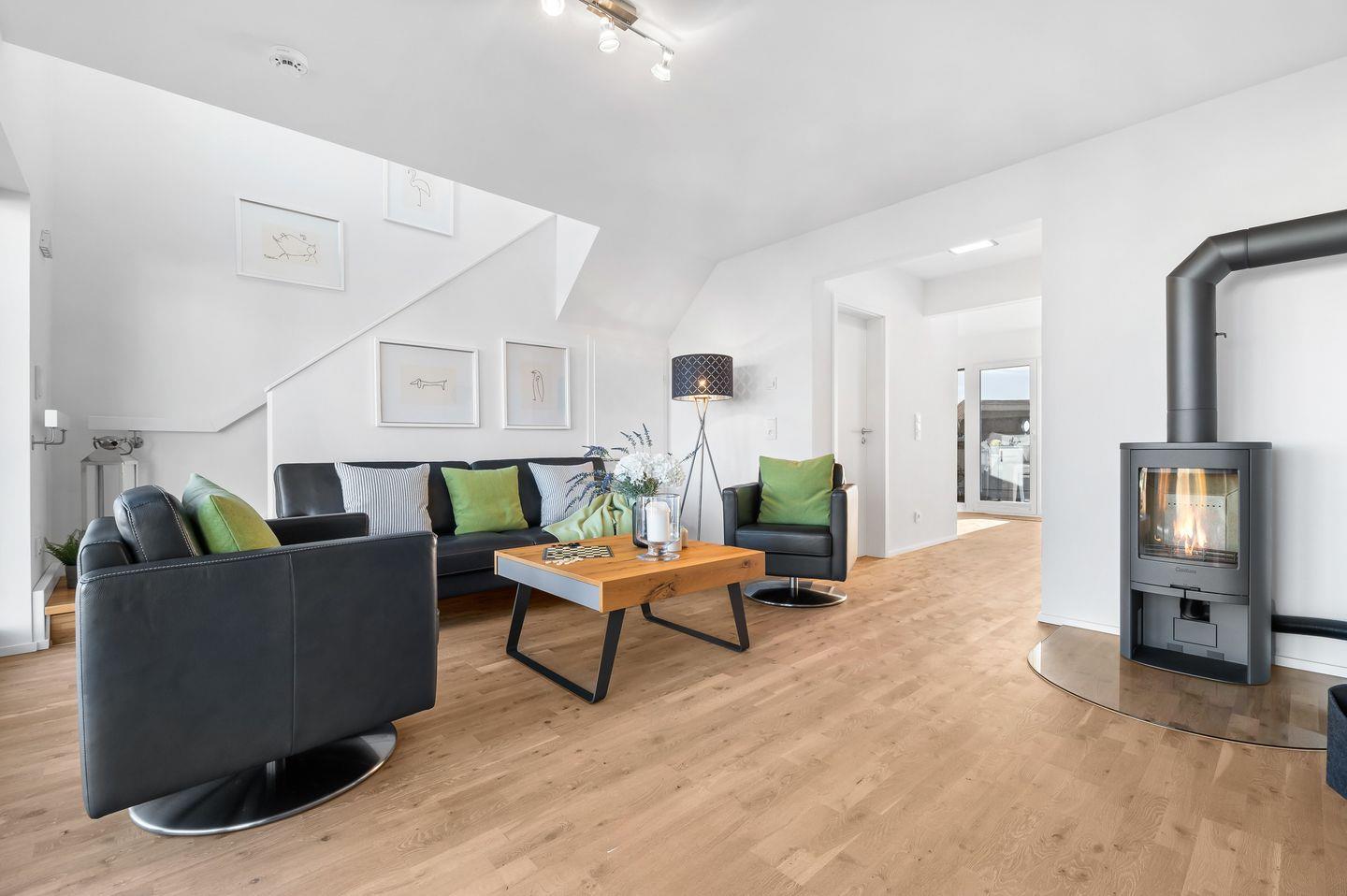 Der großzügige Wohn- und Essbereich im Erdgeschoss ist durch bodentiefe Panoramafenster gekennzeichnet, die den Raum mit natürlichem Licht durchfluten und einen atemberaubenden Blick auf das Wasser ermöglichen. Die voll ausgestattete Küche mit hochwertigen Geräten lädt zu geselligen Kochabenden ein. Eine Fußbodenheizung sorgt auch an kühleren Tagen für angenehme Wärme.