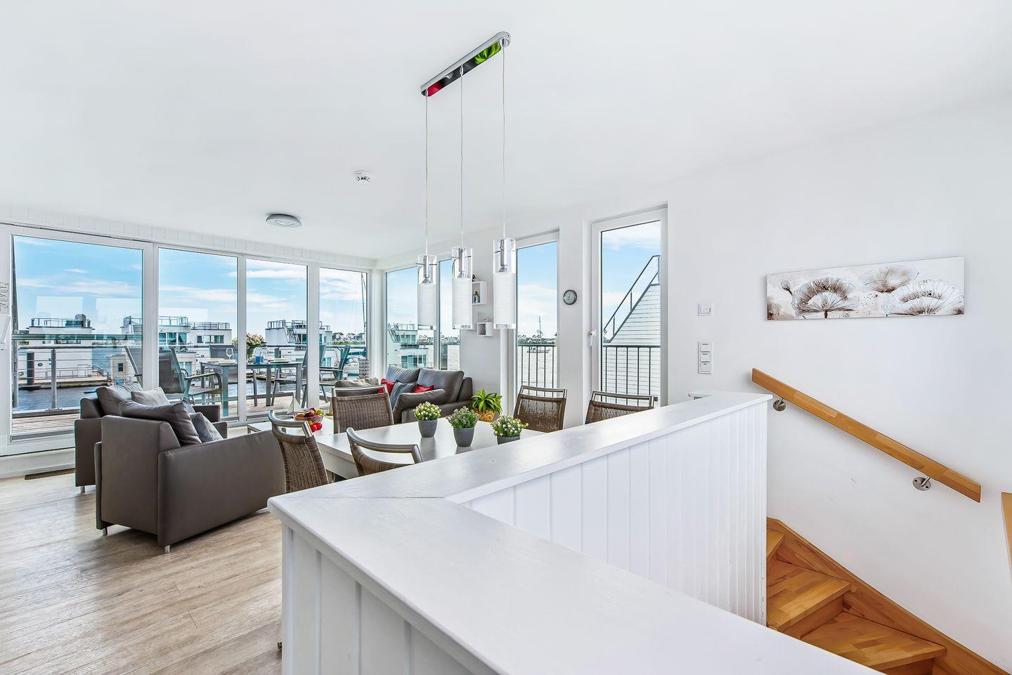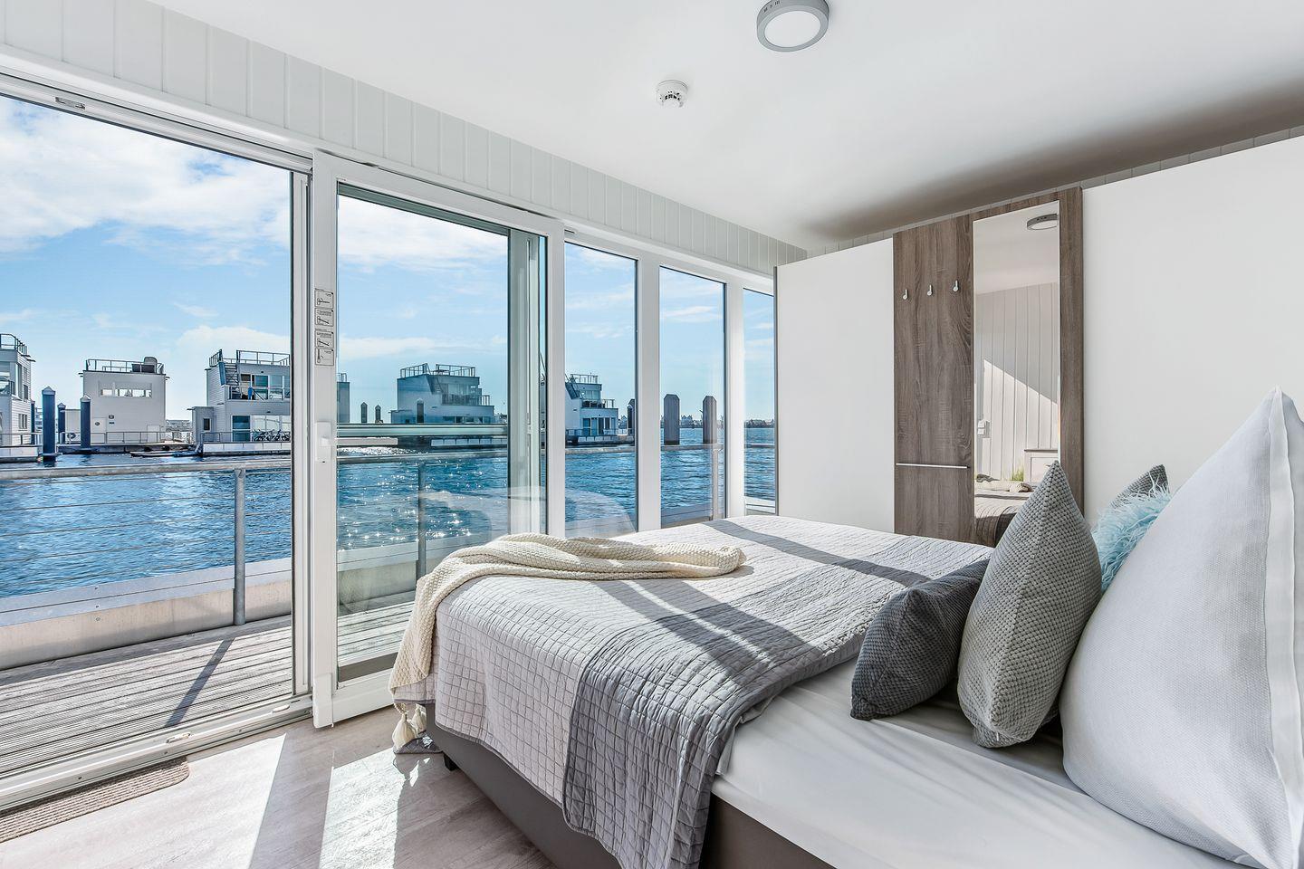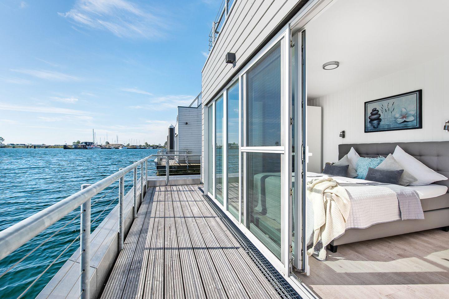 Dieses freistehende schwimmende Haus bietet auf großzügigen 97m² Platz für bis zu vier Personen. Die exzellente Lage direkt im Hafenbecken des Ostseeresorts macht es zu einem perfekten Ausgangspunkt für Ihre Aktivitäten am Meer. Das Ferienhaus verfügt über zwei einladende Schlafzimmer, wobei das Hauptschlafzimmer mit Doppelbett direkten Zugang zu einer der drei Terrassen bietet. Das Badezimmer ist mit einer bodengleichen Dusche ausgestattet und verfügt über alle Annehmlichkeiten, die Sie für eine erfrischende Auszeit benötigen. Ein Highlight ist auch die finnische Sauna, in der Sie mit Blick auf das Wasser nach einem Strandtag entspannen können. Die helle und freundliche Atmosphäre wird durch die offene Küche, die sich nahtlos in den Essbereich und das Wohnzimmer einfügt, verstärkt. Die moderne Küchenausstattung lässt keine Wünsche offen: Ein Herd, Backofen, Kühlschrank, Mikrowelle, Geschirrspüler und Kaffeemaschinen sorgen dafür, dass Sie all Ihre Kochvorhaben mit Leichtigkeit umsetzen können. Die gemütliche Sitzecke im Wohnzimmer lädt zum Entspannen ein, während der Smart-TV auch bei nordischem Schietwetter für Unterhaltung sorgt. Bei Bedarf lässt sich das Sofa zu einem weiteren Schlafplatz für bis zu zwei Kinder ausziehen. Ein wunderschöner Blick auf das Meer, den Hafen und die Schlei ist ein herausragendes Merkmal des Ferienhauses. Genießen Sie Ihren Kaffee in der Morgensonne oder lassen Sie den Abend mit einem Glas Wein auf der eigenen Dachterrasse ausklingen. Am Anfang des Steges stehen Ihnen zwei Parkplätze zur Verfügung. Für die Anreise mit dem Boot befindet sich direkt am Haus ein eigener Bootsliegeplatz. In der näheren Umgebung finden Sie Einkaufsmöglichkeiten, Restaurants und zahlreiche Freizeitaktivitäten. Von Wandern über Radfahren bis hin zu Wassersport ist für jeden etwas dabei. Bei einem Strandspaziergang können Sie die frische Meeresluft genießen oder sich in einem der zahlreichen Restaurants der Region kulinarisch verwöhnen lassen. Die herrliche Natur rund um Olpenitz ist zu jeder Jahreszeit einen Ausflug wert.