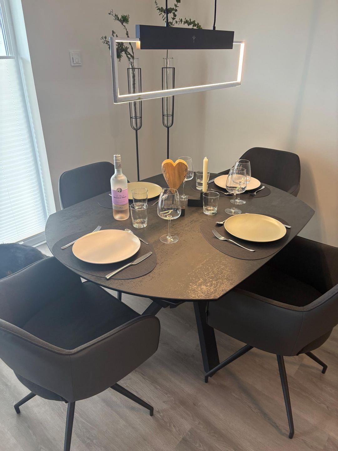 Die moderne, offene Küche mit Induktions-Herd, großem Kühlschrank, leiser Geschirrspülmaschine, Espresso- und Kaffeemaschine sowie Mikrowelle und kompletter Küchenutensilien-Ausstattung macht das Kochen zum Erlebnis. Ein ausziehbarer Esstisch bietet Platz für gemeinsame Mahlzeiten – perfekt für Genussurlaub oder kulinarische Abende.