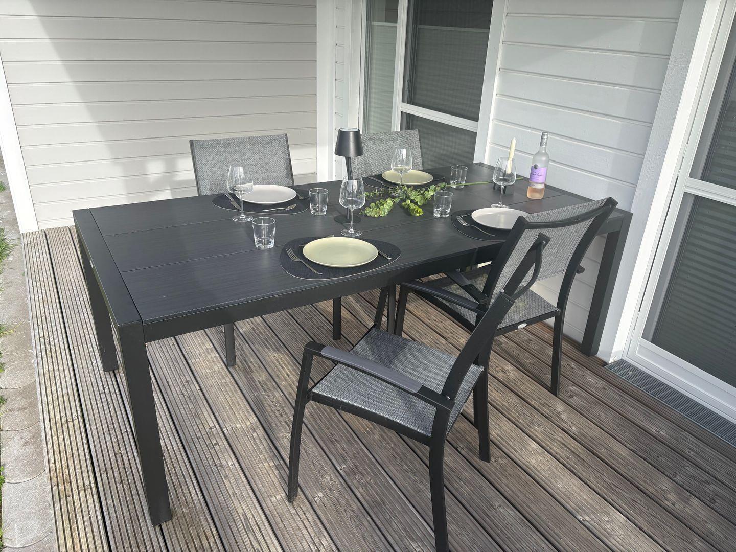 Die eigenen zwei Terrassen mit bequemen Gartenmöbeln und Loungebereich, einer Rasenfläche und einem großen Weber Lunim Elektrogrill lädt zum Verweilen ein – ob für Grillabende, Gemüse garen oder Fisch räuchern oder einfach nur die Sonne genießen.