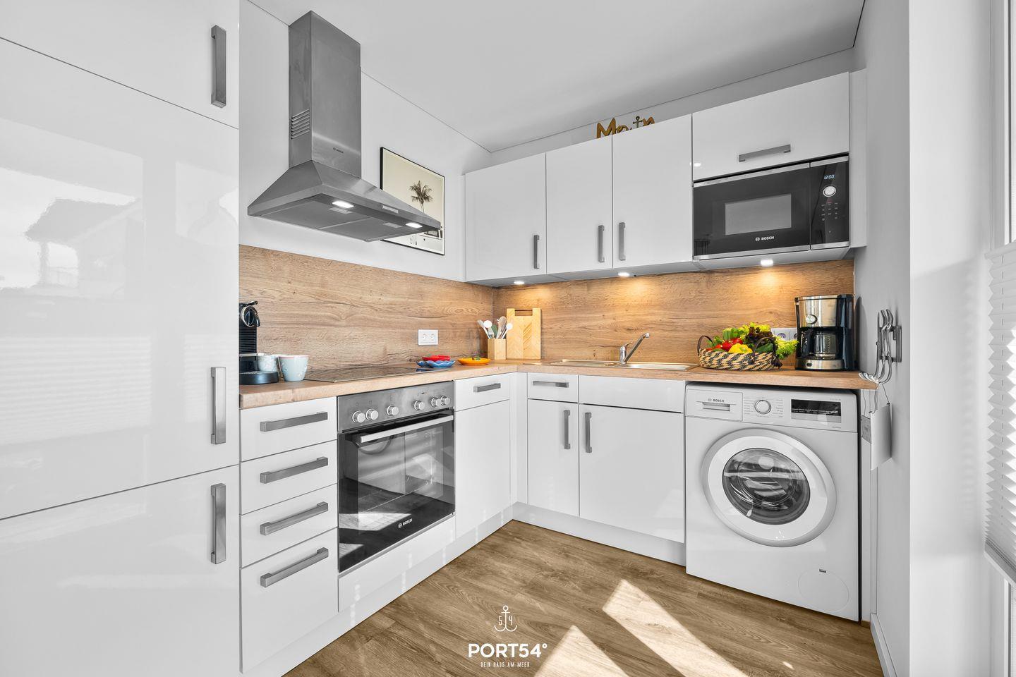 Das moderne Badezimmer verfügt über eine bodengleiche Dusche, Waschbecken, WC, Ganzkörperspiegel, Kosmetikspiegel und Haartrockner. Als weiteres Highlight gibt es zusätzlich eine private Infrarotkabine – perfekte Voraussetzungen für entspannte Wellnessmomente nach einem Tag am Strand. In sämtlichen Wohnräumen sorgt Fußbodenheizung für angenehme Temperaturen. Ergänzt wird die Ausstattung durch eine eigene Waschmaschine, Bügeleisen, Bügelbrett, Staubsauger und Wäscheständer, sodass Ihnen auch bei längeren Aufenthalten ein Maximum an Komfort geboten wird.