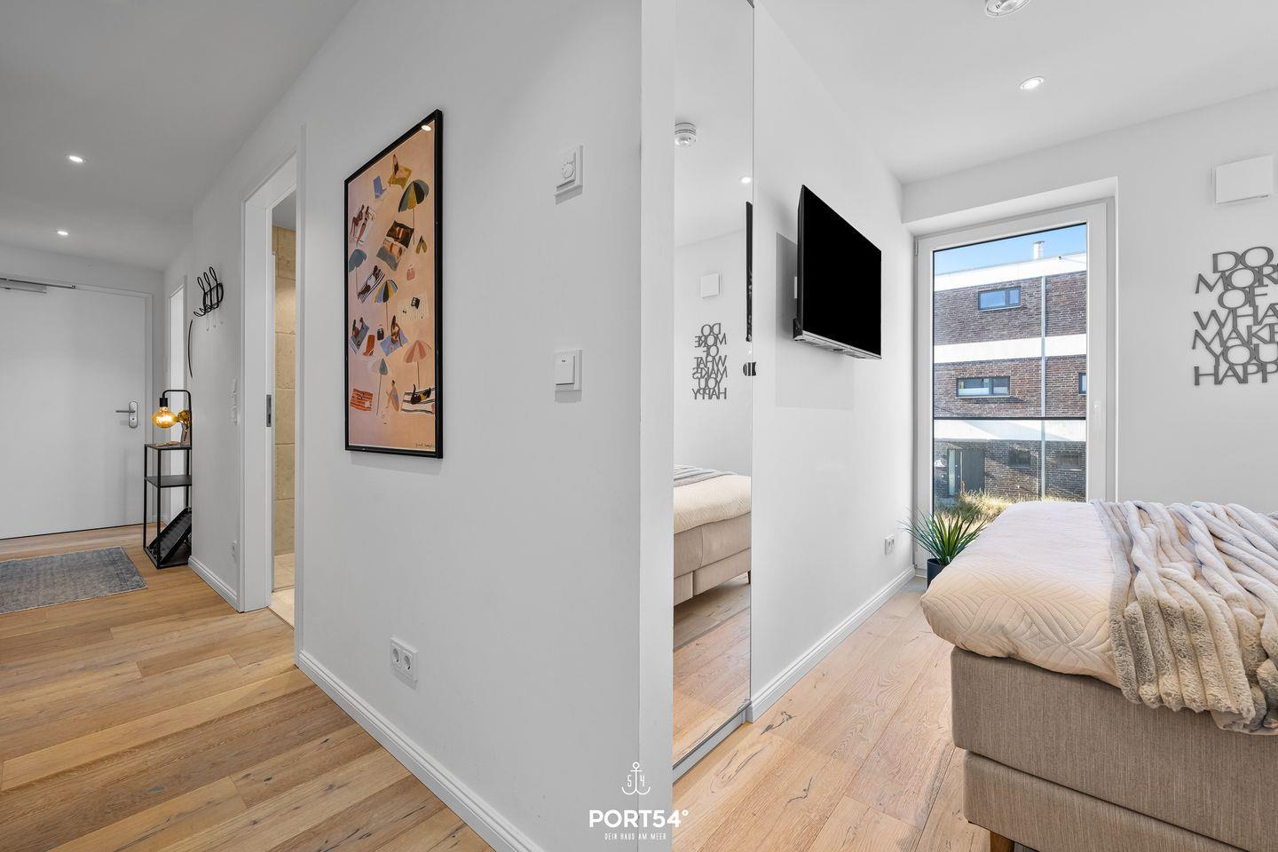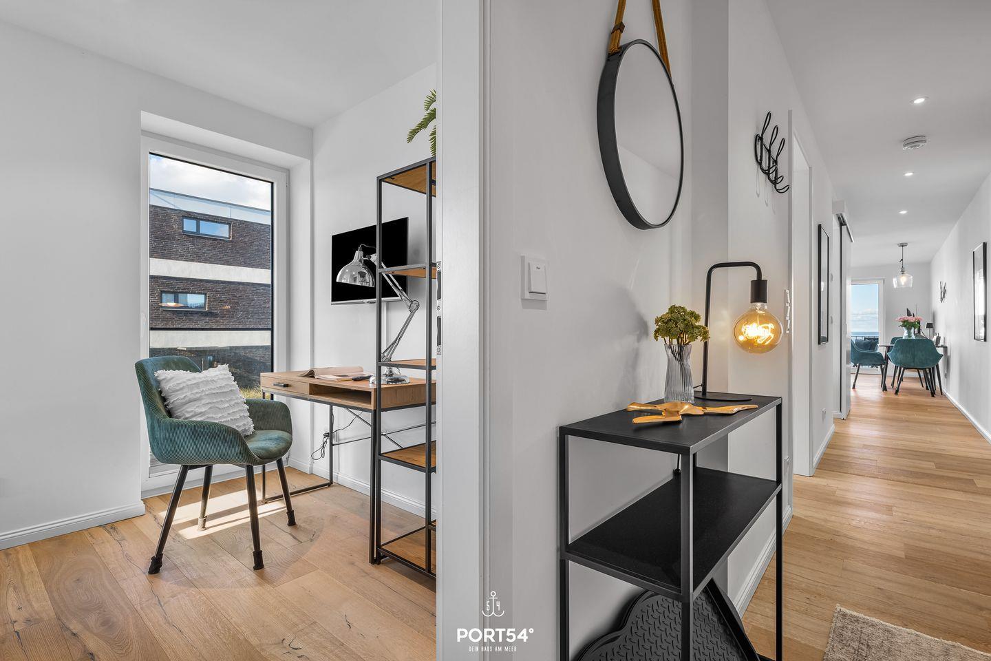 Für eine erholsame Nachtruhe sorgen die beiden Schlafbereiche, die in dieser Wohnung mit besonderem Augenmerk auf Komfort und Design gestaltet wurden. Das Schlafzimmer mit Doppelbett (Boxspringbett) verspricht himmlische Nächte, während das zweite Schlafzimmer mit Einzelbett ebenfalls über einen eigenen TV verfügt – perfekt, um nach einem Tag voller Abenteuer zu entspannen. Für Gäste, die auch im Urlaub ein wenig arbeiten möchten, steht ein praktischer Schreibtisch bereit, der es Ihnen ermöglicht, Ihre Aufgaben bequem zu erledigen, während Sie den Blick auf die Ostsee genießen.