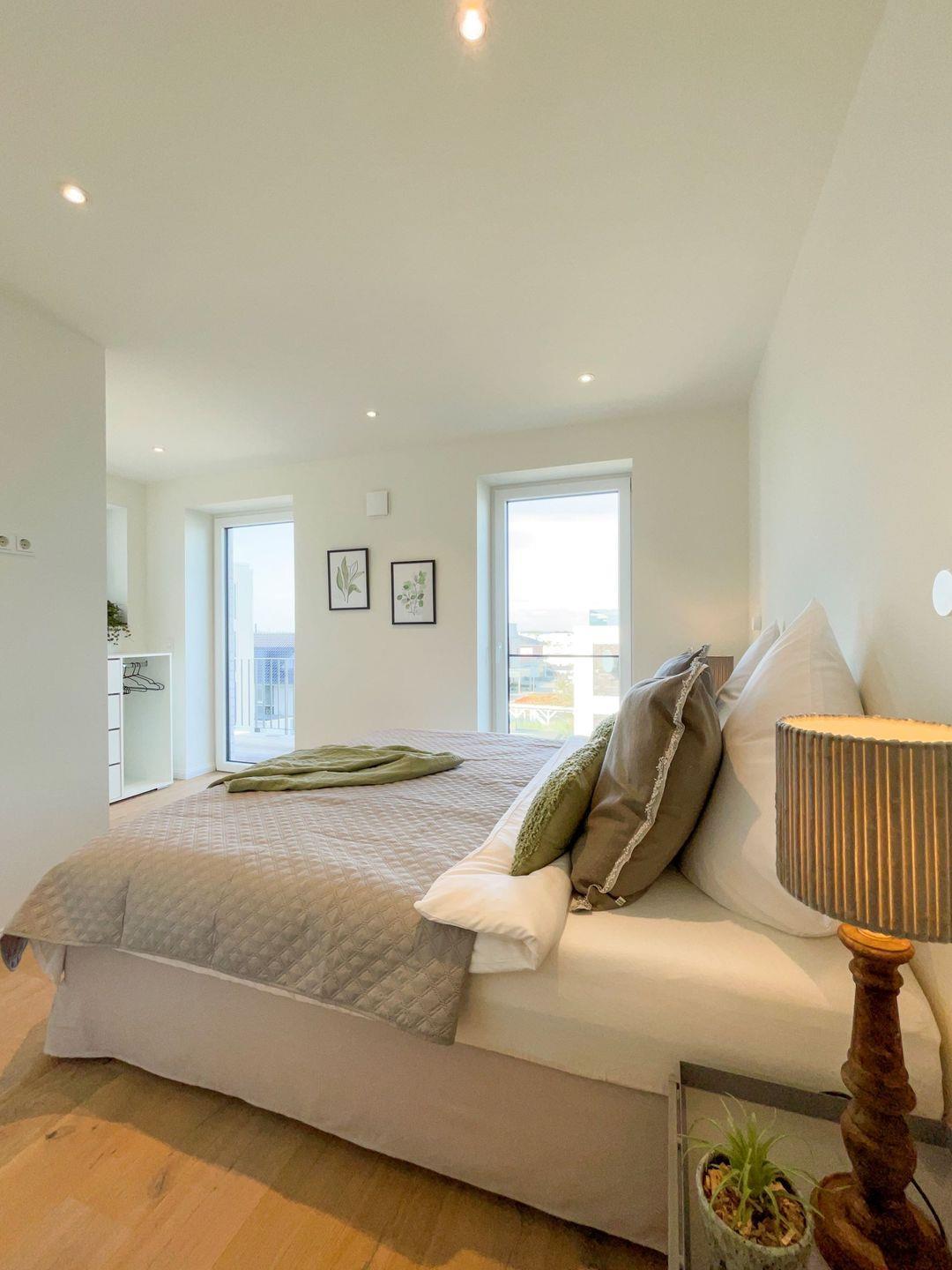 Drei wunderschöne Schlafzimmer garantieren Ihnen einen erholsamen Schlaf. Zwei Zimmer sind mit komfortablen Doppel-Boxspringbetten ausgestattet, die nicht nur für himmlischen Komfort sorgen, sondern auch mit Smart-TVs für Unterhaltung während Ihres Aufenthalts. Das dritte Schlafzimmer bietet ein kleineres Boxspringbett und ebenfalls einen TV – ideal für Kinder oder Gäste, die eine ruhige Ecke suchen. Jede Schlafstätte ist durchdacht eingerichtet: Moderne, offene Kleiderschränke bieten ausreichend Stauraum für Ihre Kleidung, und die Plissees sorgen für den gewünschten Sichtschutz und Privatsphäre.