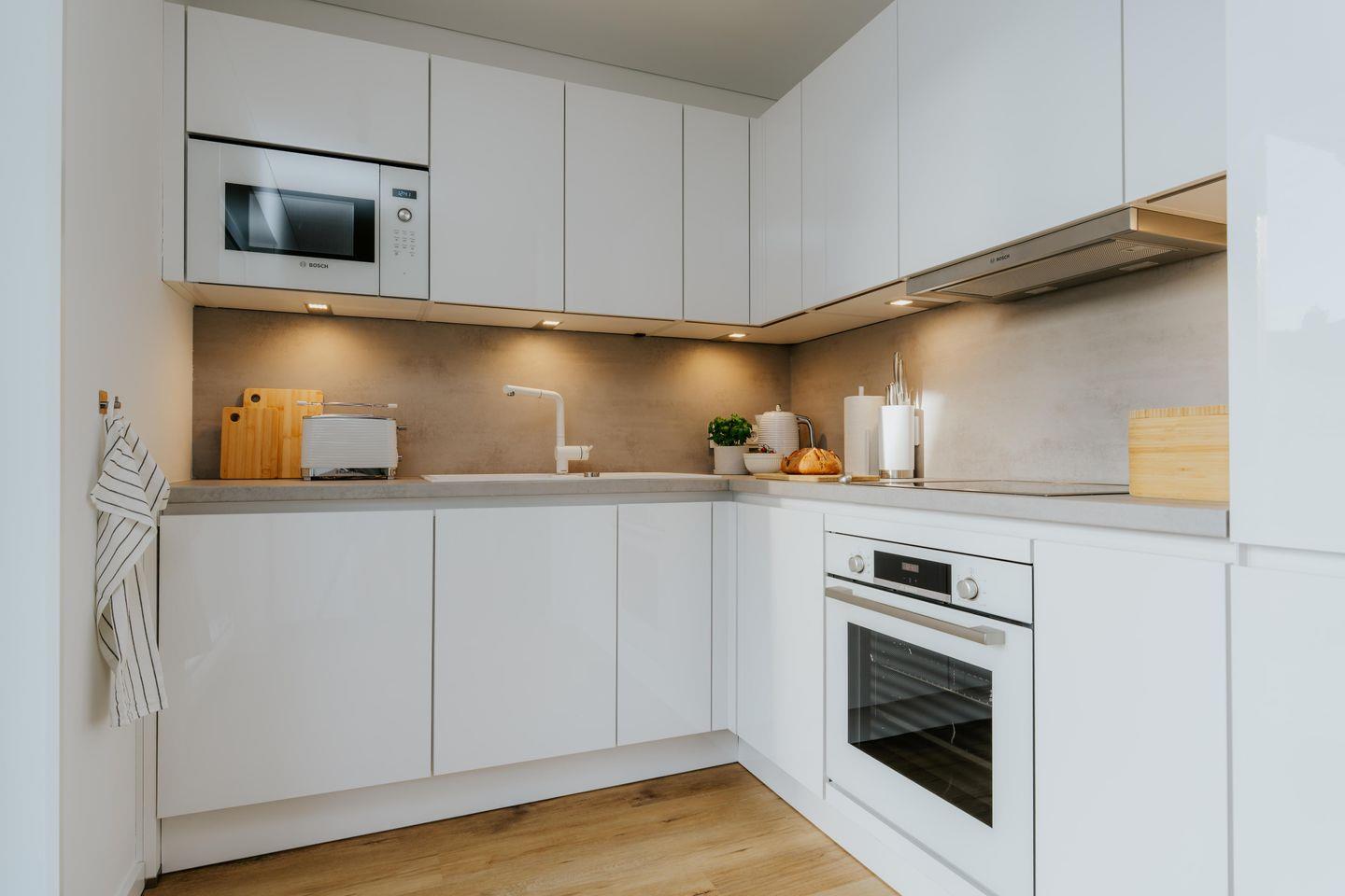 Die offene, voll ausgestattete Küche überzeugt mit eleganten, grifflosen Fronten, großzügigem Stauraum und modernen Geräten – darunter Backofen, Cerankochfeld, Mikrowelle, Spülmaschine, Nespresso-Maschine, Filterkaffeemaschine, Wasserkocher, Toaster und mehr. Am ausziehbaren Esstisch genießt ihr gemeinsame Essenzeiten mit Blick ins Grüne – oder lasst den Abend ganz entspannt ausklingen.