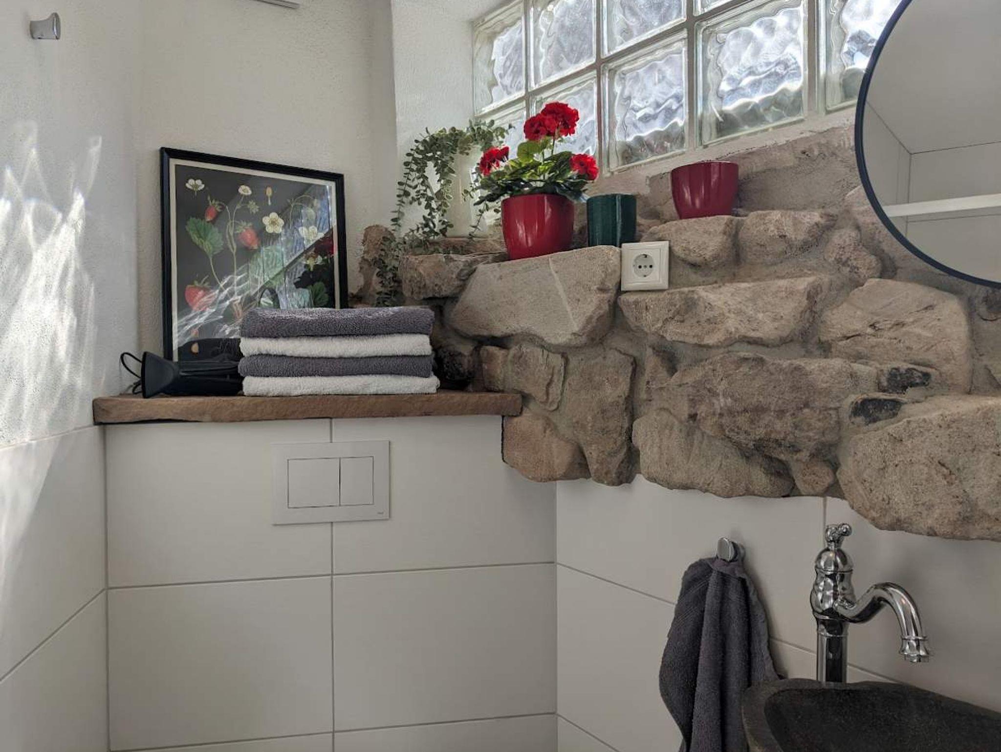 Dusche, WC und Waschbecken sind neben dem Gemeinschaftsraum, Hand-/ Duschtücher und Fön sind vorhanden.