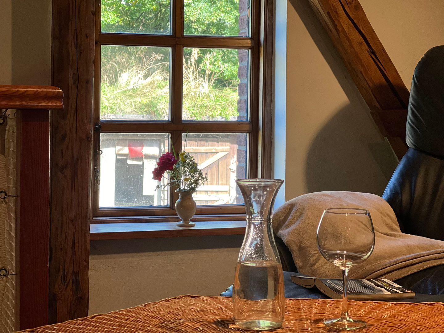 Im Untergeschoss des Hauses befindet sich der gesellige und große Gemeinschaftsraum, bestehend aus Essbereich, Küche, Wohnzimmer und Tischkicker-Ecke. Die zahlreichen bodentiefen Fenster lassen viel Licht in den Raum und erfreuen mit dem Blick auf die süßen Islandpferde und die andern Tiere des Hofes.