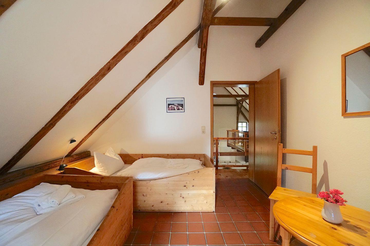 Im Obergeschoss hält die Galerie einen weiteren kleinen Ruhe/Sofabereich vor und zwei der drei Schlafzimmer befinden sich dort. Diese sind liebevoll und nachhaltig eingerichtet und bieten sich optimal an für einen erholsamen Schlaf.