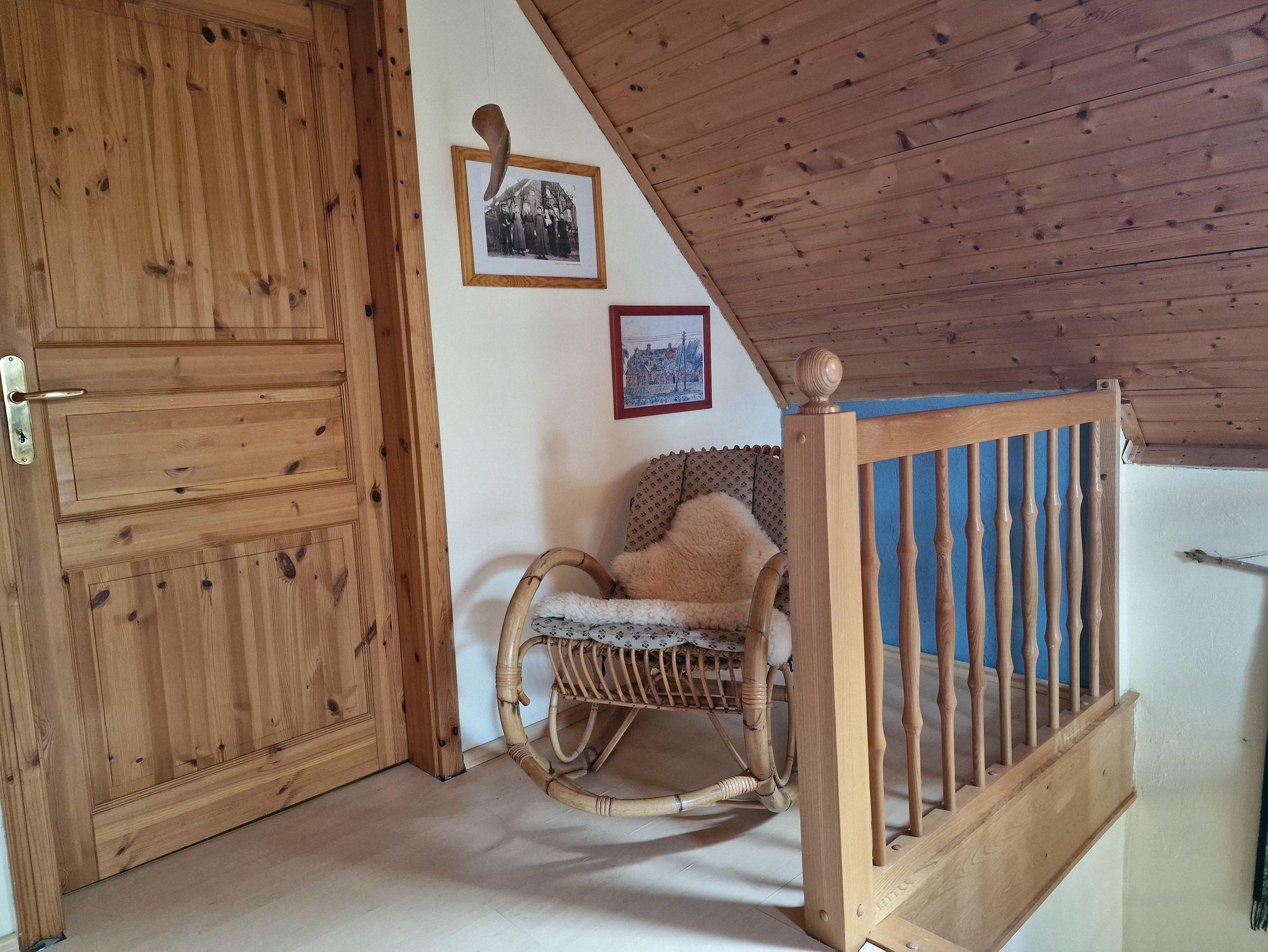 Das großzügige Esszimmer ist mit einem Esstisch mit 4 Stühlen, einer weiteren Sitzecke, Schränken und Regalen ausgestattet. In der oberen Etage befindet sich ein Schlafzimmer mit Doppelbett und zwei Nachtschränken, einem Kleiderschrank, einer Truhe und einem großem Spiegel.