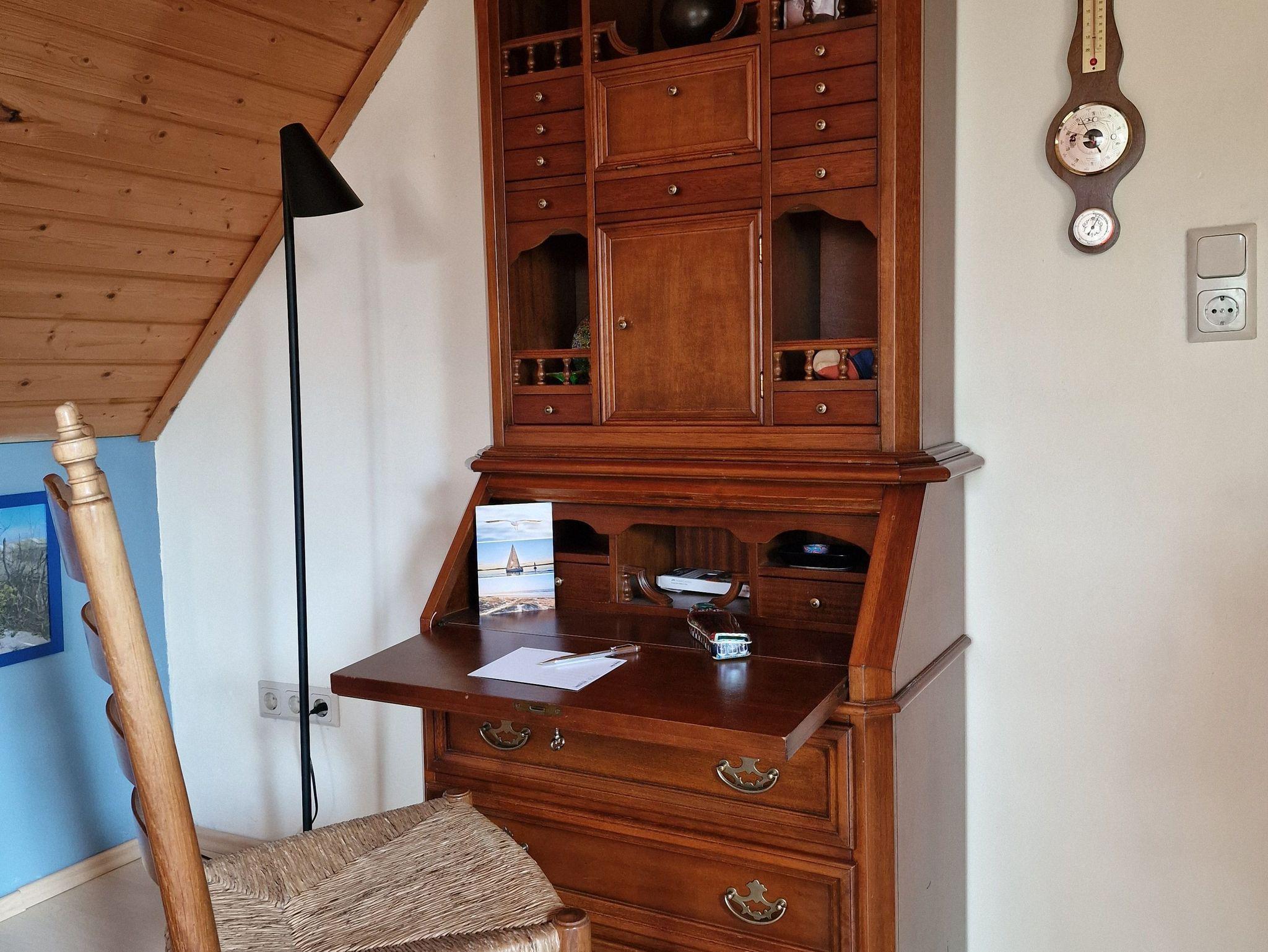 Das Wohnzimmer enthält ein Sofa (umwandelbar zum Schlafsofa), zwei Sessel, einen Couchtisch, eine TV Bank mit Fernseher, einen Schaukelstuhl, einen Schreibsekretär mit Stuhl.