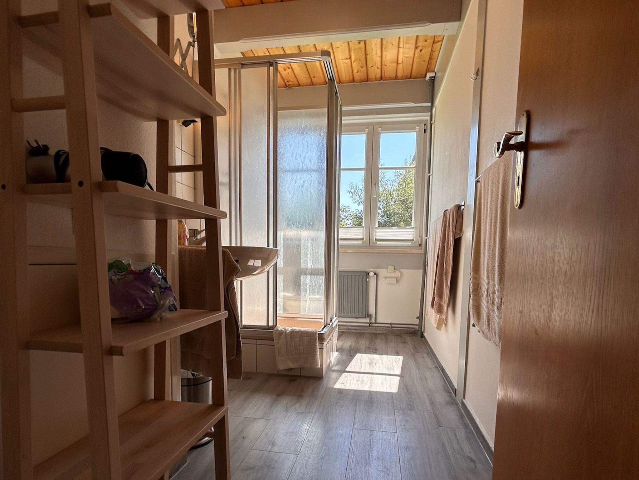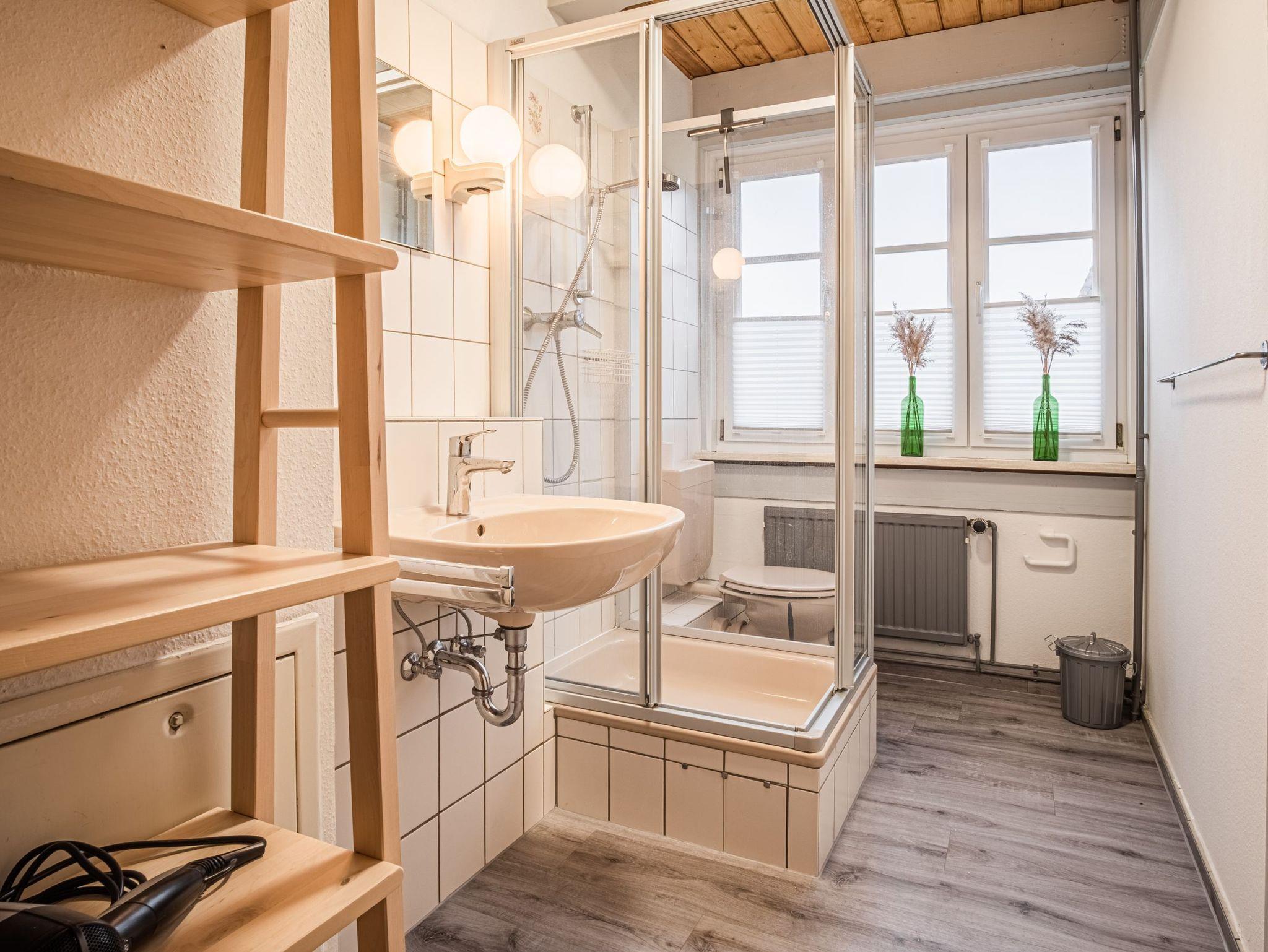 Im Badezimmer gibt es eine Dusche, ein WC und ein Fön.