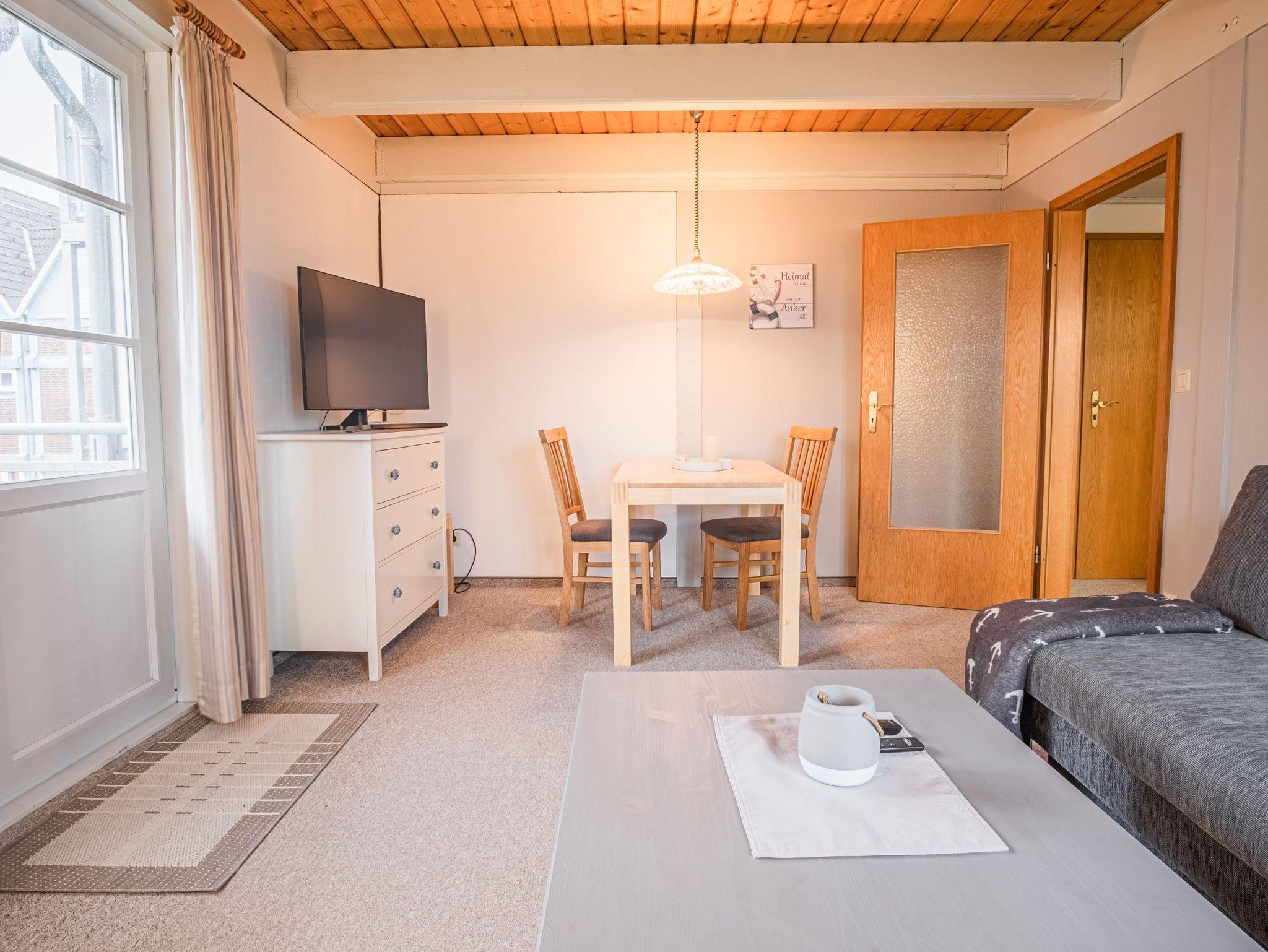 Im Wohnraum befindet sich die Schlafcouch (Platz für 2 Personen), ein Esstisch sowie ein Fernseher mit SAT-Anschluss.