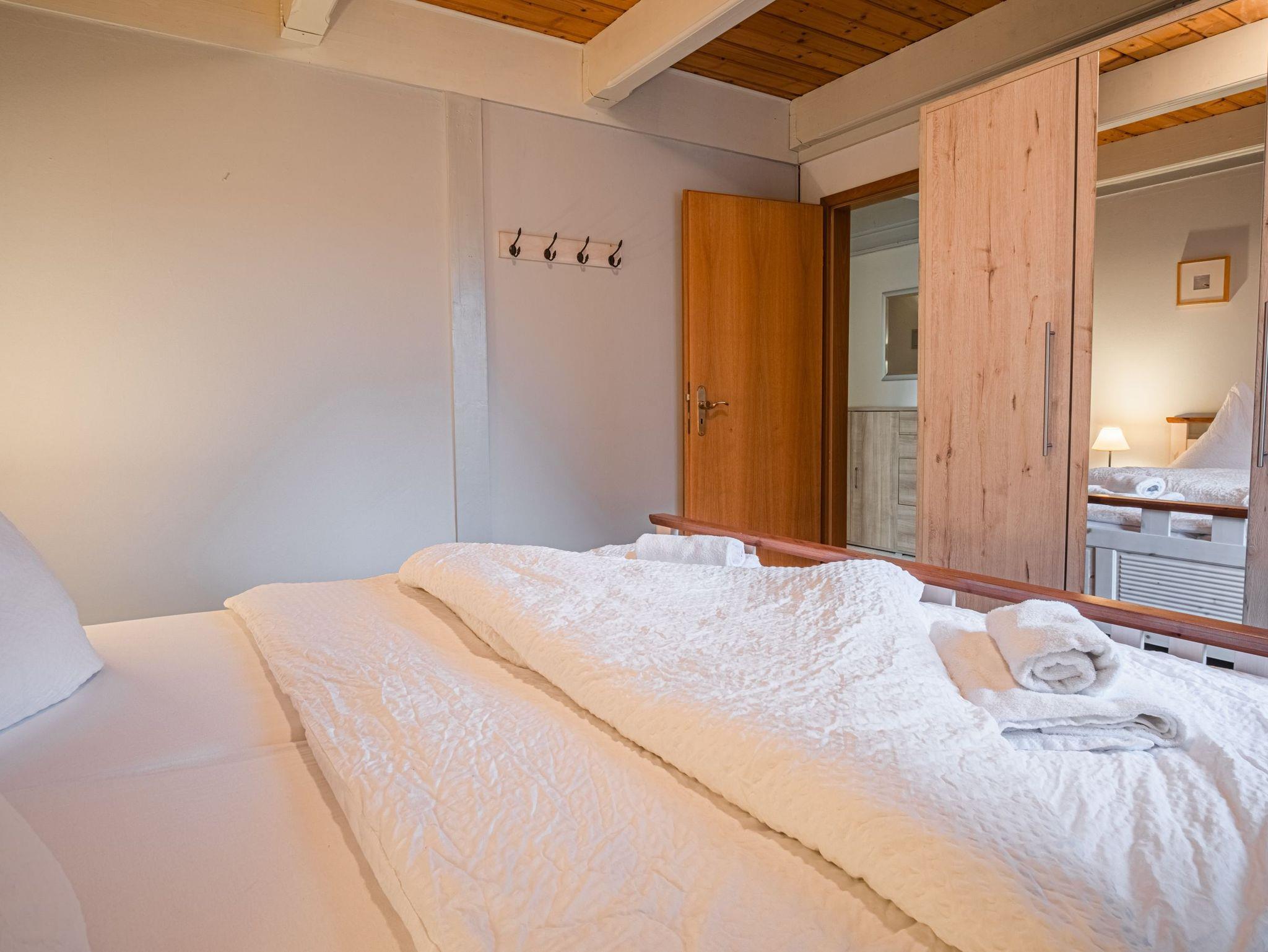 Im Schlafzimmer befindet sich ein Doppelbett und Kleiderschrank. Ein Babybett kann auf Anfrage zusätzlich gestellt werden.
