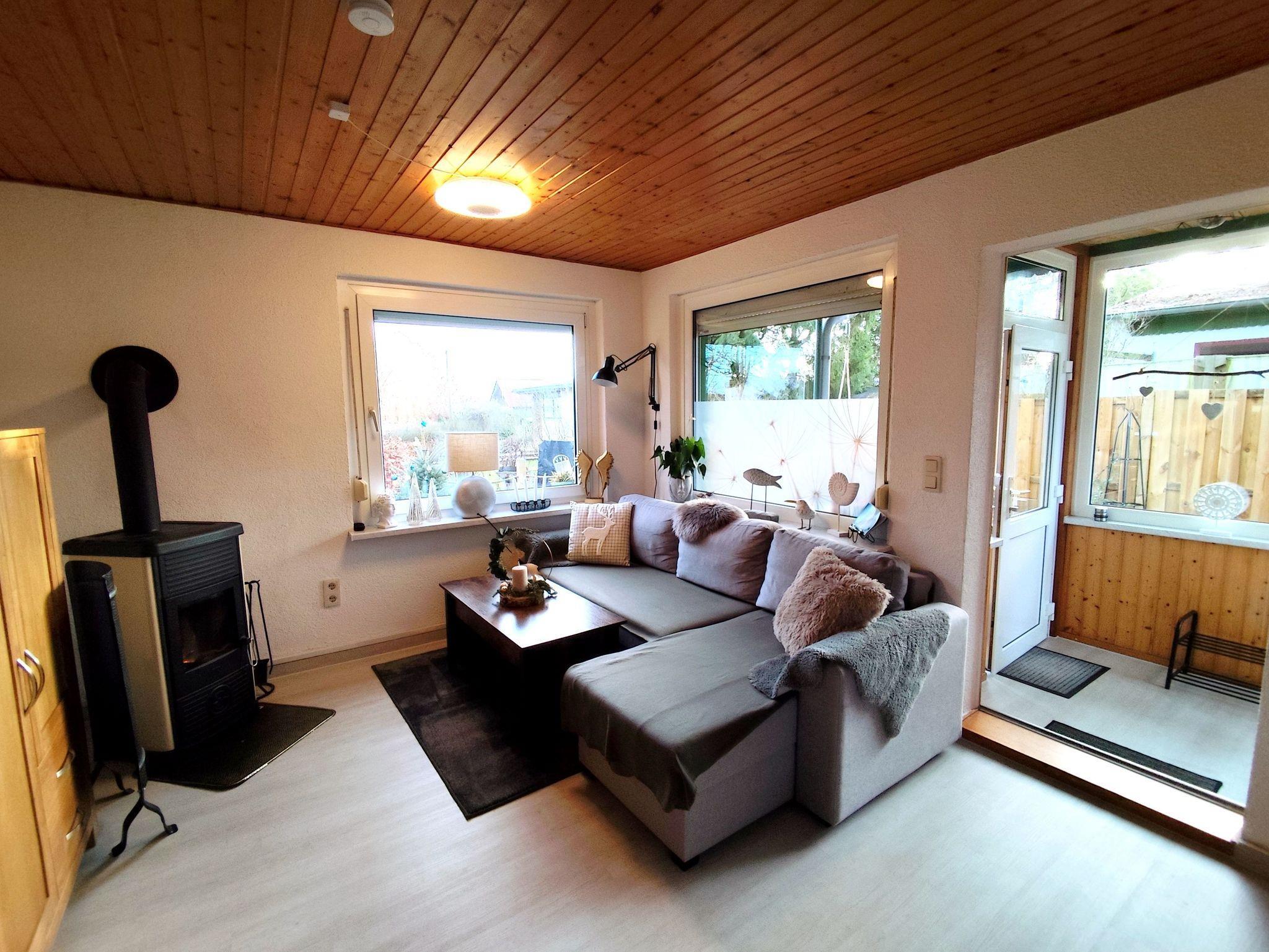 Ferienhaus mit Wohnzimmer, Kamin und offener Küche, 2 Schlafzimmer (1 Durchgangsschlafzimmer), Duschbad, Wintergarten, Terrasse und großer eingezäunter Garten