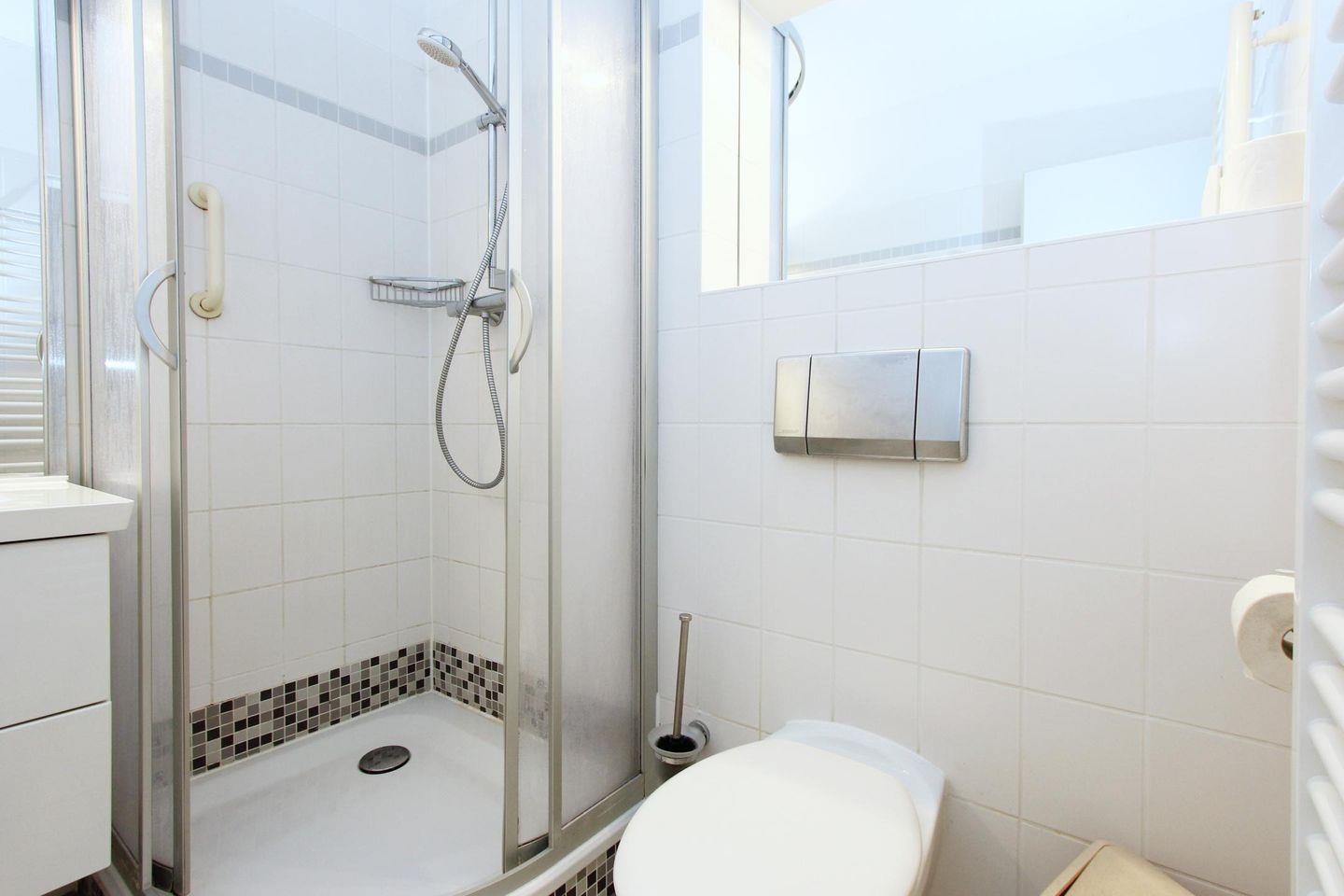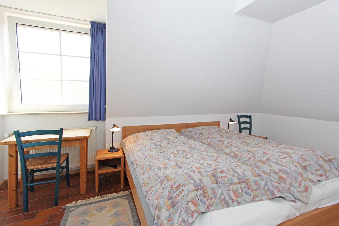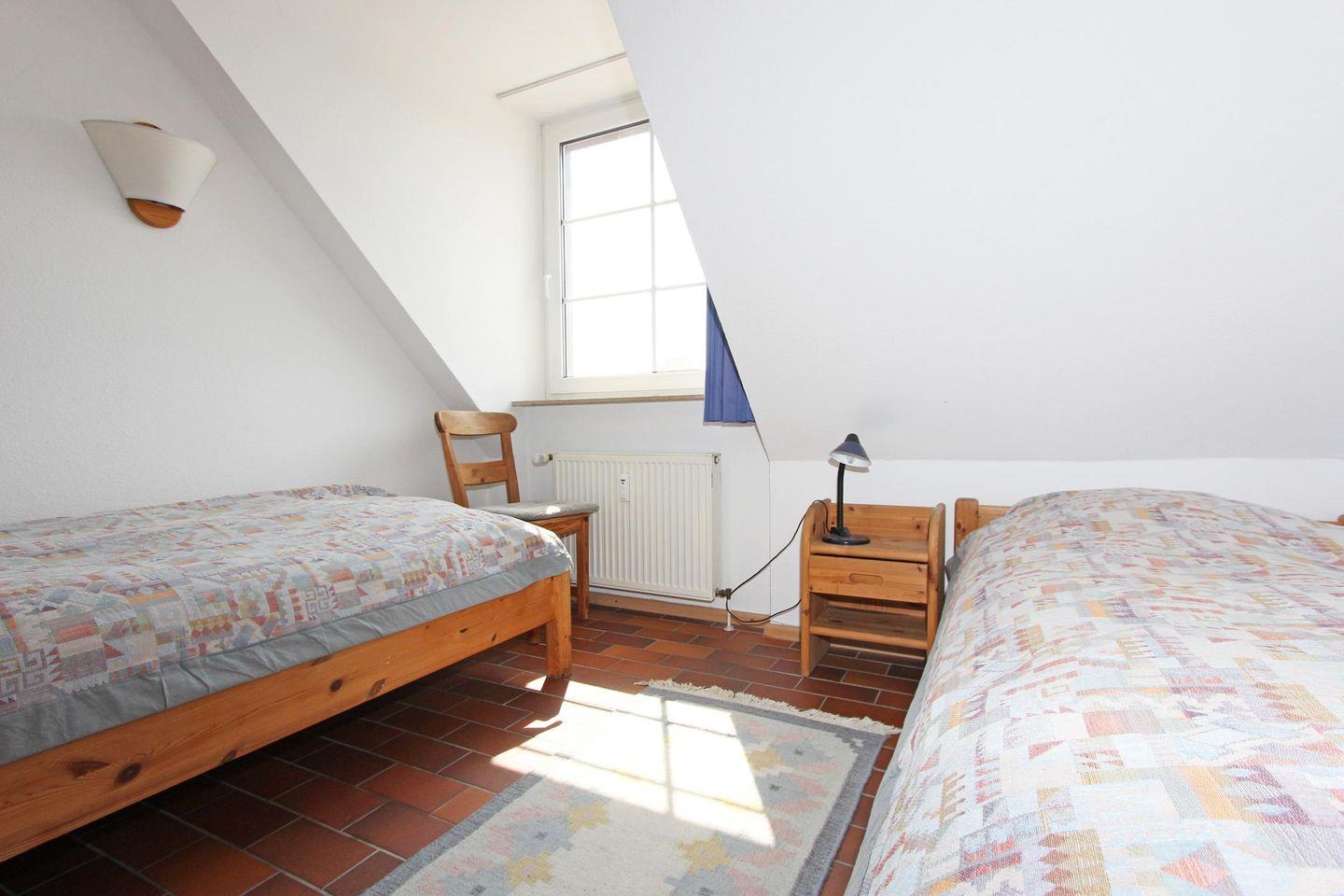 Im hellen Dachgeschoss der Wohnung befinden sich die zwei Schlafzimmer mit je einem Doppelbett und zwei Einzelbetten. Auf dieser Ebene befindet sich auch das zweite Duschbad mit WC.