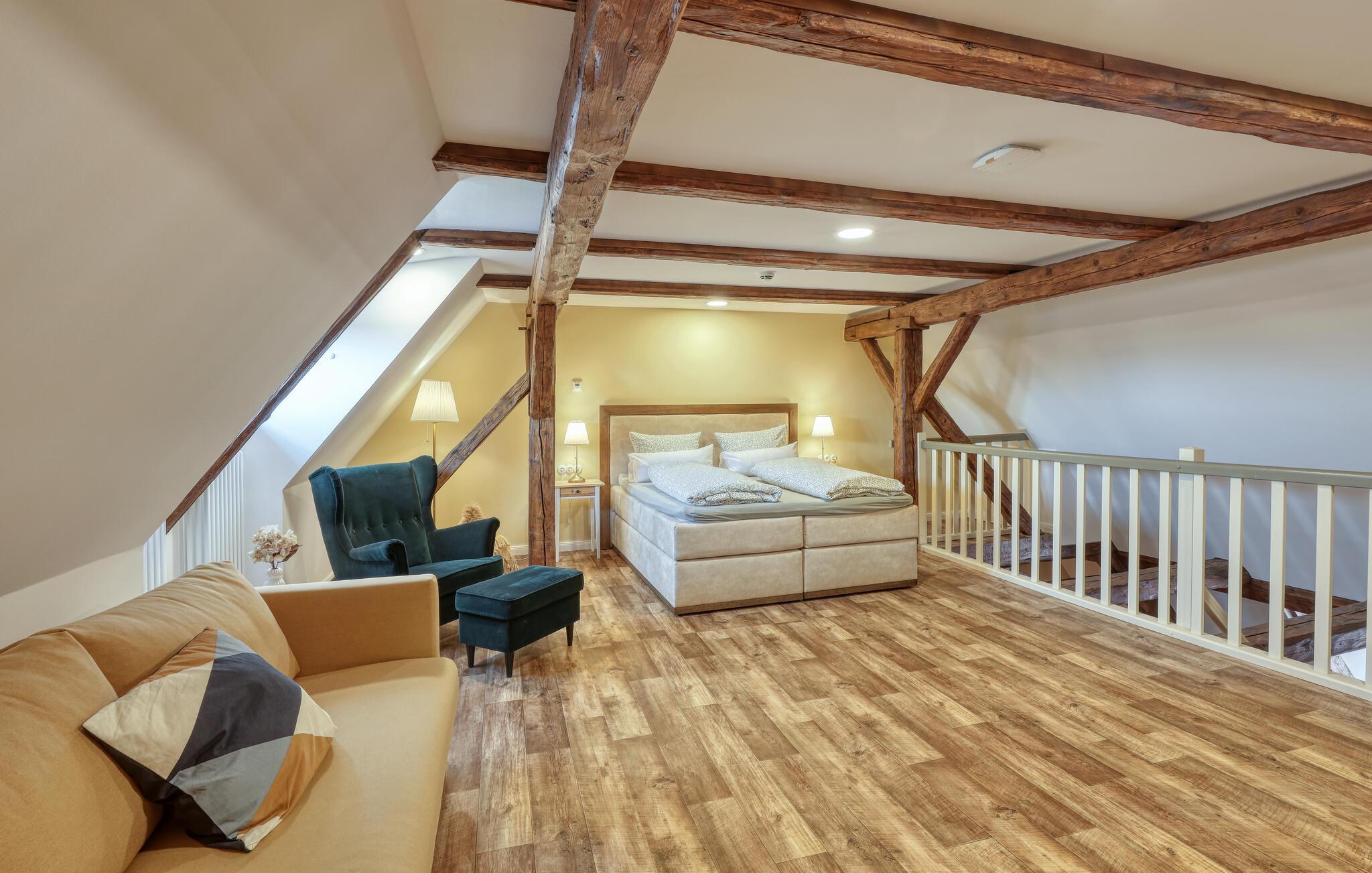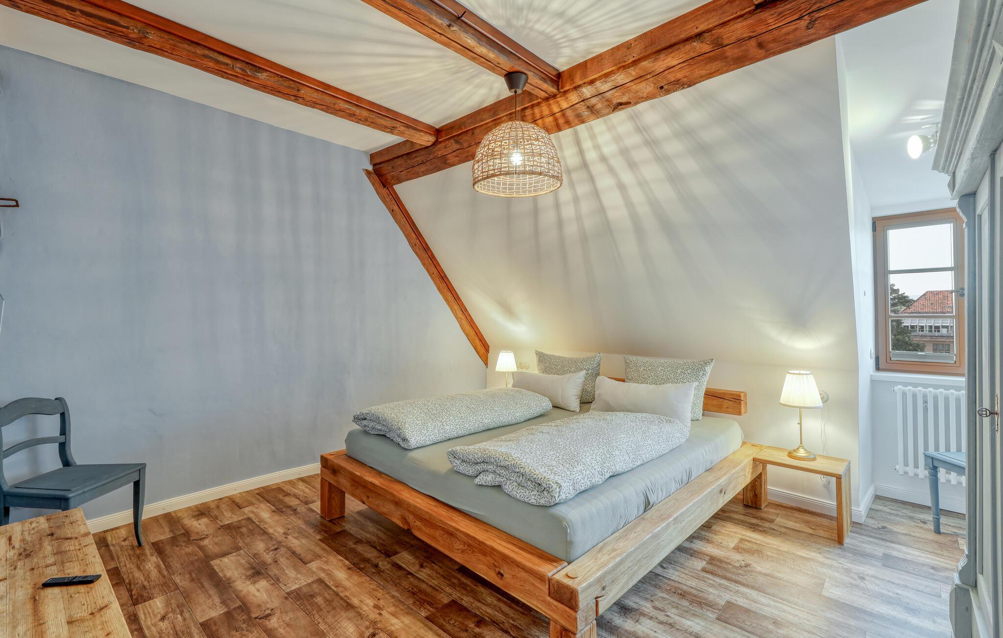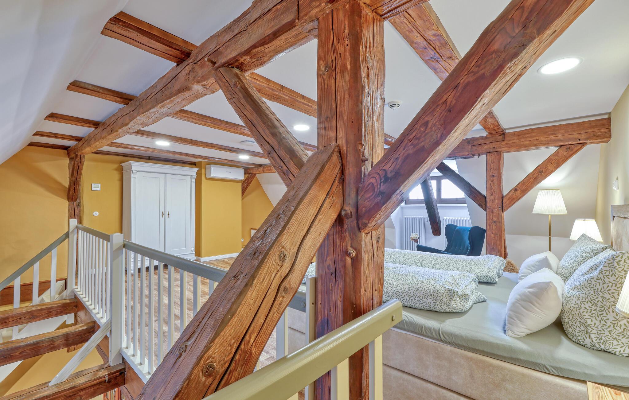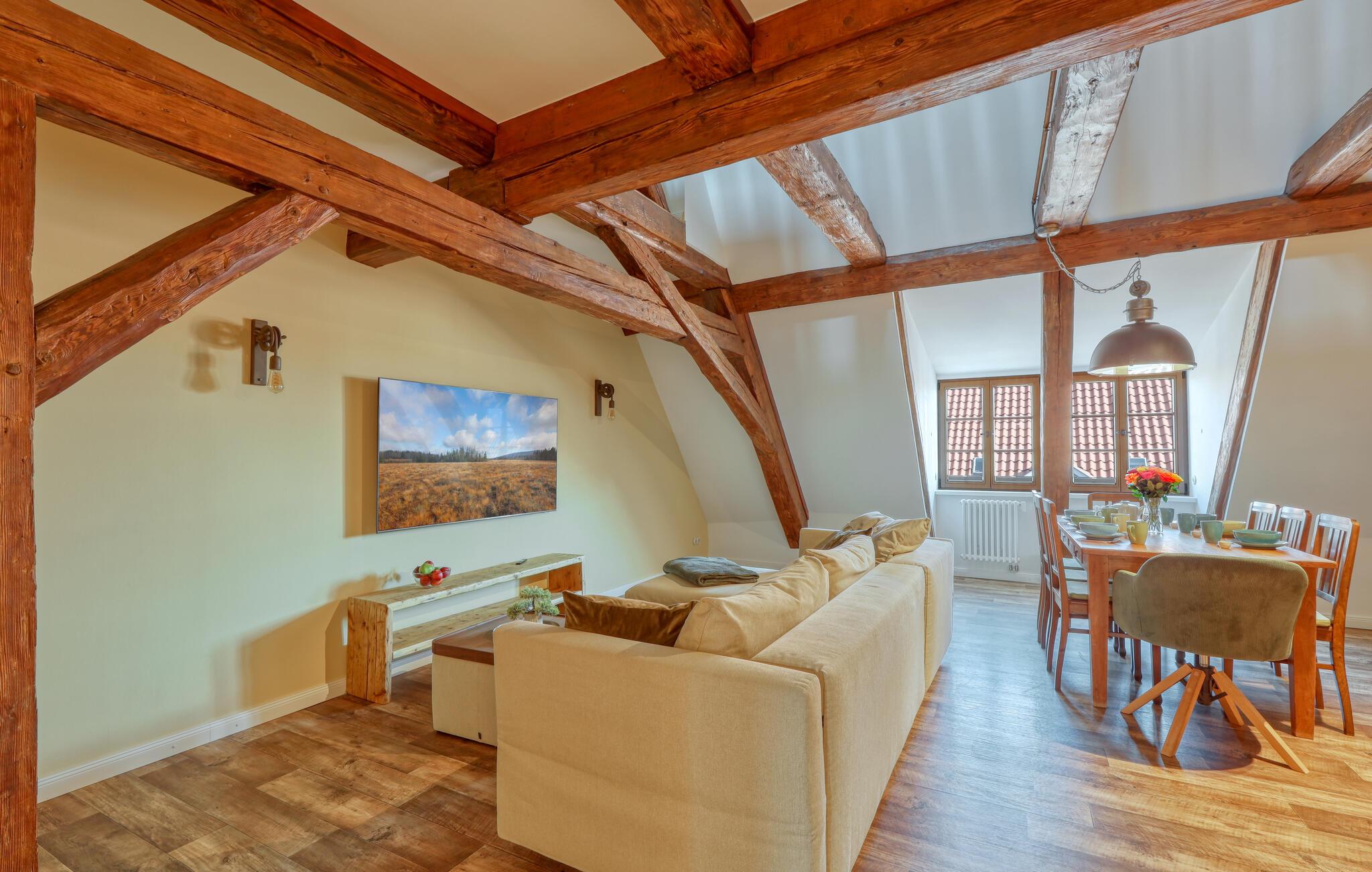 Velkommen til denne skønne lejlighed, som byder sine gæster velkommen med lyse, stilfuldt indrettede værelser i en historisk bygning, hvis lange historie ikke mindst viser sig i de dekorative træbjælker. Føl jer godt tilpas her med dine kære og nyd komforten og den smagfulde atmosfære. Slap af i saunaen, som deles med andre gæster, og hold jer i form selv på ferien med fitnessudstyret. Nyd din første kaffe og et par solstråler på terrassen, inden I begiver jer ud i dine aktiviteter.