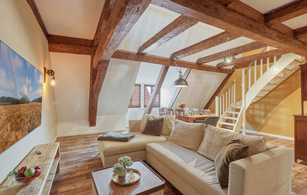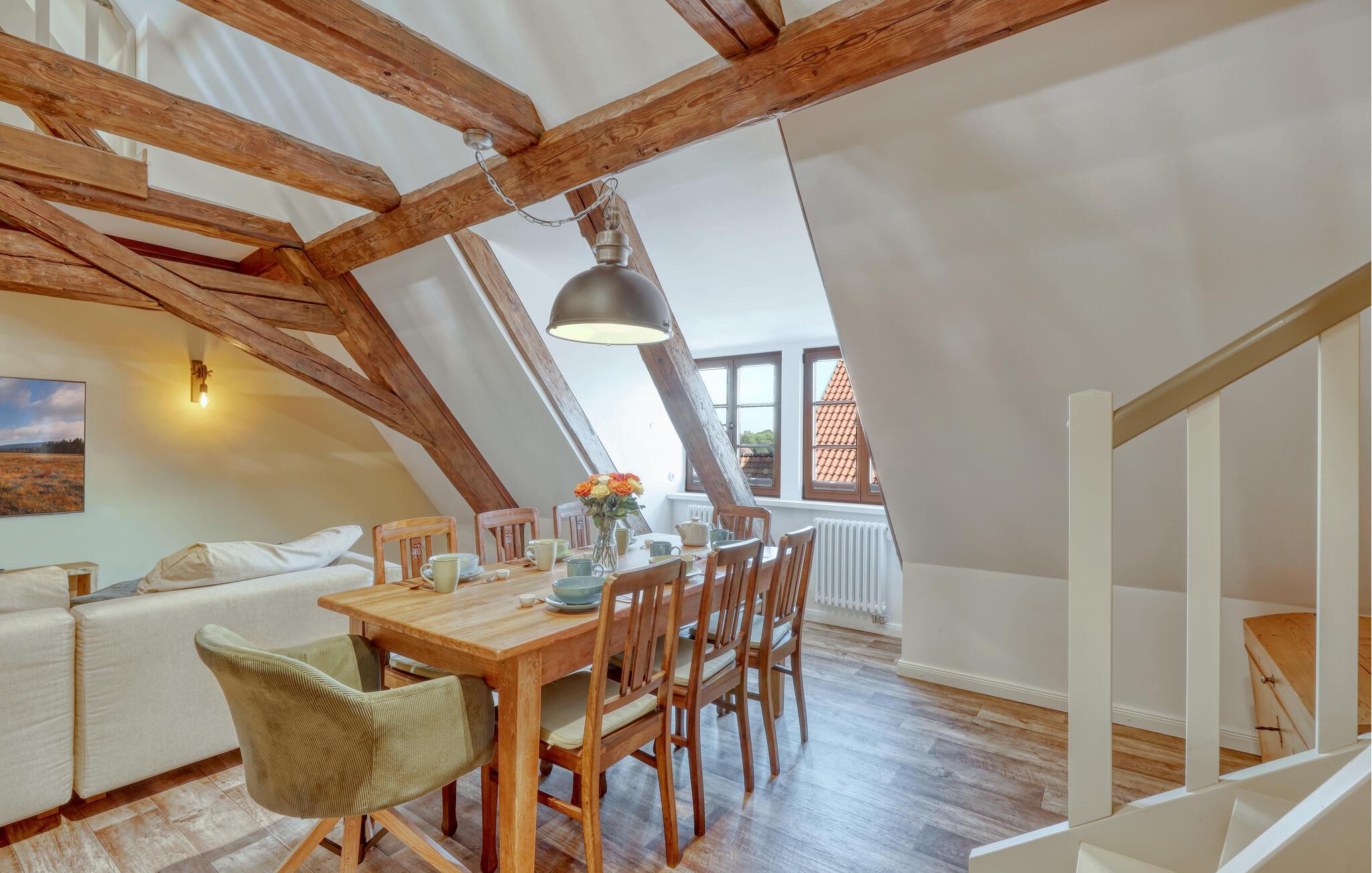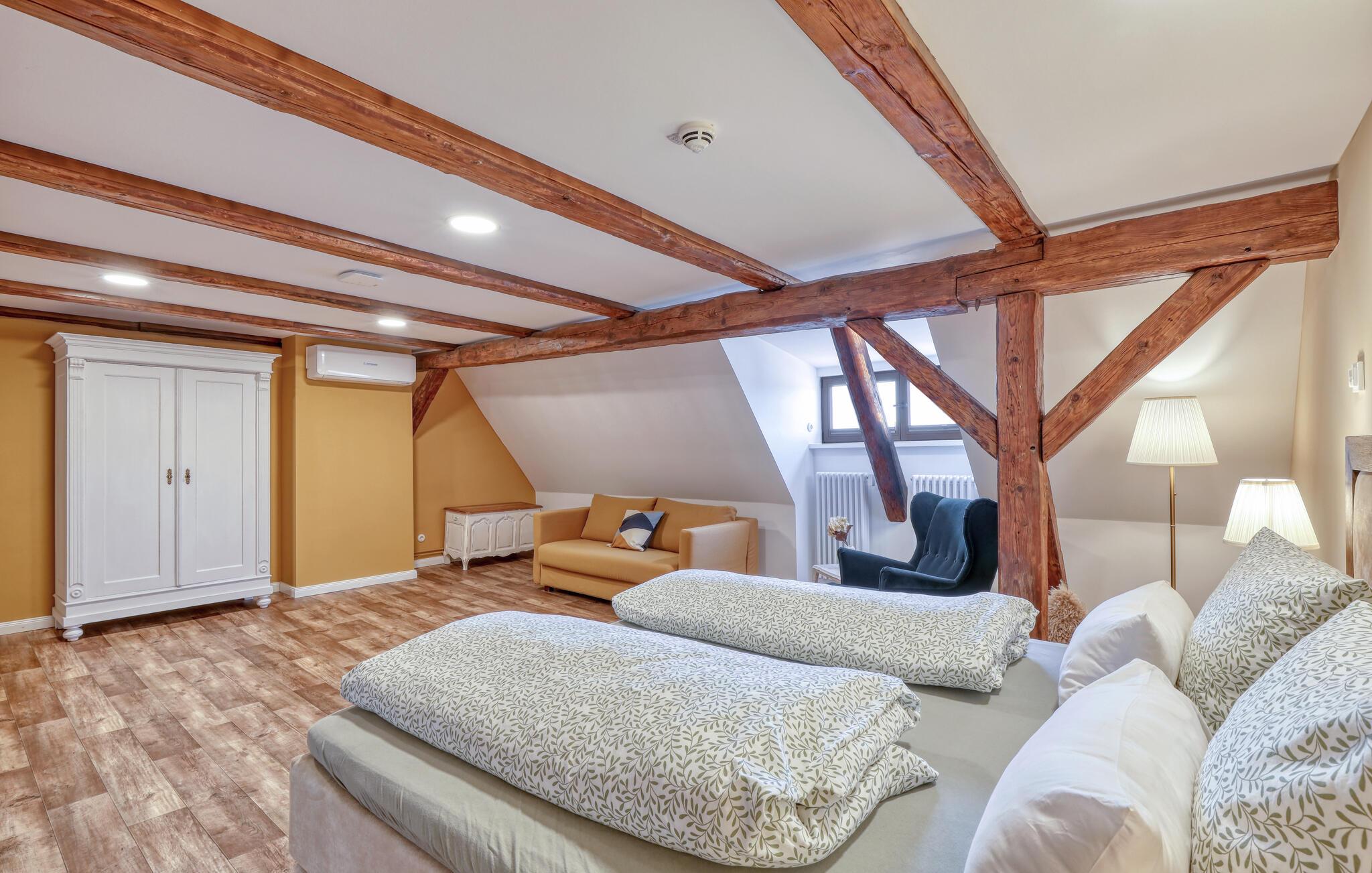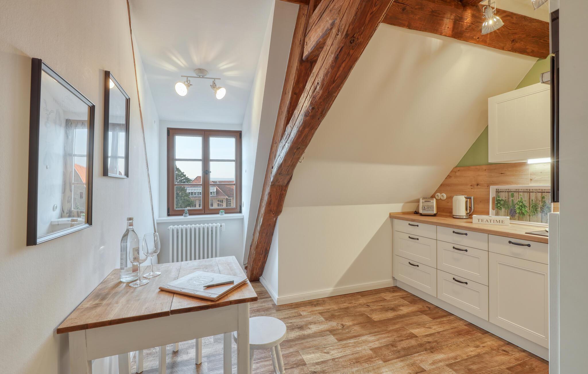 Velkommen til denne skønne lejlighed, som byder sine gæster velkommen med lyse, stilfuldt indrettede værelser i en historisk bygning, hvis lange historie ikke mindst viser sig i de dekorative træbjælker. Føl jer godt tilpas her med dine kære og nyd komforten og den smagfulde atmosfære. Slap af i saunaen, som deles med andre gæster, og hold jer i form selv på ferien med fitnessudstyret. Nyd din første kaffe og et par solstråler på terrassen, inden I begiver jer ud i dine aktiviteter.