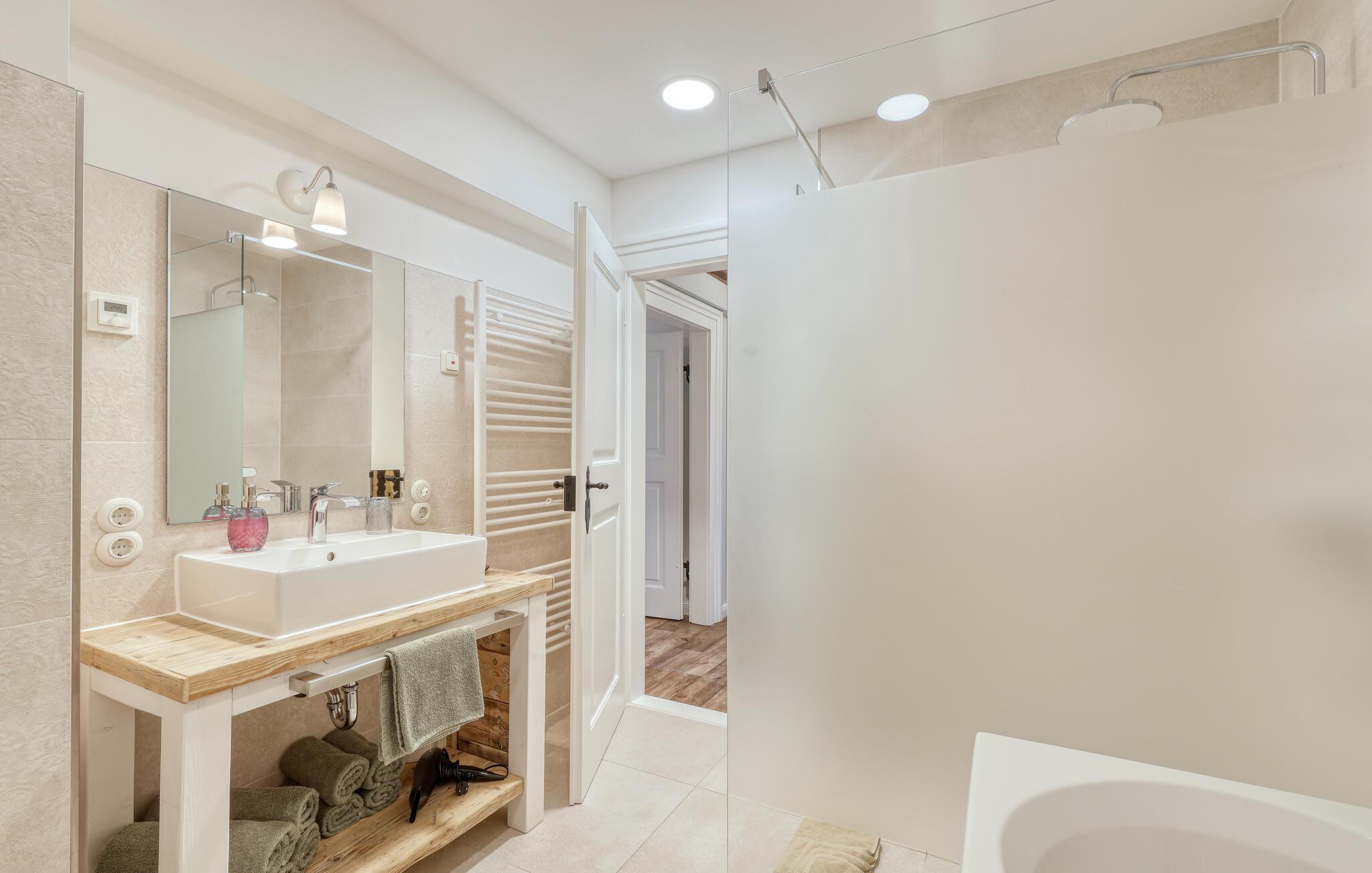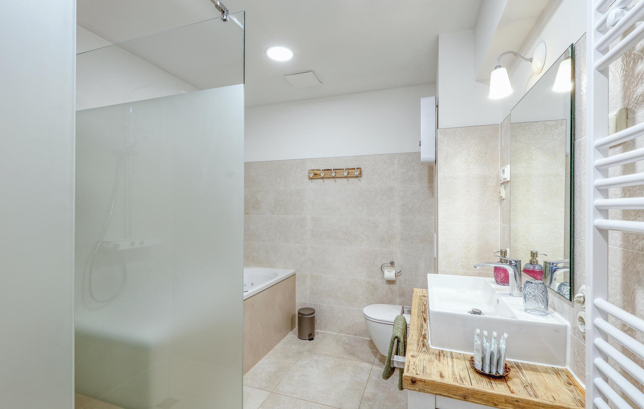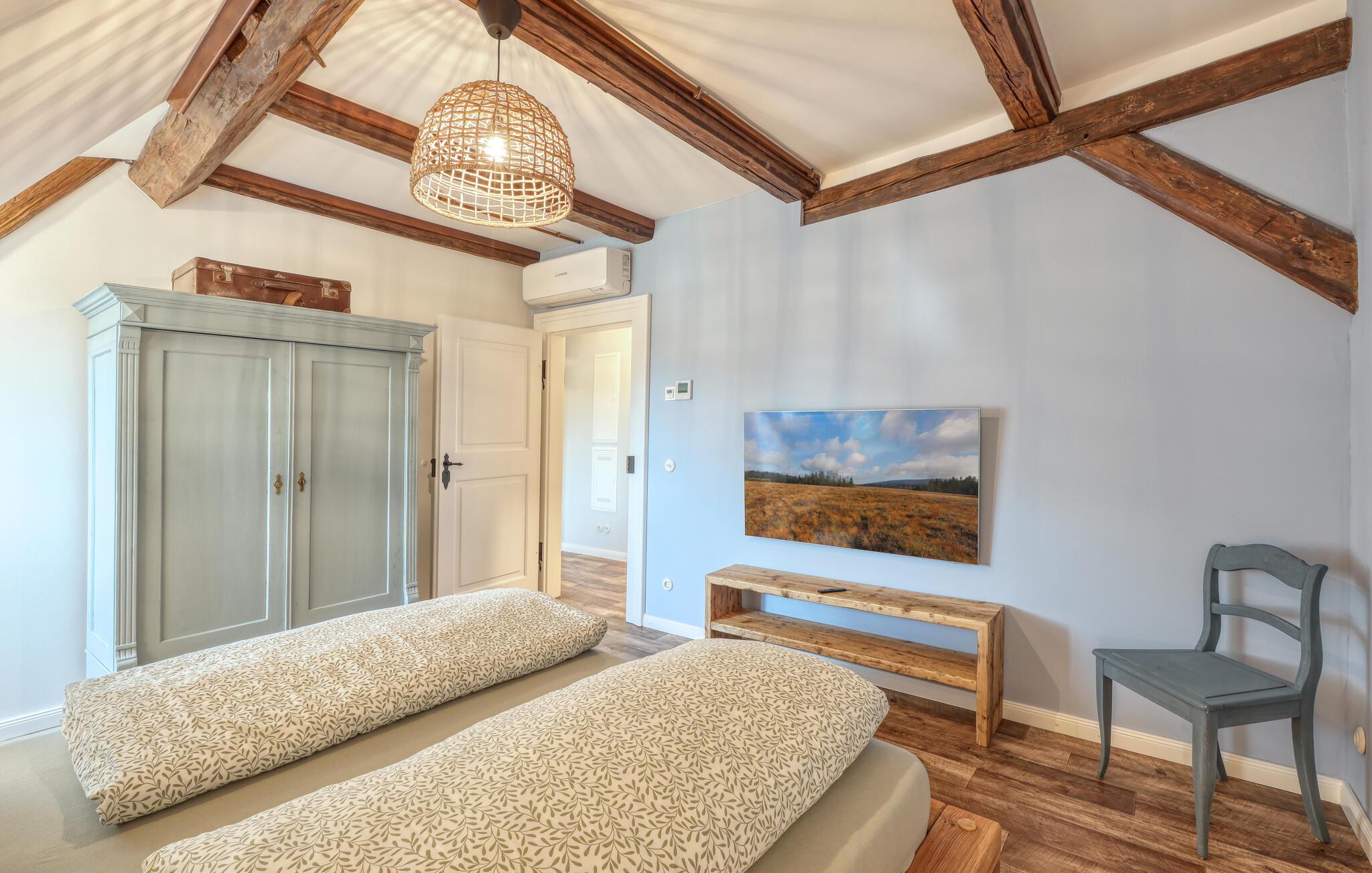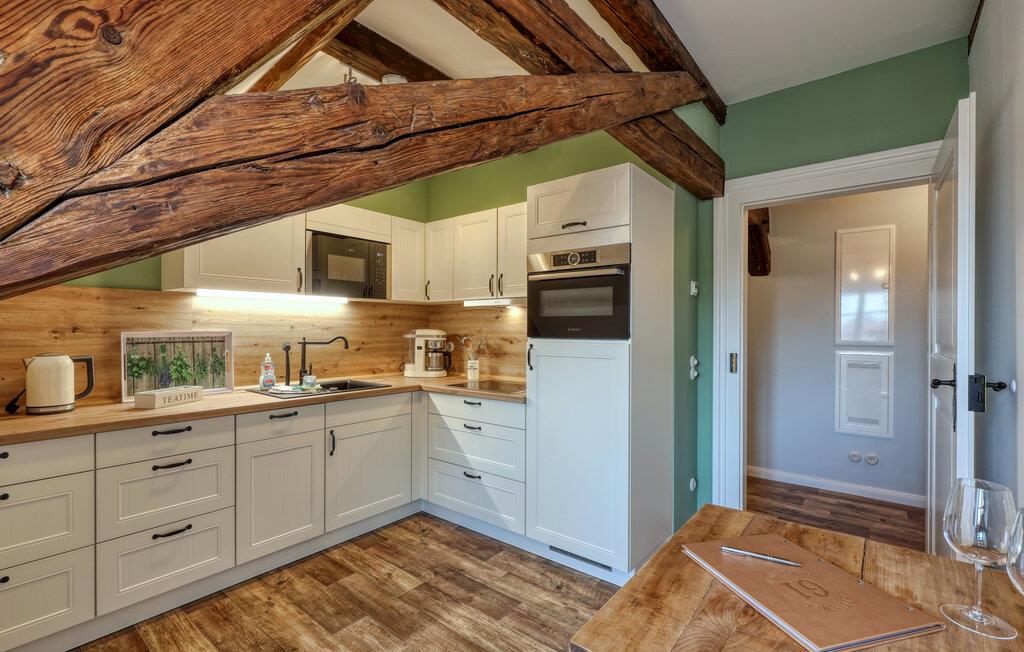 Velkommen til denne skønne lejlighed, som byder sine gæster velkommen med lyse, stilfuldt indrettede værelser i en historisk bygning, hvis lange historie ikke mindst viser sig i de dekorative træbjælker. Føl jer godt tilpas her med dine kære og nyd komforten og den smagfulde atmosfære. Slap af i saunaen, som deles med andre gæster, og hold jer i form selv på ferien med fitnessudstyret. Nyd din første kaffe og et par solstråler på terrassen, inden I begiver jer ud i dine aktiviteter.