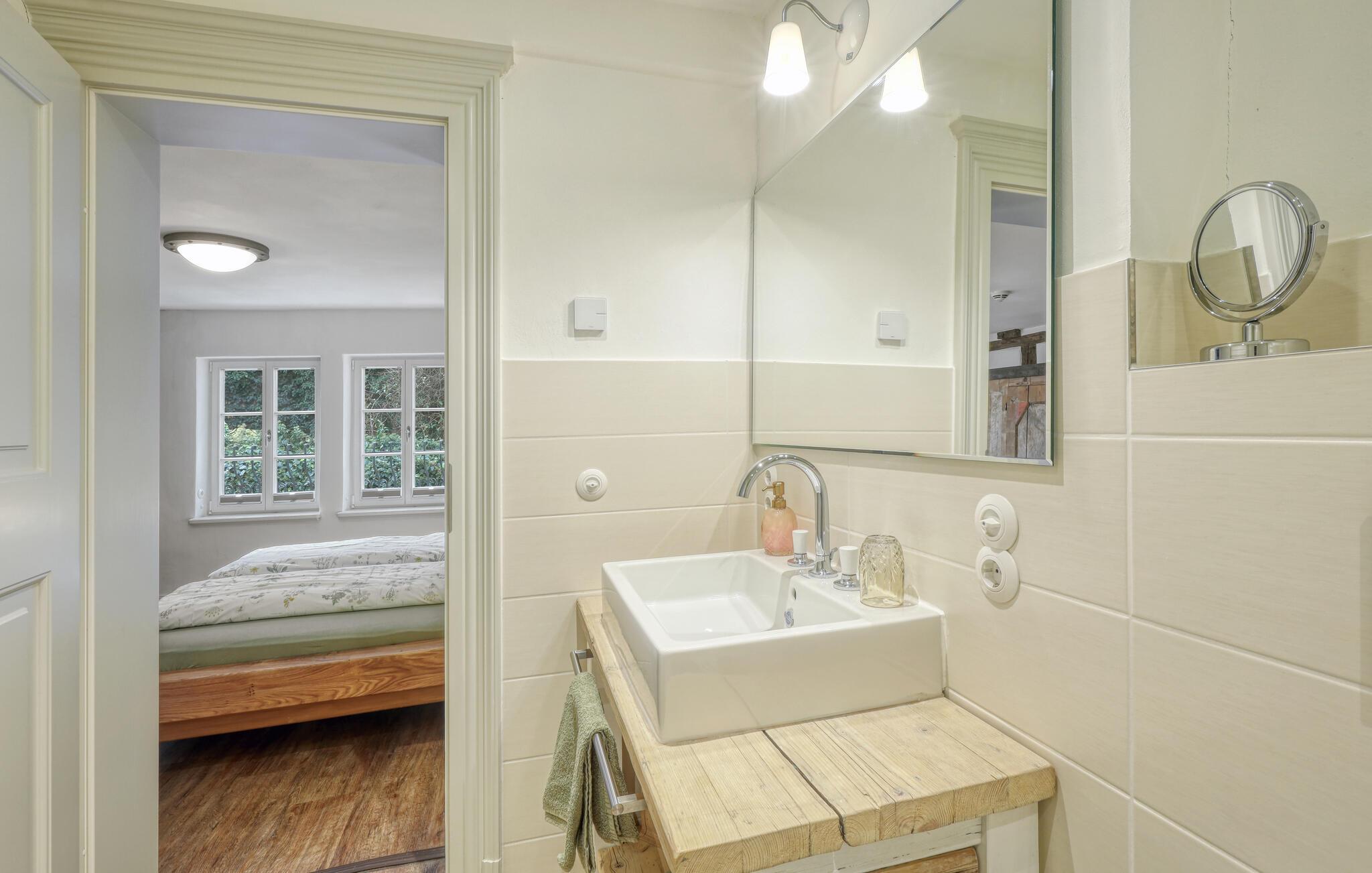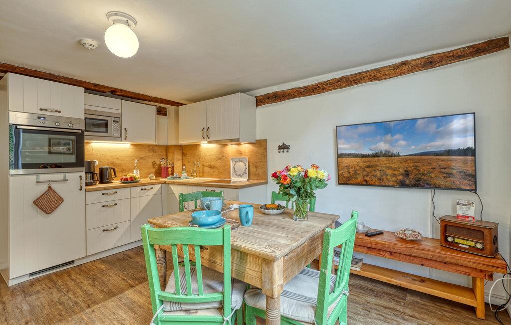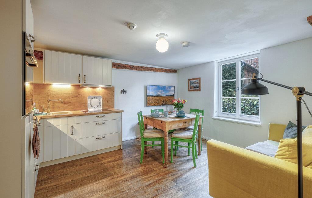 I jeres ferielejlighed venter en unik kombination af historisk flair og moderne komfort. Læg hverdagen bag jer, og nyd den hyggelige atmosfære i stuen, som med træmøbler og en komfortabel sofa lægger op til afslapning. Det åbne køkken tilbyder rummelige arbejdsflader, perfekte til fælles madlavningsaftener. Ved spisebordet opstår de bedste ideer til udflugter i området. Brug tiden på at samles i hyggeligt selskab og nyd ferien i fulde drag.