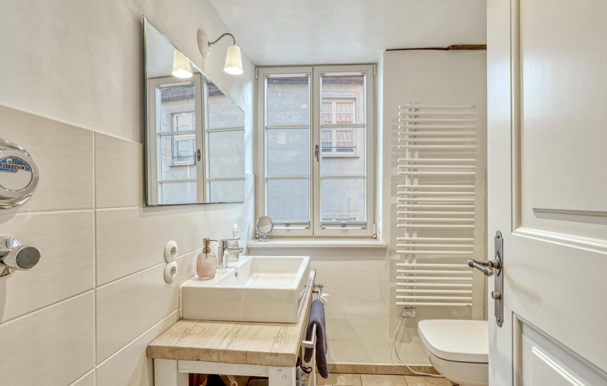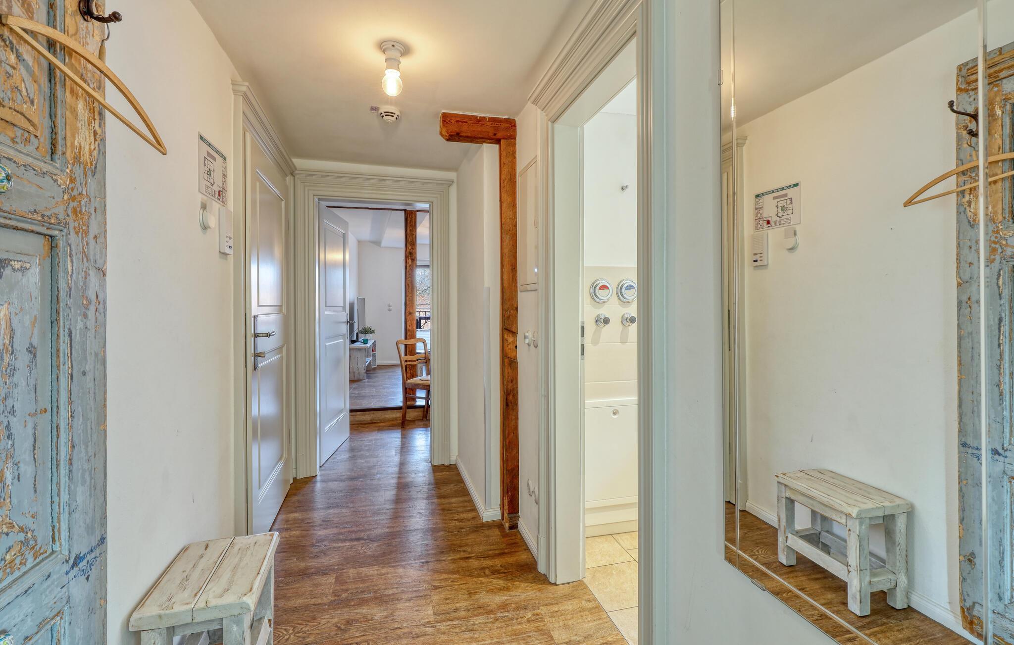Her forenes historisk atmosfære og moderne komfort på ideel vis. Den indbydende stue med sin komfortable sofa er det perfekte sted at slappe af efter en oplevelsesrig dag, hvad enten det er med en spændende bog, en film eller blot i en afslappet atmosfære. Køkkenet er godt udstyret, så I nemt kan tilberede jeres livretter. I den lyse spisestue kan I nyde jeres måltider i behagelige omgivelser. Brug også jeres balkon og nyd den smukke udsigt over byens tage.