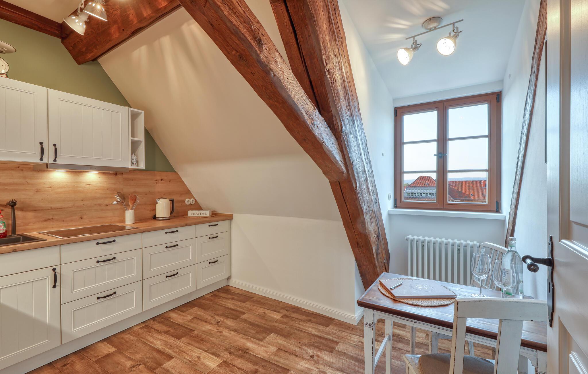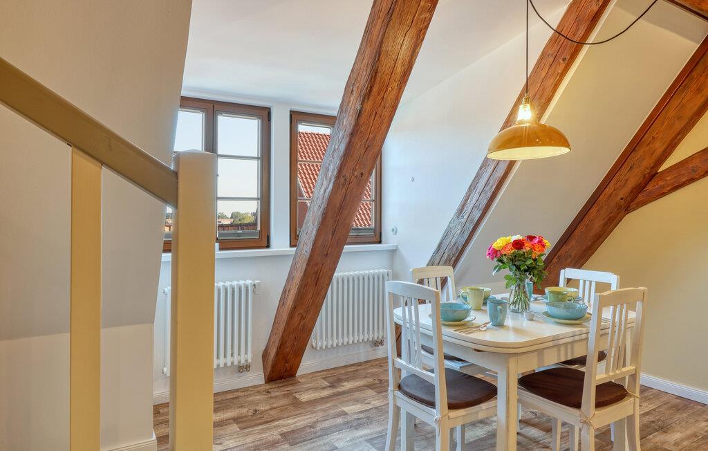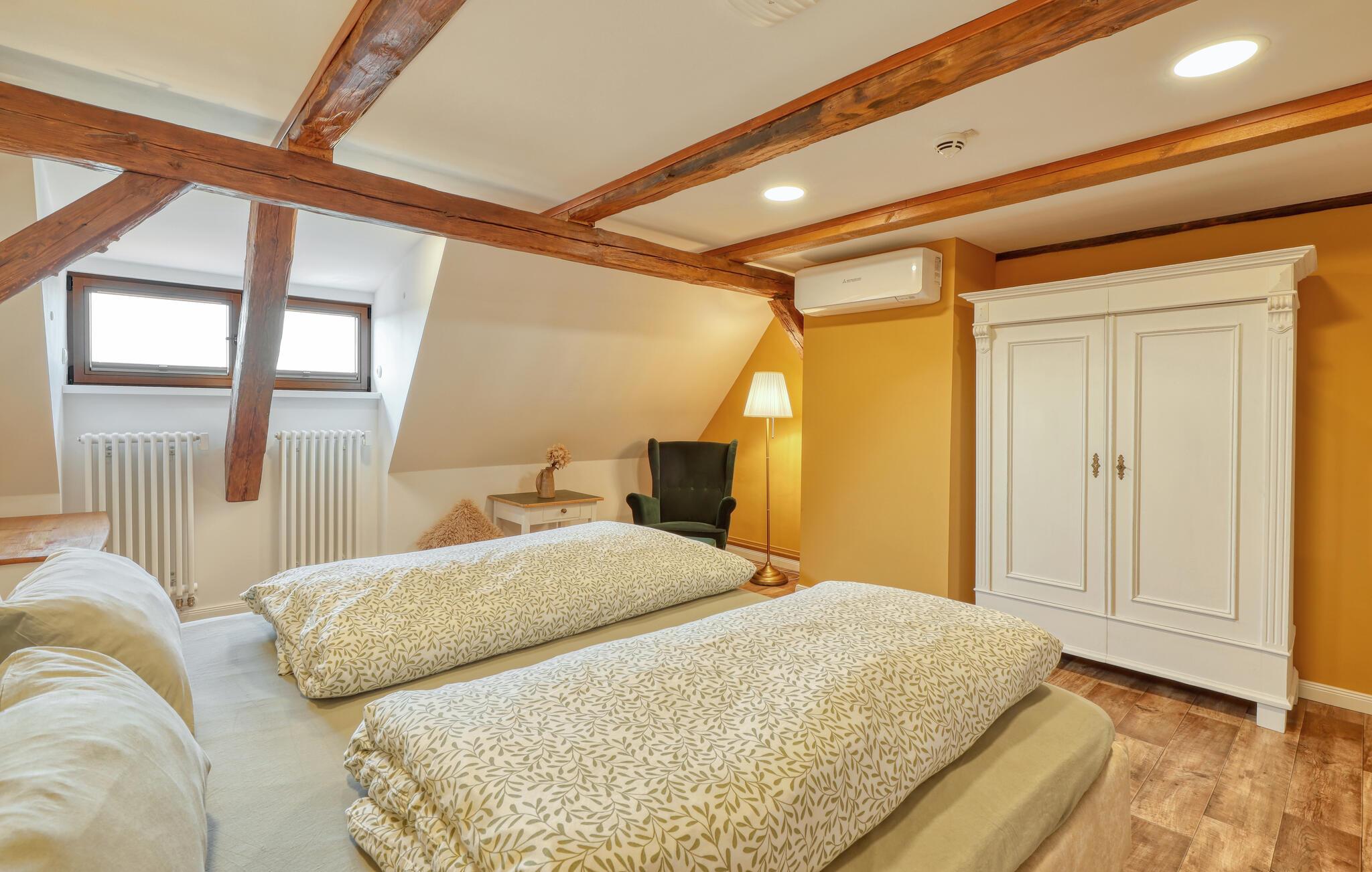 Velkommen til denne skønne lejlighed, som byder sine gæster velkommen med lyse, stilfuldt indrettede værelser i en historisk bygning, hvis lange historie ikke mindst viser sig i de dekorative træbjælker. Føl jer godt tilpas her med dine kære og nyd komforten og den smagfulde atmosfære. Slap af i saunaen, som deles med andre gæster, og hold jer i form selv på ferien med fitnessudstyret. Nyd din første kaffe og et par solstråler på terrassen, inden I begiver jer ud i dine aktiviteter.