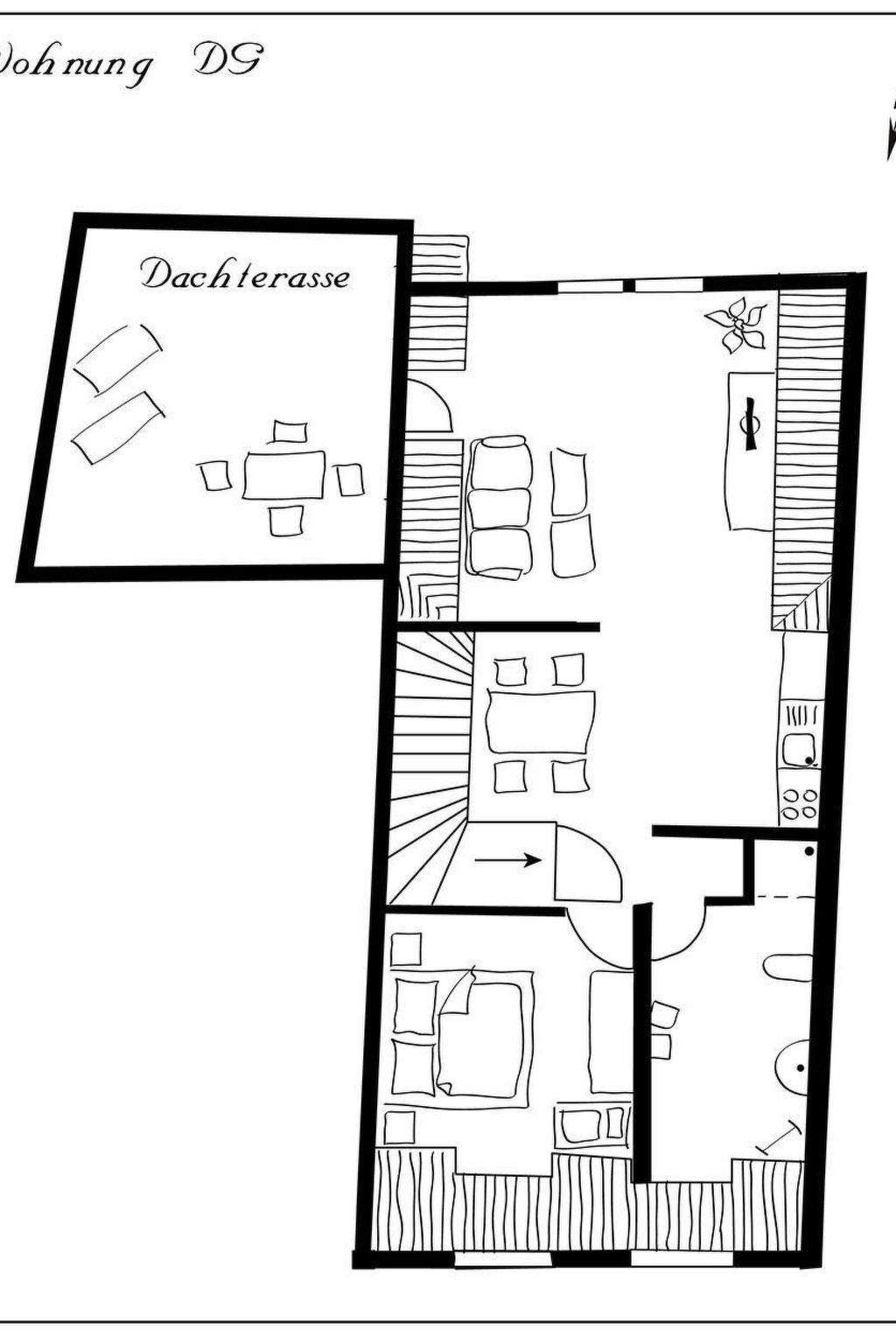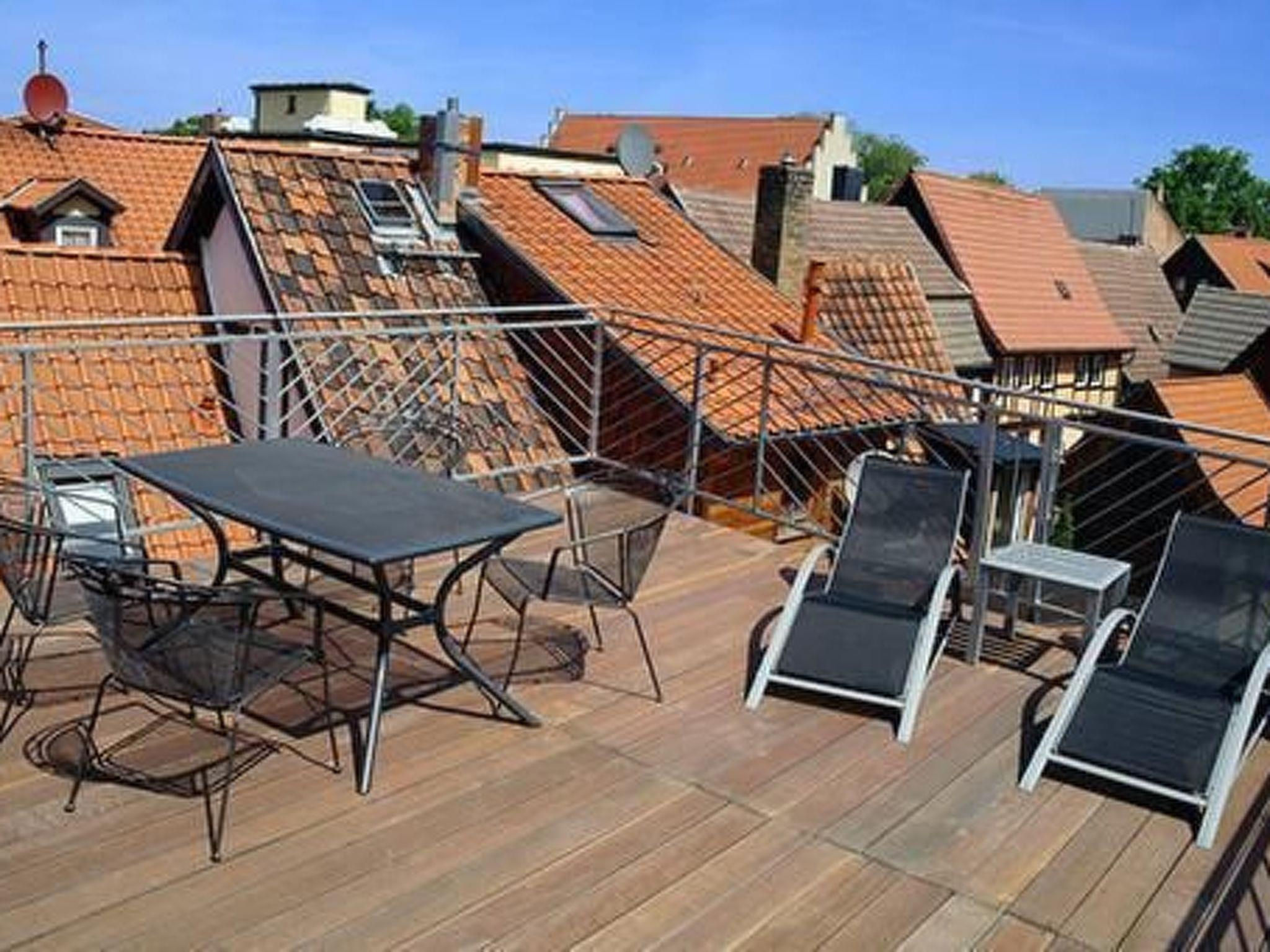 At the back of the living room, you can access your spacious roof terrace via an outside door. With a dining table and four chairs, this invites you to dine al fresco while enjoying the view of the rooftops of the old town. You can also relax and sunbathe on the two loungers.