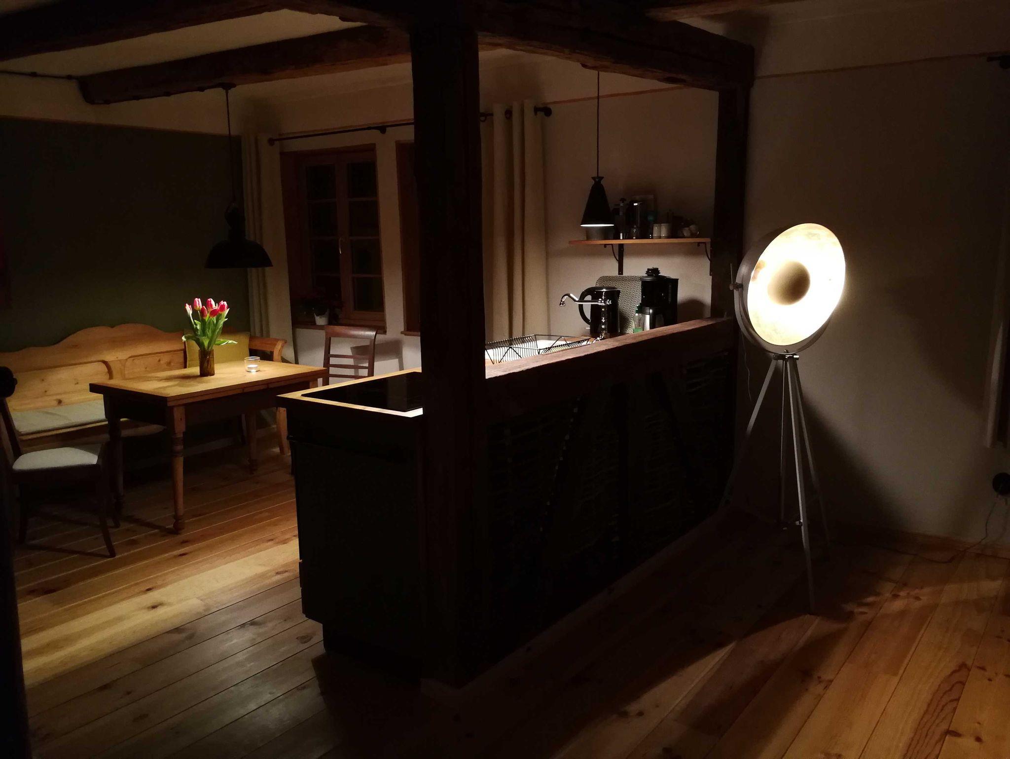 Dort angelangt betretet ihr den Wohnbereich mit offener Küche und gemütlicher Sitzecke, die Abends durchaus zu dem einen oder anderen Gesellschaftspiel bei einem netten Getränk zum Verweilen einlädt.