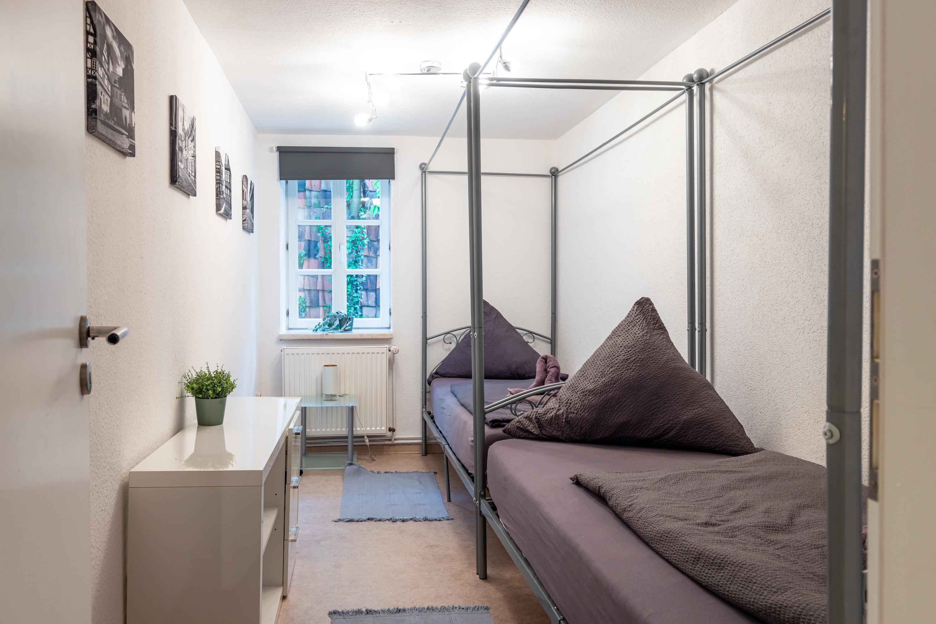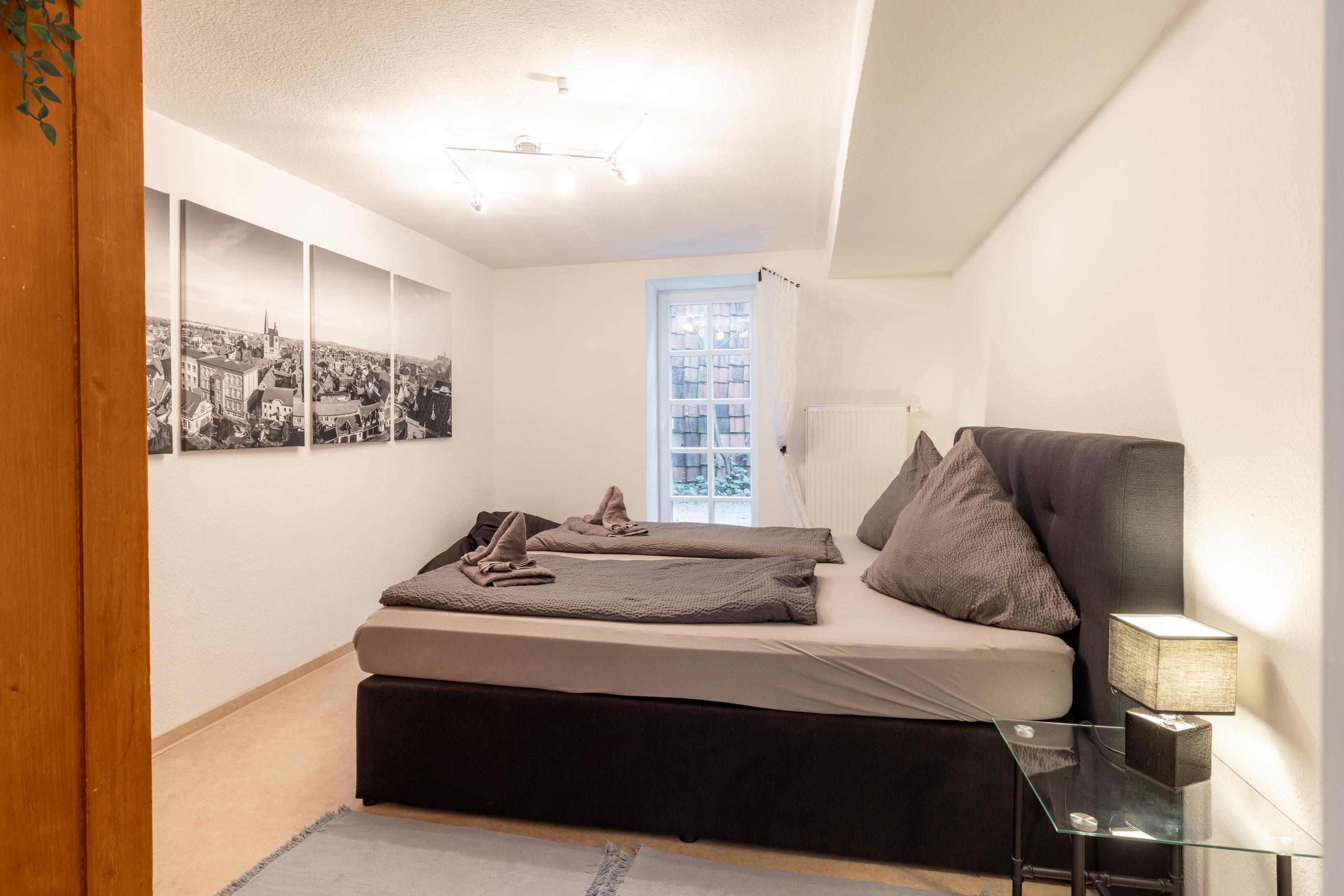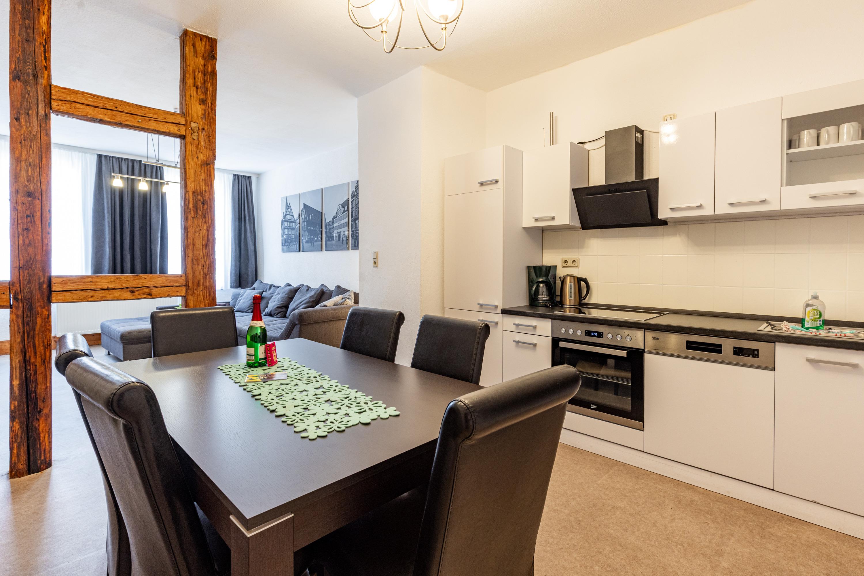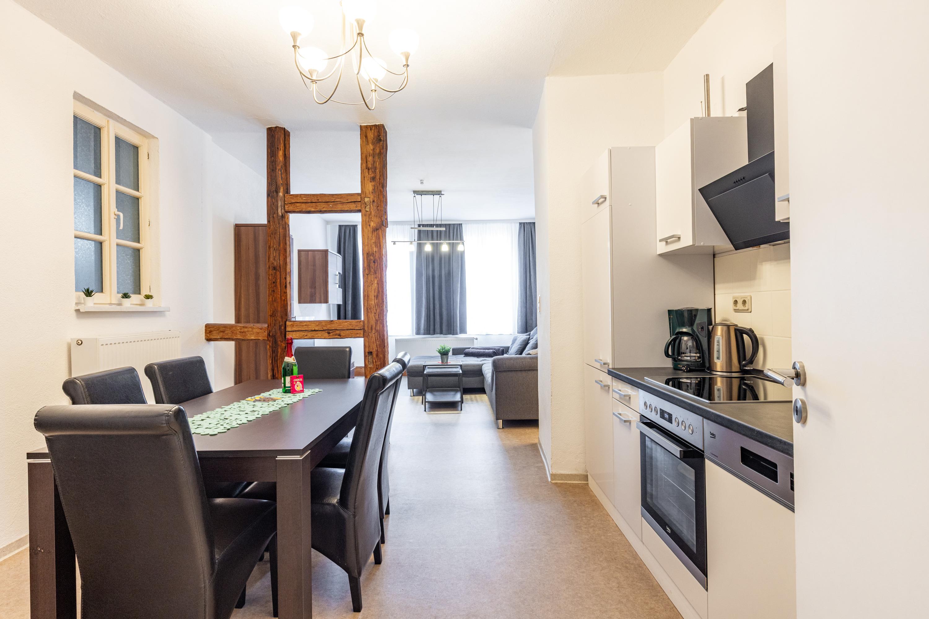 Unsere Ferienwohnung "Zum rost’gen Potte" ist zwar ein echtes Denkmal, trotzdem modern eingerichtet und wurde 2021 frisch renoviert. Im Schlafzimmer entspannen Sie auf einem breiten Boxspringbett - Ihr Gepäck verstauen Sie bequem im separaten Kleiderschrank. Das 2. Schlafzimmer verfügt über 2 Einzelbetten im Himmelbett-Stil. Im Wohnzimmer wartet eine moderne ausziehbare Wohnlandschaft auf Sie - genießen Sie Ihren Abend bei einem guten Glas Wein und einem Buch oder machen Sie sich einen gemütlichen Fernsehabend vor unserem Flachbild-TV! Die Wohnlandschaft kann bei Bedarf auch in eine dritte Schlafmöglichkeit verwandelt werden. Zusätzlich gibt es im Wohnzimmer einen separaten Eßbereich. Die modern eingerichtete Küche verfügt über einen Herd mit Ceranfeld, Backofen, Spülmaschine, Kühlschrank mit Tiefkühlfach, Wasserkocher, Kaffeemaschine und Toaster. Im Bad finden Sie Dusche, Badewanne, Waschbecken, Waschmaschine und WC. Die Ferienwohnung verfügt über kostenloses W-Lan. Fahrräder können in der Hofdurchfahrt sicher und überdacht abgestellt werden.