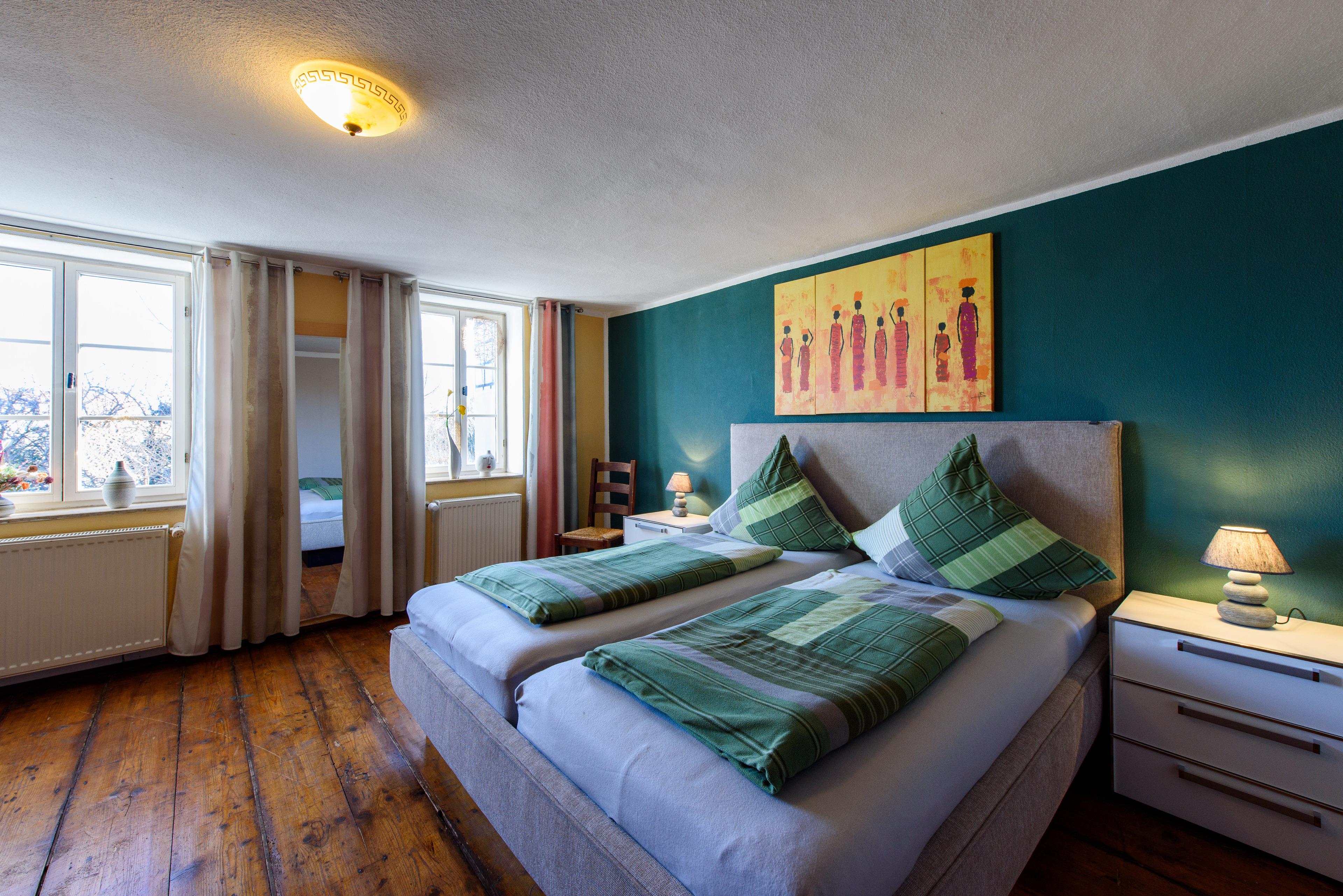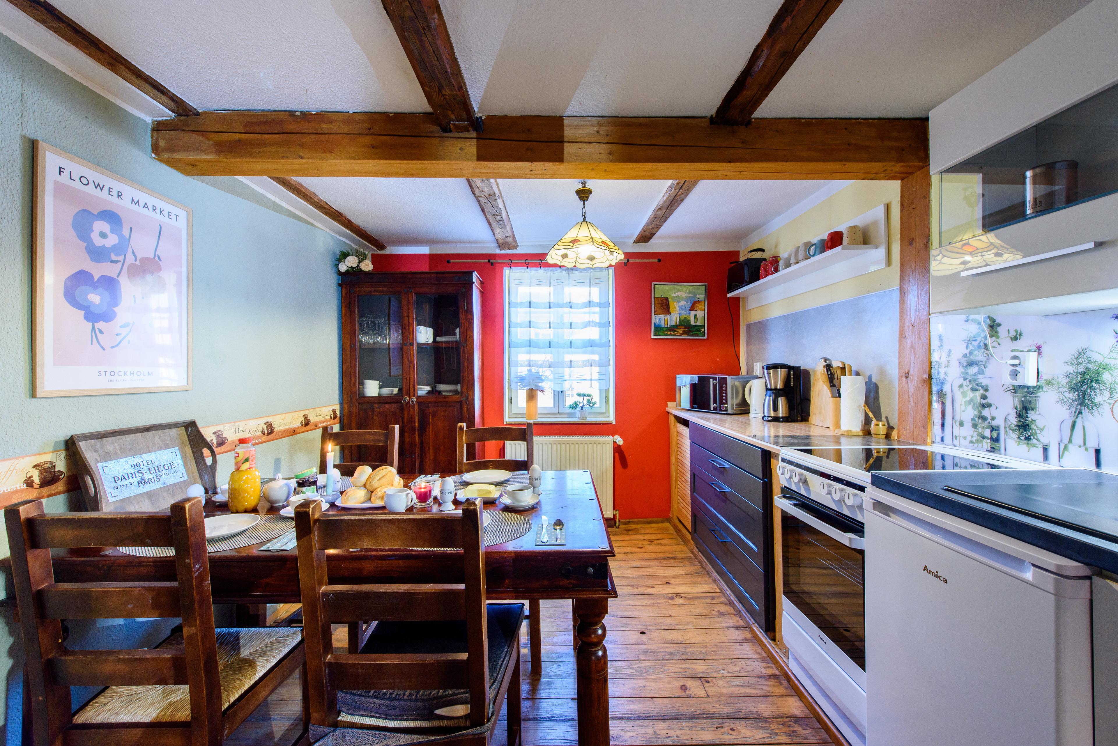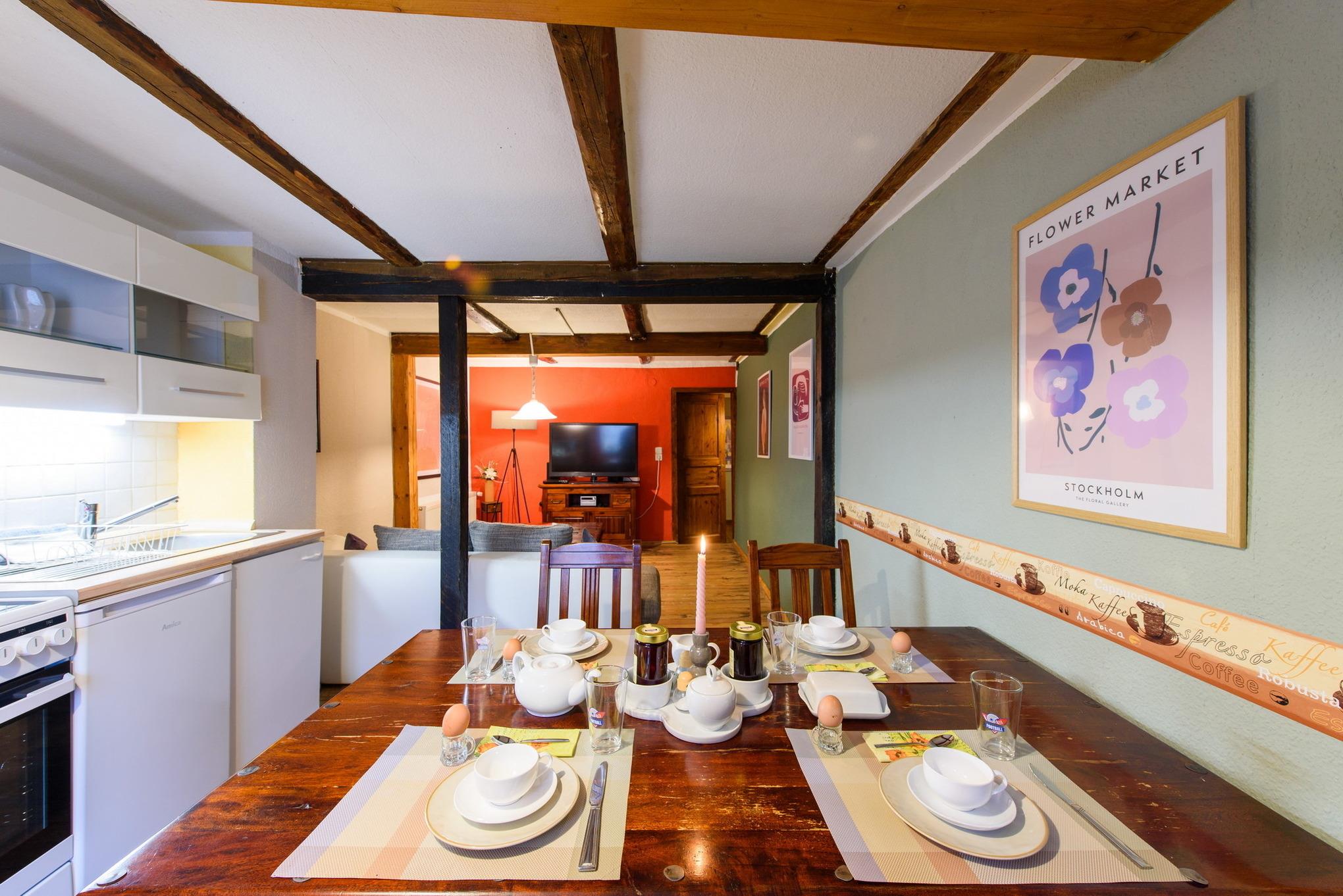 Mit ihren 70qm ist dies unsere größte Wohnung. Das Besondere an ihr ist das rustikal eingerichtete Wohnzimmer, das mit seinem alten Gebälk die dort angrenzende Küche als einen Raum erscheinen lässt. Die zwei ruhig gelegenen Schlafzimmer besitzen jeweils einen separaten Zugang zum großen Familienbad, das sowohl eine Badewanne, als auch eine Dusche aufweist. Mit einer zusätzlichen Aufbettung kann aufgewartet werden.