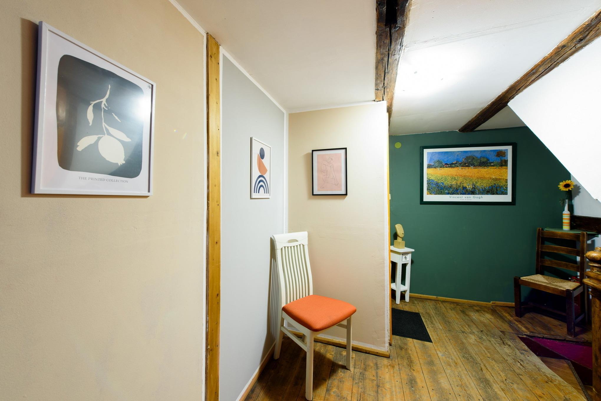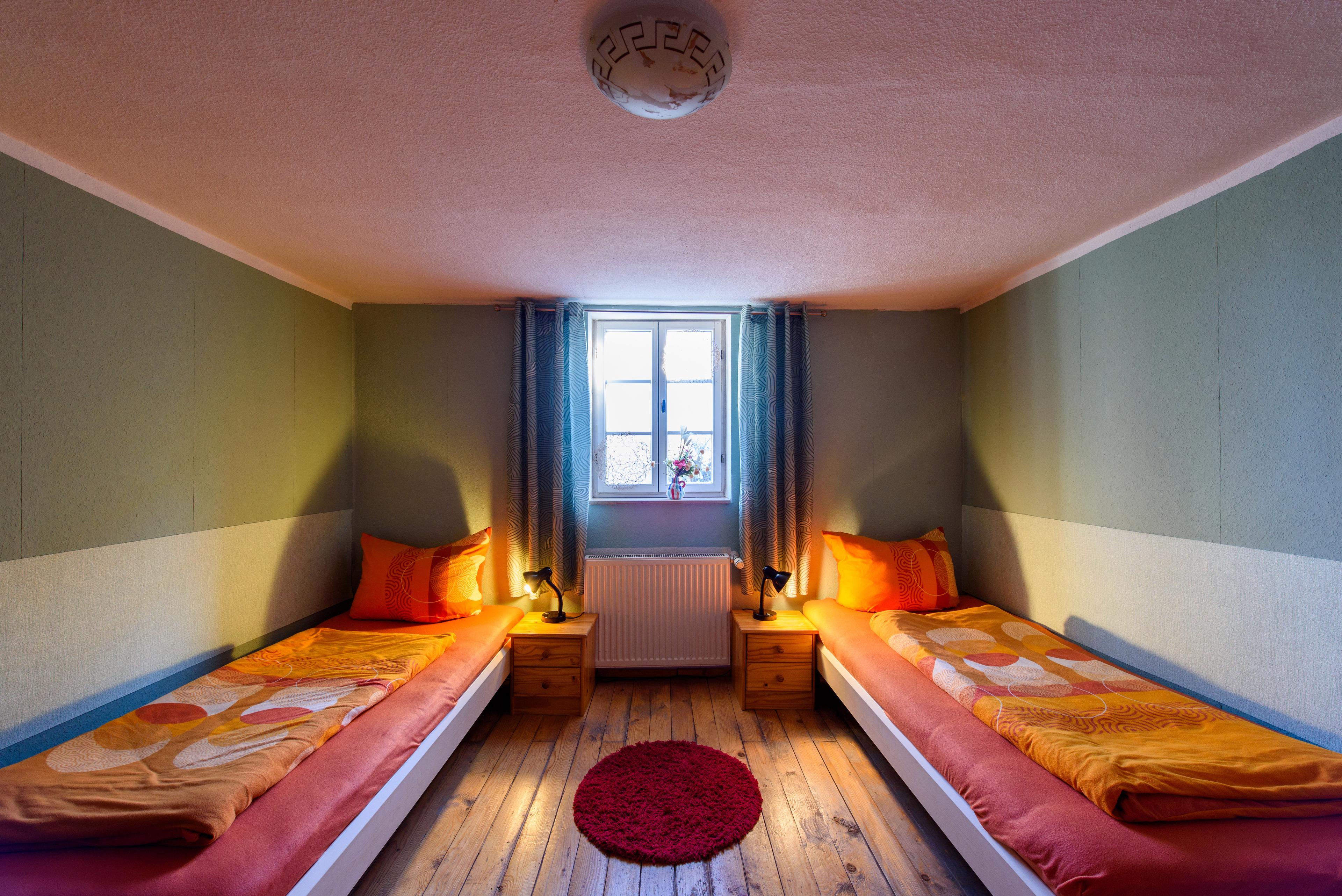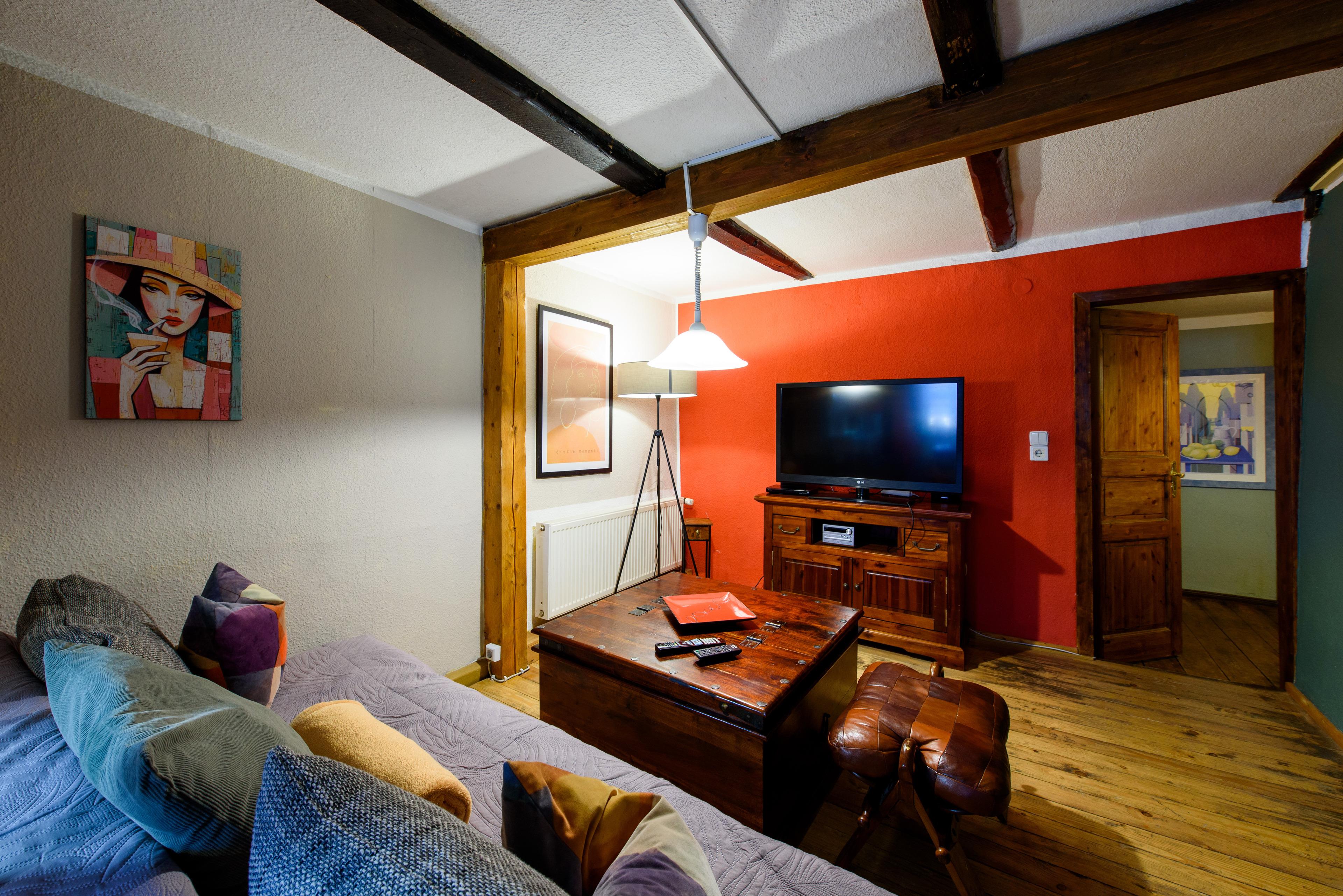 Mit ihren 70qm ist dies unsere größte Wohnung. Das Besondere an ihr ist das rustikal eingerichtete Wohnzimmer, das mit seinem alten Gebälk die dort angrenzende Küche als einen Raum erscheinen lässt. Die zwei ruhig gelegenen Schlafzimmer besitzen jeweils einen separaten Zugang zum großen Familienbad, das sowohl eine Badewanne, als auch eine Dusche aufweist. Mit einer zusätzlichen Aufbettung kann aufgewartet werden.