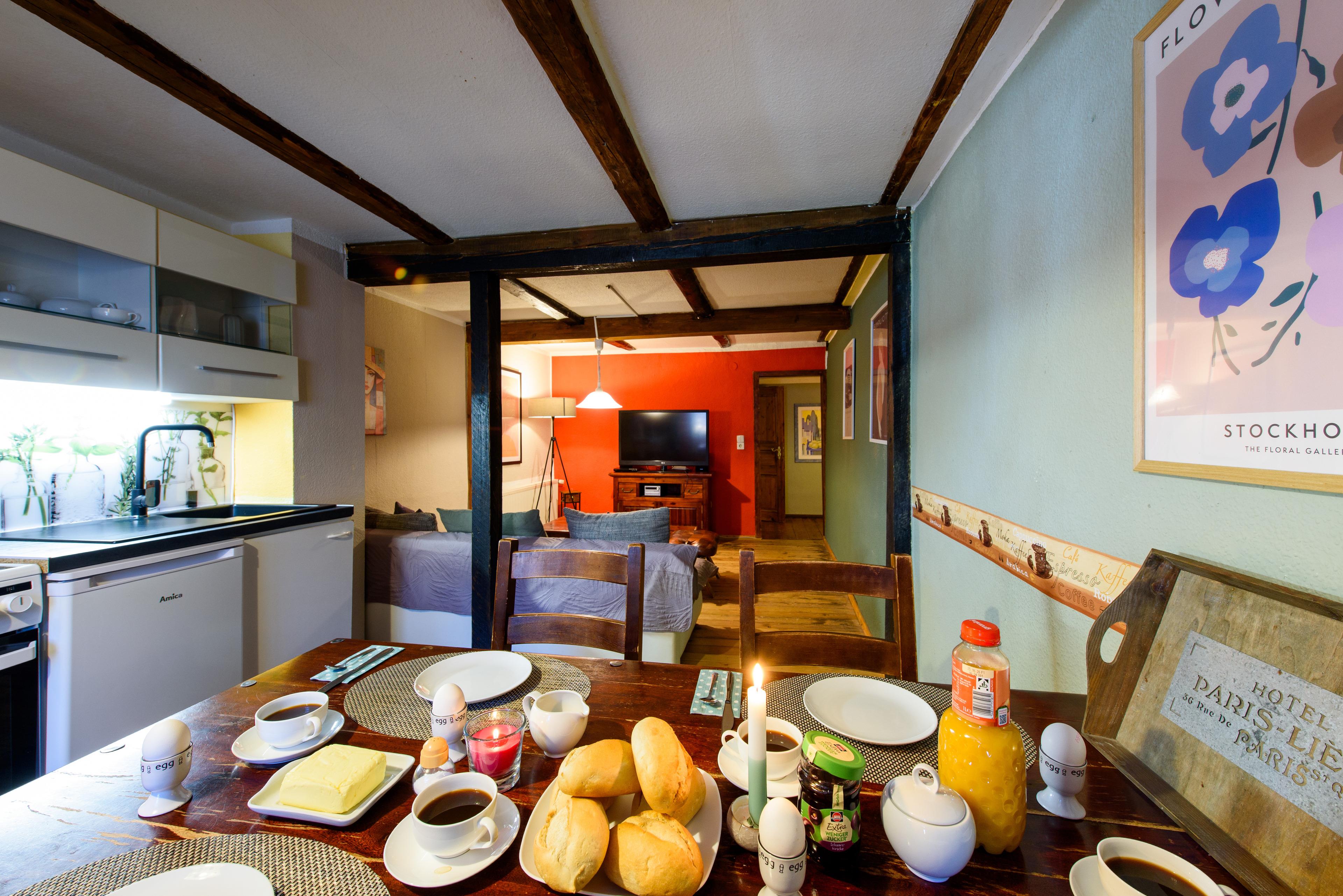 Es erwarten Sie eine Wohnungen, die entsprechend geprägt ist vom Ambiente der alten Zeit und dennoch allen Komfort unserer Neuzeit bieten. All unsere Zimmer strahlen eine farbenfrohe Freundlichkeit aus, die nicht vergessen lässt, dass man sich im Urlaub befindet. Wir wollen Ihnen nicht nur eine Herberge bieten, um unsere 1000-jährige Fachwerkstadt kennen zu lernen, sondern auch ein wohliges Gefühl an eine besondere und interessante Unterkunft vermitteln.