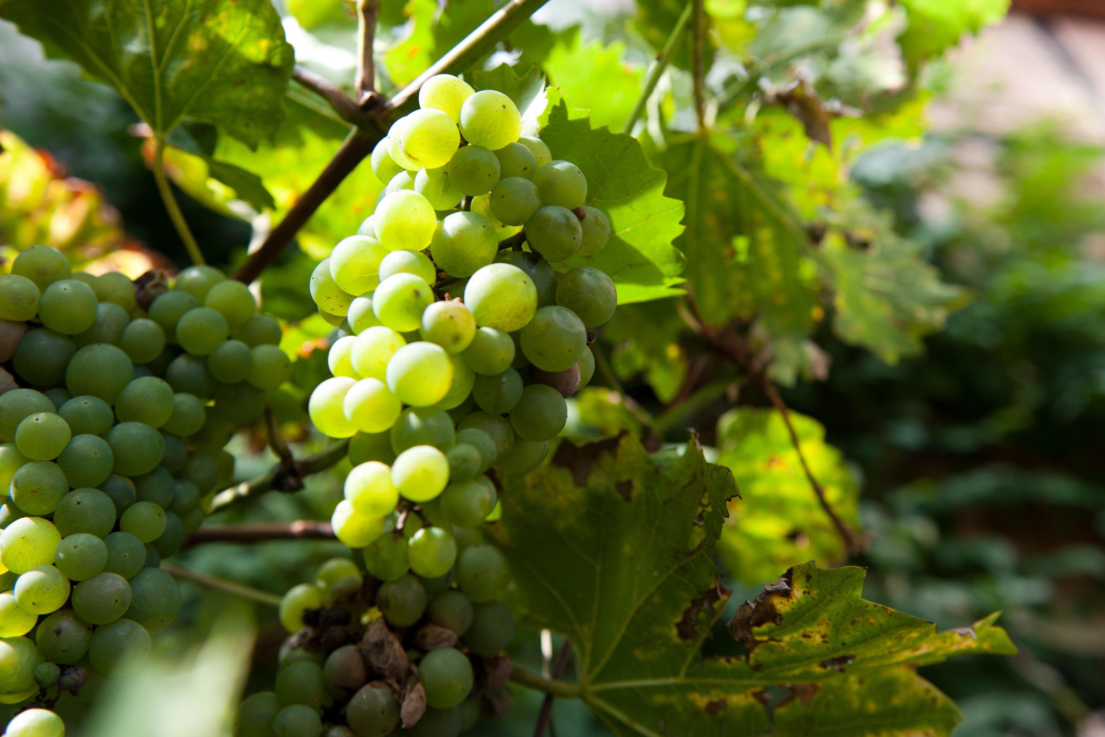 Auf dem Hof befinden sich am Haus Weinstöcke und ein großer Tisch zum Entspannen.