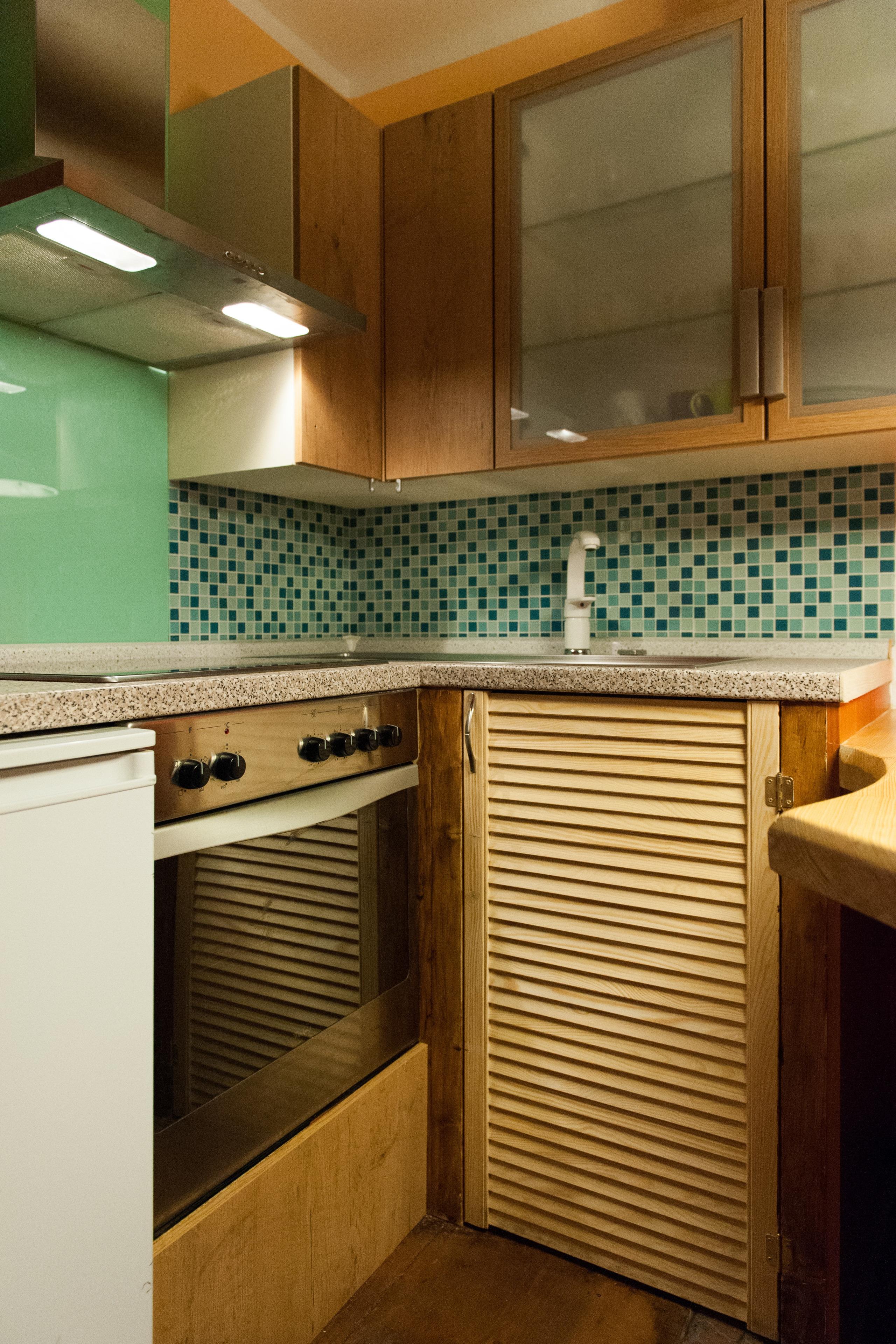 Das große, moderne Ehebett, mit seiner dickpolstrigen Lederlehne lädt förmlich zum Schlafen ein, kann aber auch wunderbar als Liegecouch verwendet werden. Das Bad, ebenfalls ein Hingucker, ist ausgestattet mit einer Rundtür-Dusche, zum bequemen Ein- und Ausstieg. Ein besonderes Highlight in der Küche ist der extra angepasste Holztisch mit witzigen, sehr bequemen Hochstühlen. Die breiten Dielen darunter und das alte Gebälk darüber, fügen sich harmonisch in das farbenfrohe Flair der Einrichtung ein.