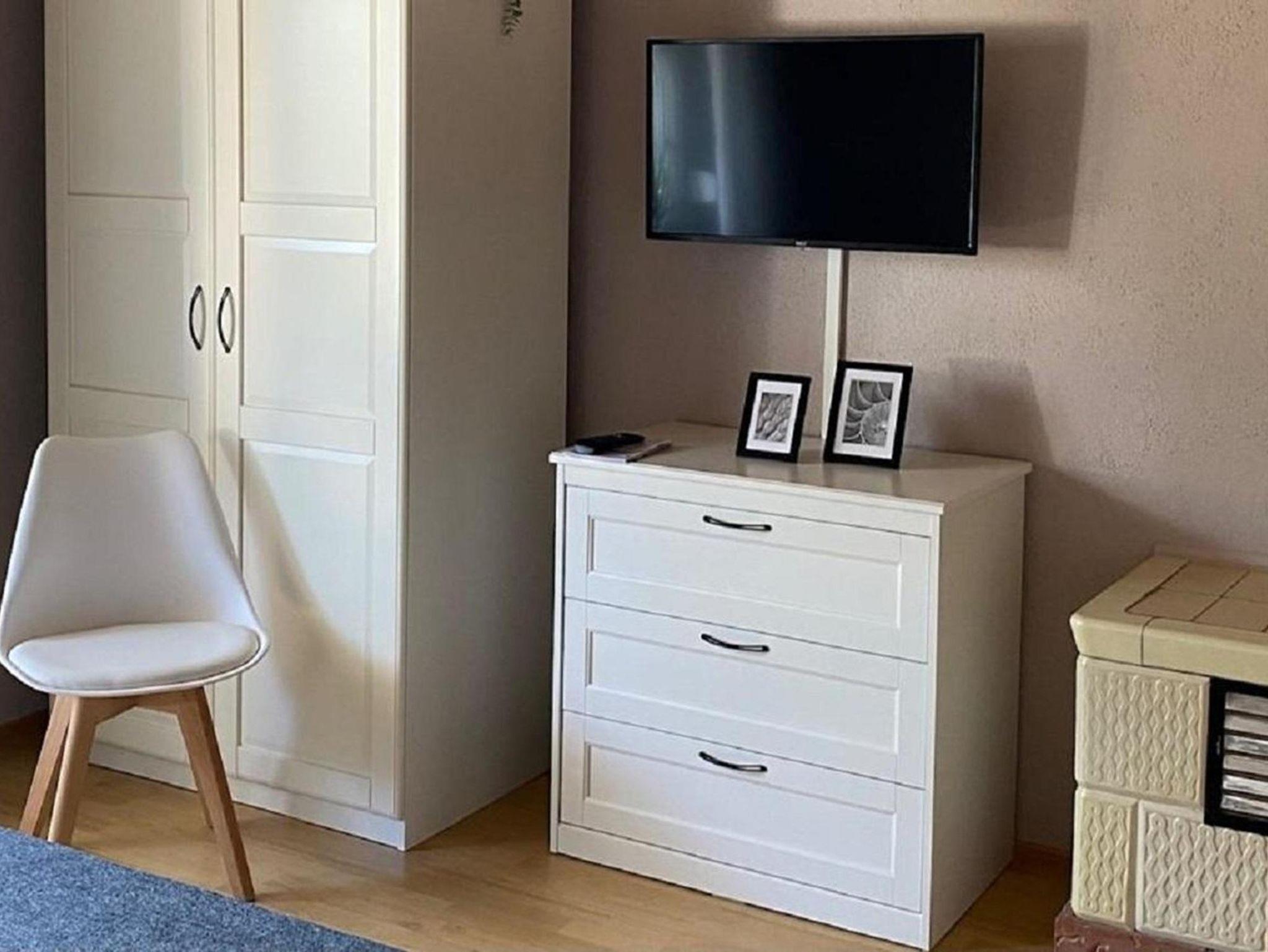 Im Erdgeschoss befindet sich eine voll ausgestattete Küche mit zwei Küchenzeilen, einschließlich Spülmaschine, Backofen, Cerankochfeld und Kühlschrank mit Eisfach. Ein gemütliches Wohn- und Esszimmer mit Zugang zur Loggia und ein Gäste-WC ergänzen das Angebot.