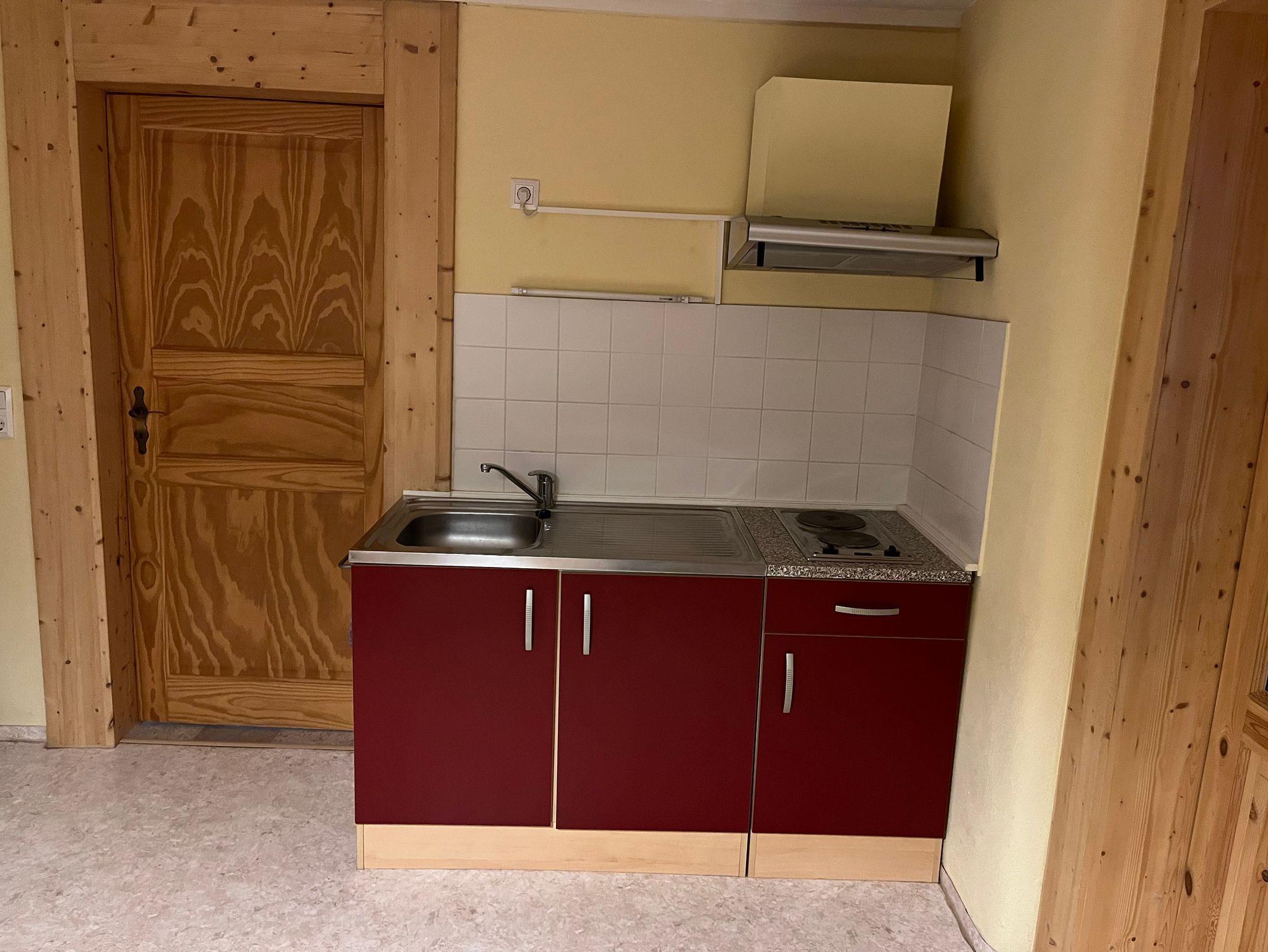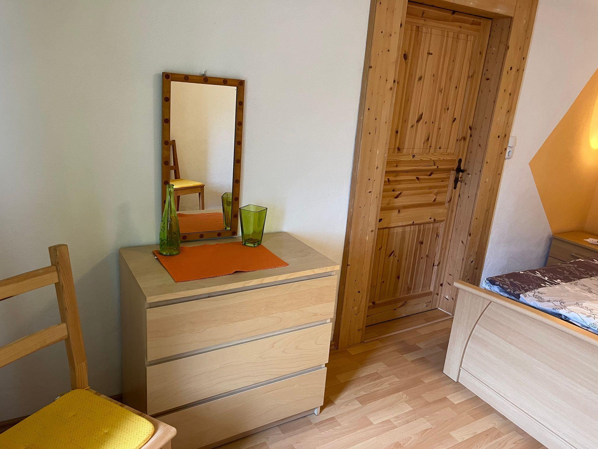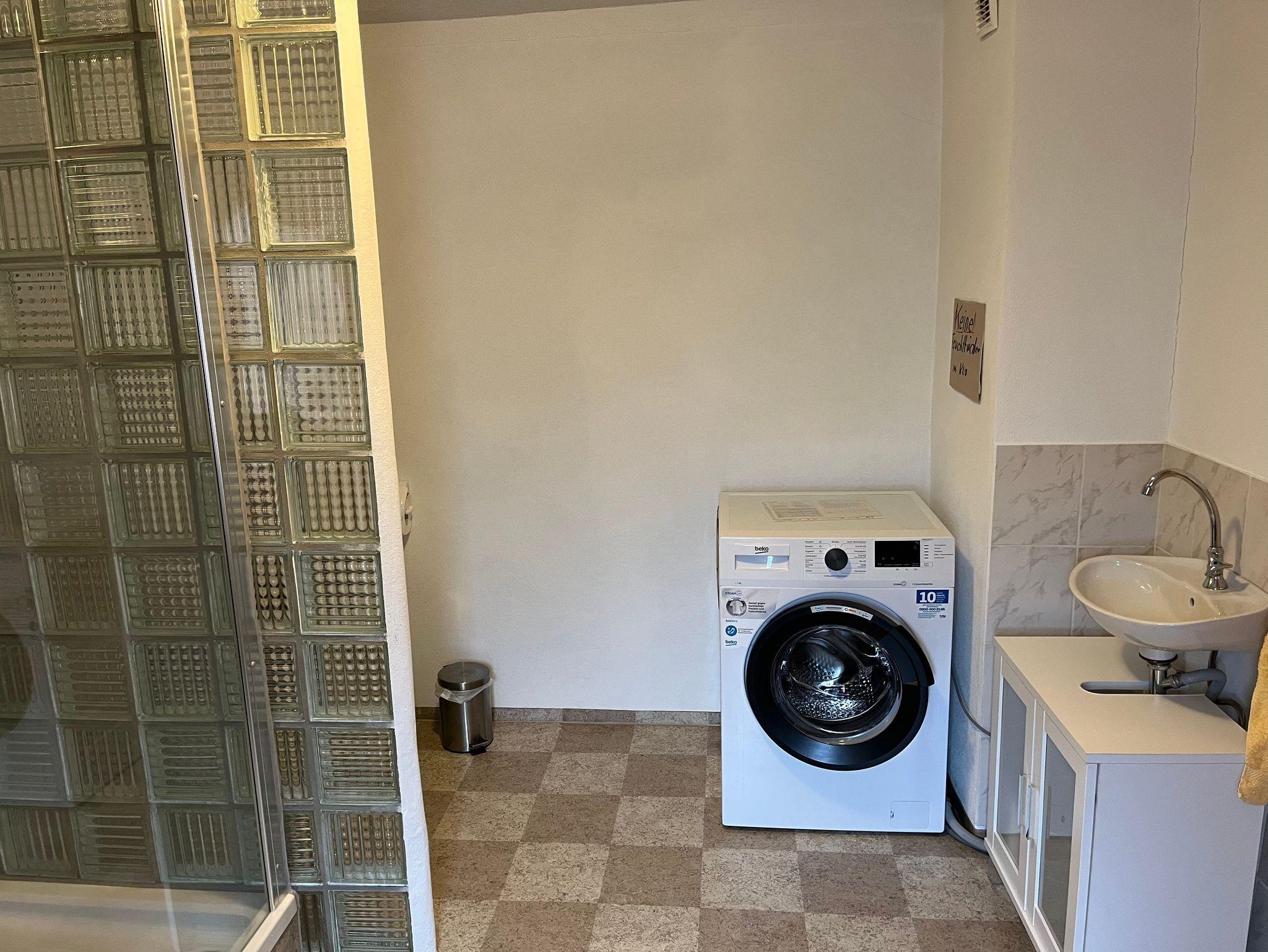 Gemütliche 2-Raum-Ferienwohnung. Wohnküche mit Eßecke. Küche ausgestattet mit 2-Plattenherd, Kaffeemaschine, Wasserkocher, Toaster, Mikrowelle und Kühlschrank. Wohnzimmer mit Couch und TV. Schlafzimmer mit Doppelbett. Badezimmer mit Dusche, WC und Waschmaschine.