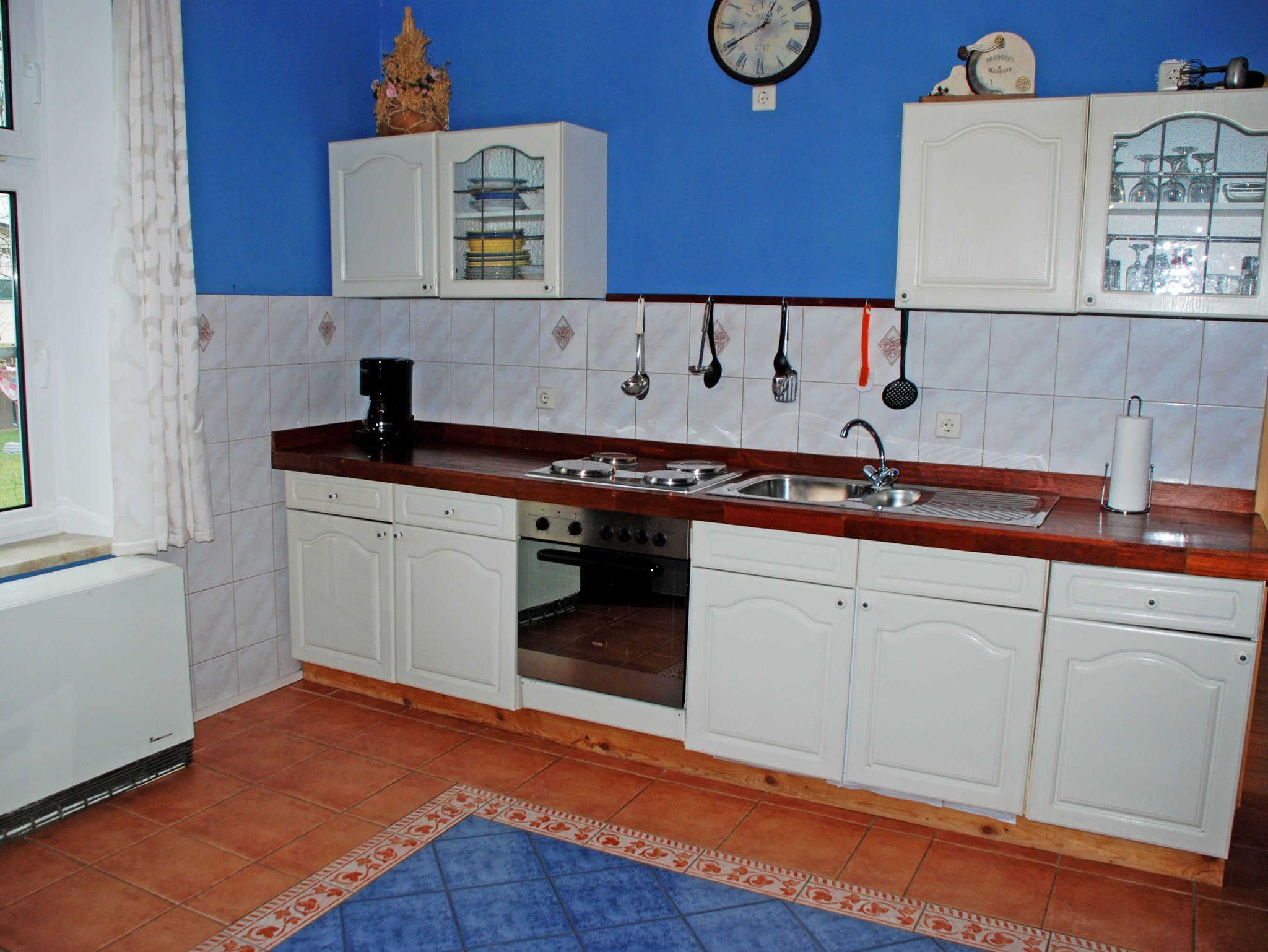 Im großen Wohnzimmer befinden sich eine Sitzcouch (für zwei Gäste aufbettbar) mit Tisch, ein Ledersofa, ein Schrank und ein TV-Gerät sowie ein Klavier. Ein besonderes Flair erhält diese Wohnung durch den vorhandenen Kamin, der besonders im Winter Behaglichkeit bietet. In der großen Küche finden Sie neben einem Esstisch mit Stühlen, einen Herd mit Backofen, Mikrowelle, Kaffeemaschine, Wasserkocher, Toaster und Kühlschrank.