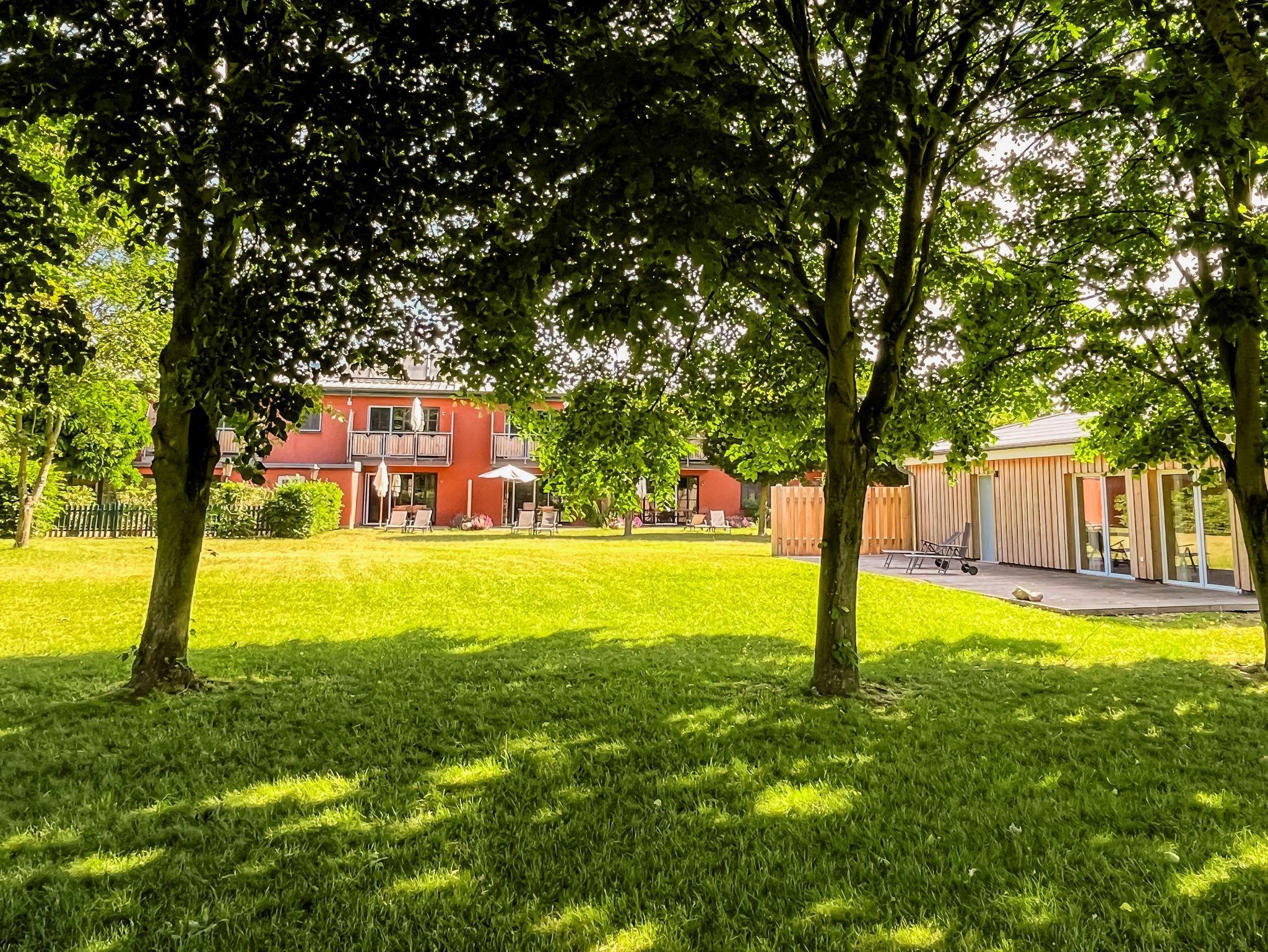 Genießen Sie von Ihrer privaten Terrasse, ausgestattet mit Gartenmöbeln, Sonnenschirm und Sonnenliegen, den Blick auf den gepflegten, idyllischen Außenbereich mit weitläufigen Wiesen und altem Baumbestand. Die ruhige Umgebung lädt zum Verweilen und Entspannen ein.