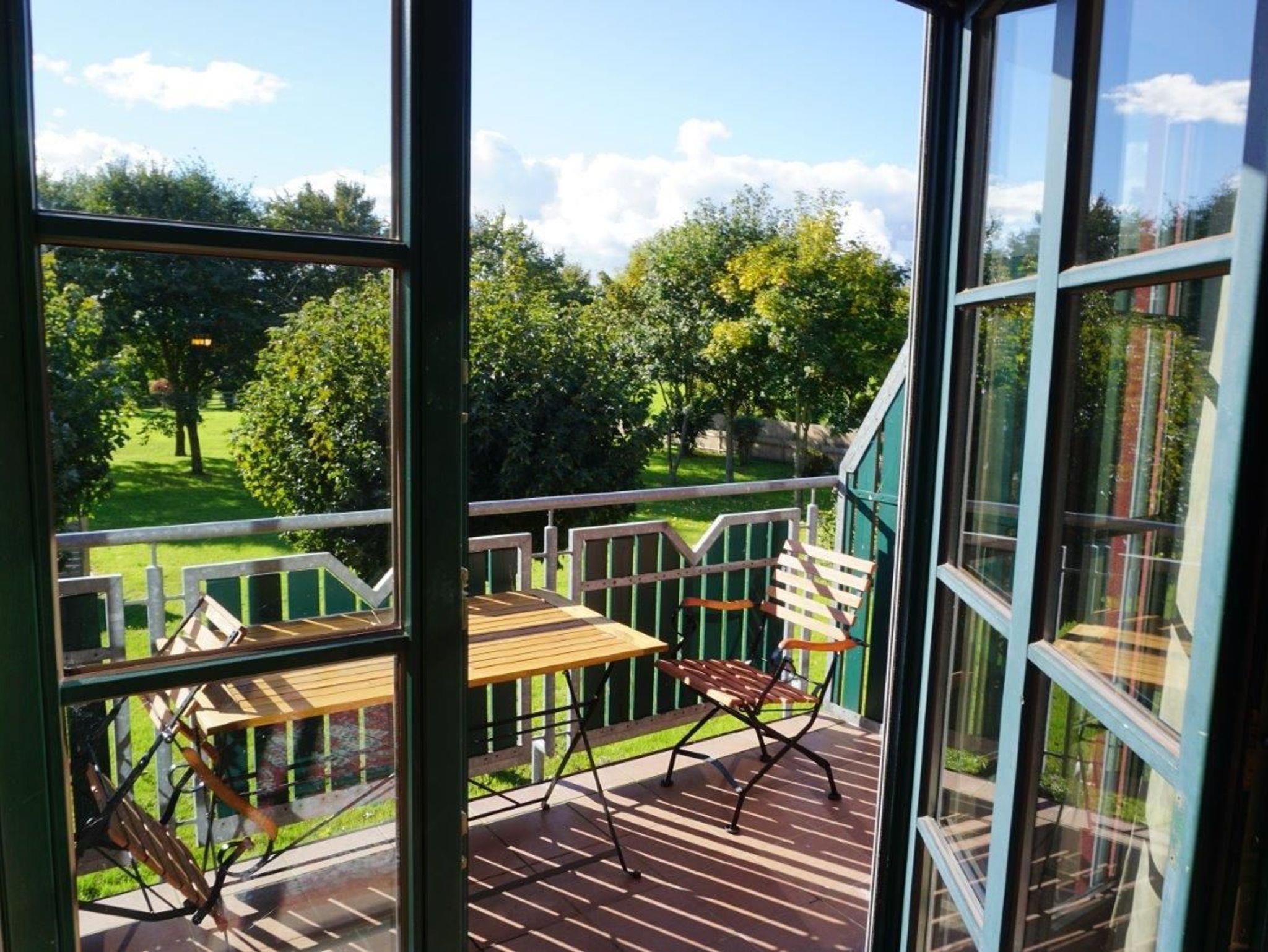 • Zugang zu einem Balkon mit Gartenmöbeln und weitem Blick auf den gepflegten Außenbereich mit altem Baumbestand