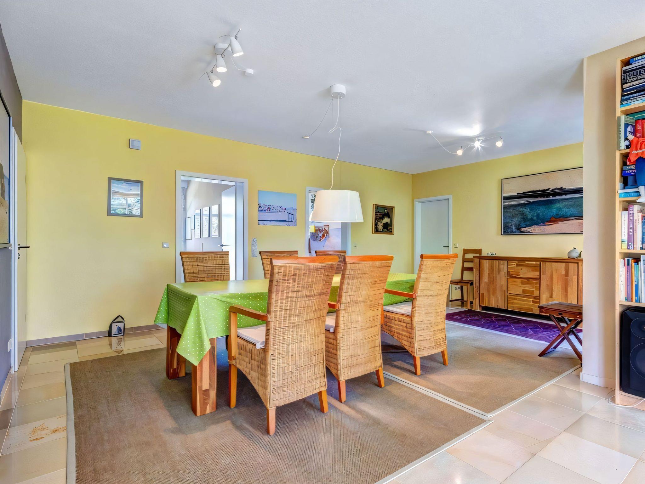 Die Ferienwohnung im Erdgeschoss für bis zu 6 Personen bietet Ihnen großzügigen Komfort mit einem offenen Wohn- und Essbereich. Hier erwarten Sie bequeme Ledersitzmöbel, ein Flachbildfernseher, eine Hifi-Anlage, ein DVD-Player, ein Schreibtisch samt Keyboard, ein Esstisch sowie eine kleine Urlaubsbibliothek.