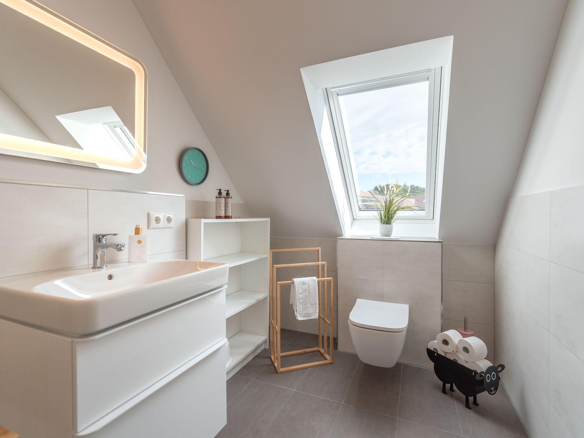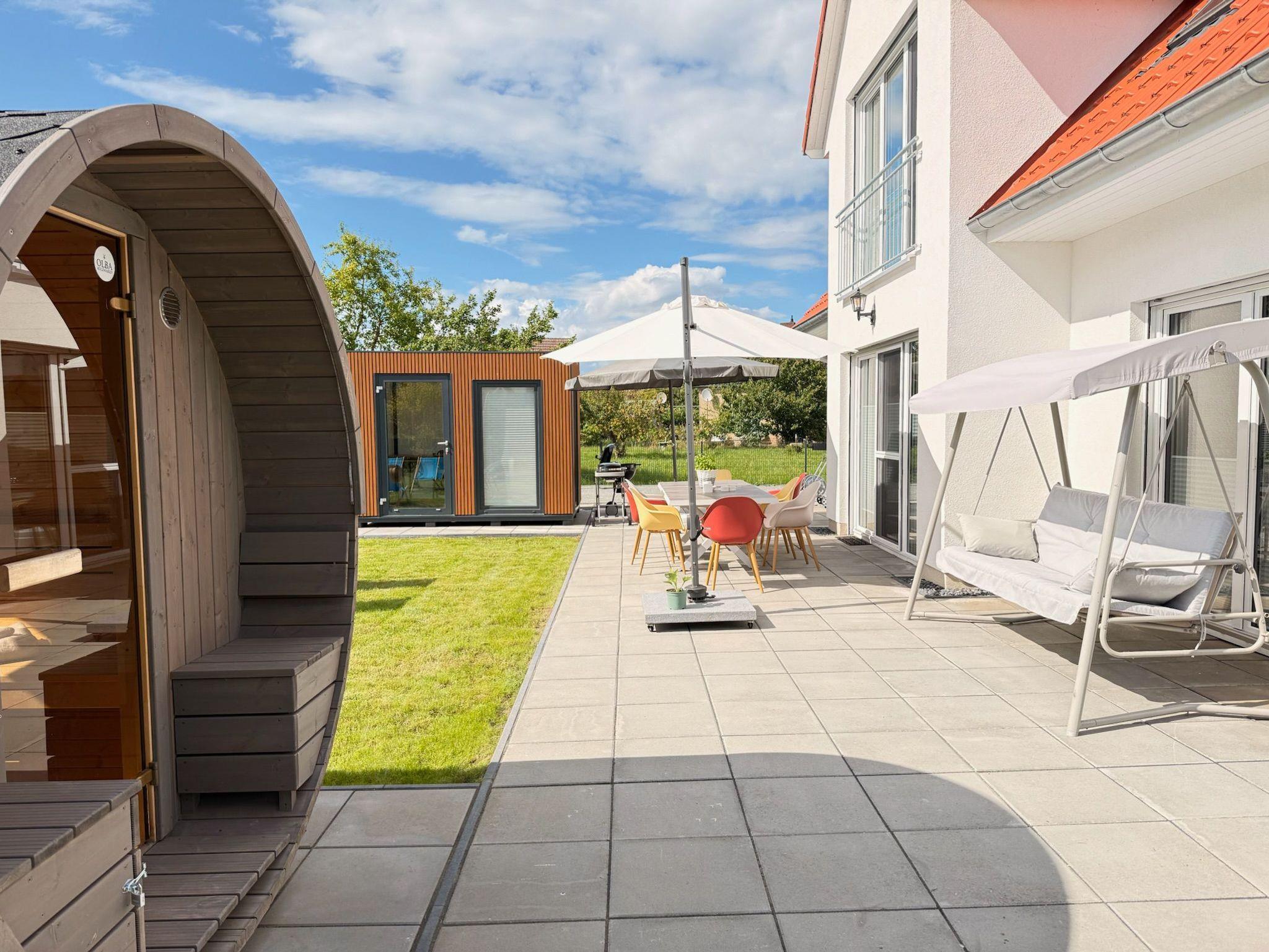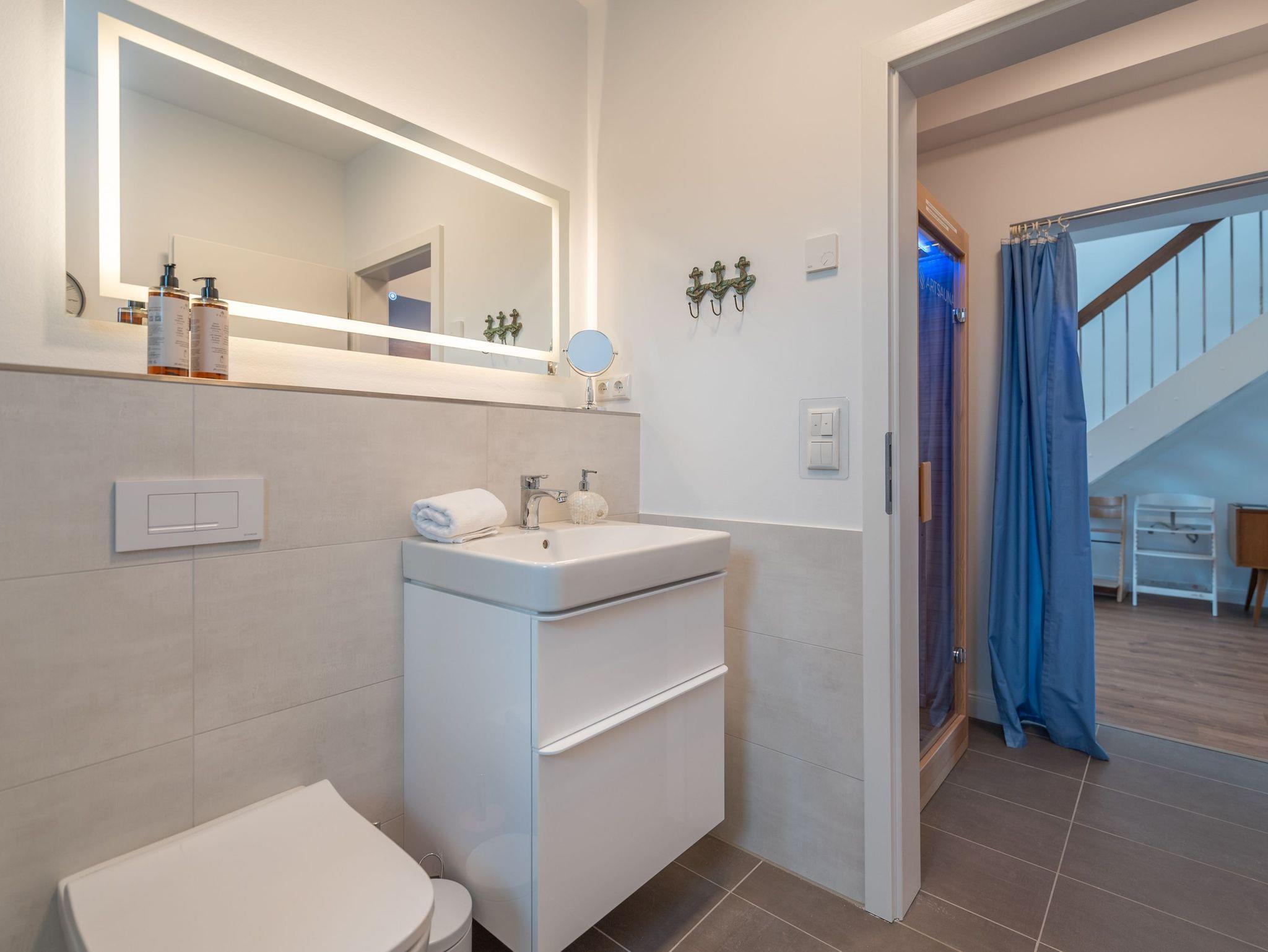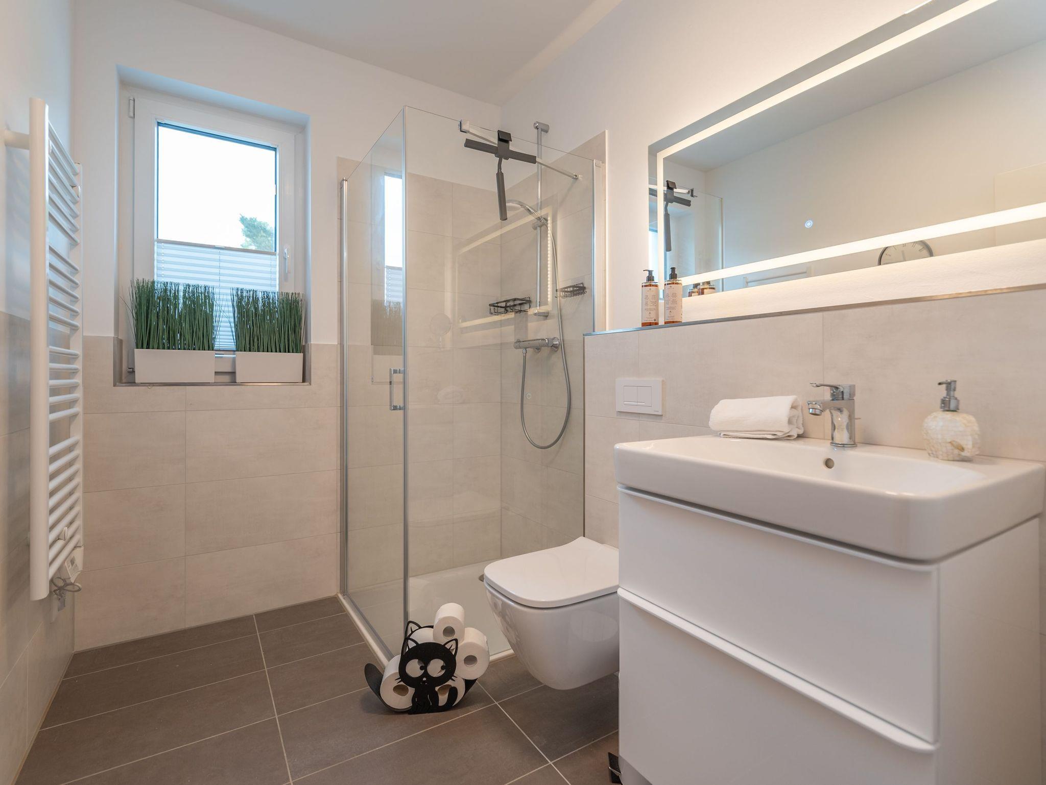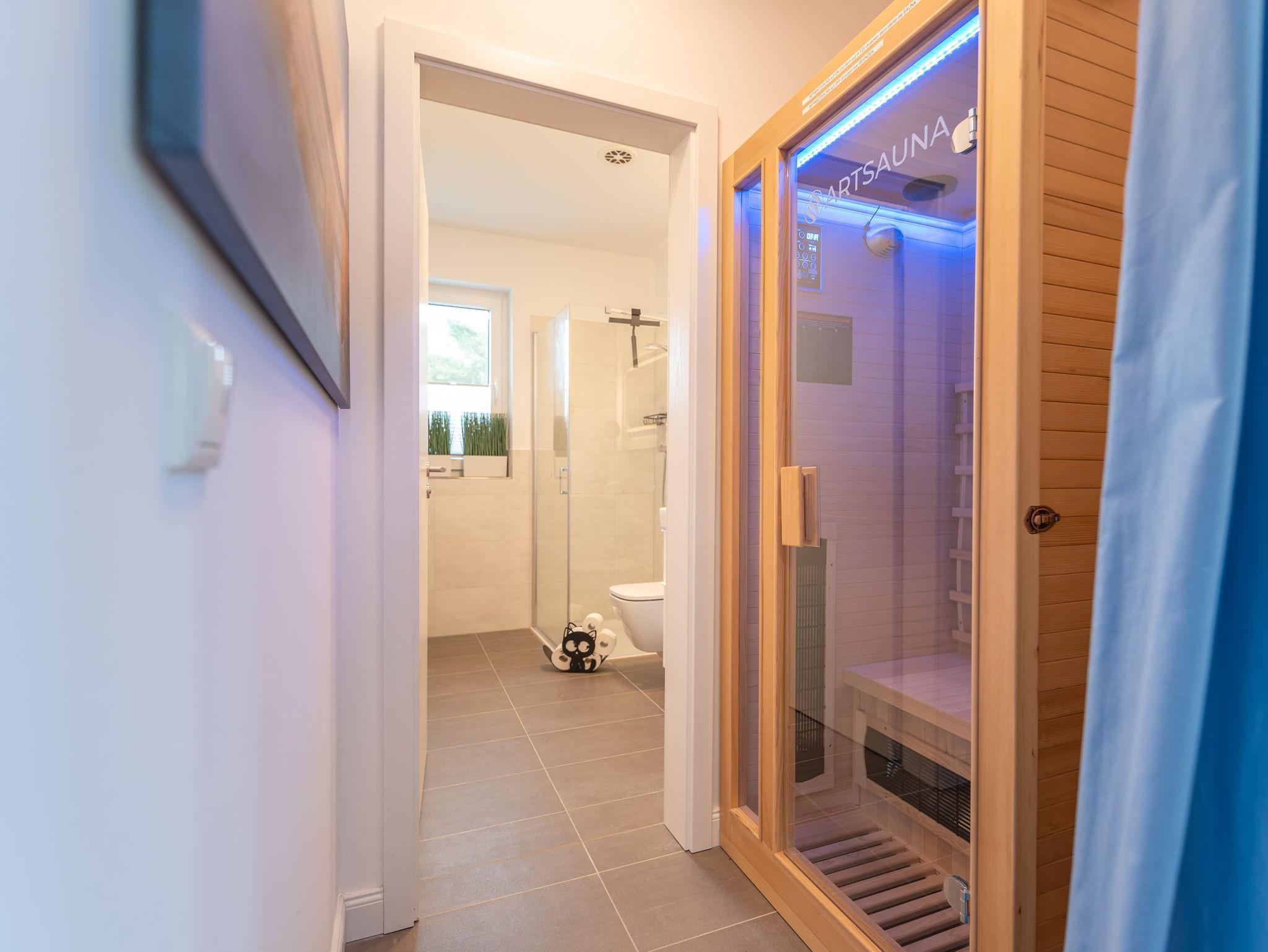 Das Haus verfügt über zwei moderne Badezimmer: Im Erdgeschoss mit Dusche, WC und einer wohltuenden Infrarotkabine, im Obergeschoss mit Dusche und WC. Für besondere Wellnessmomente sorgt das Saunafass im Garten, das zu erholsamen Stunden nach einem aktiven Tag einlädt.