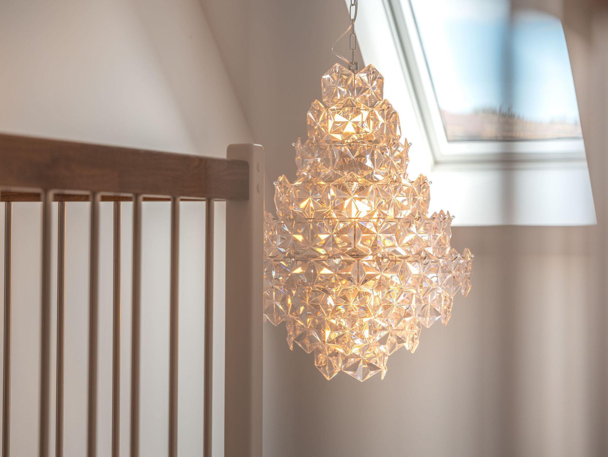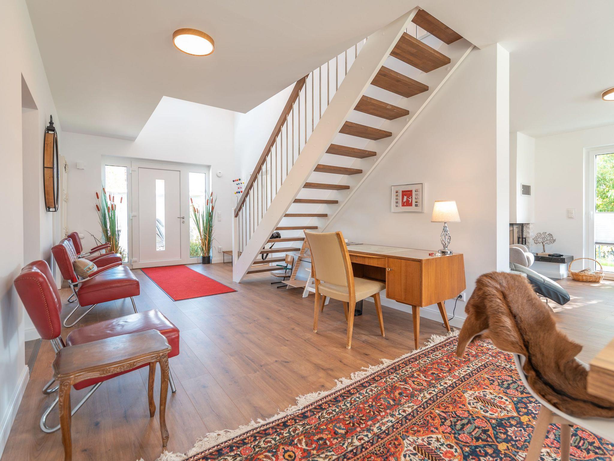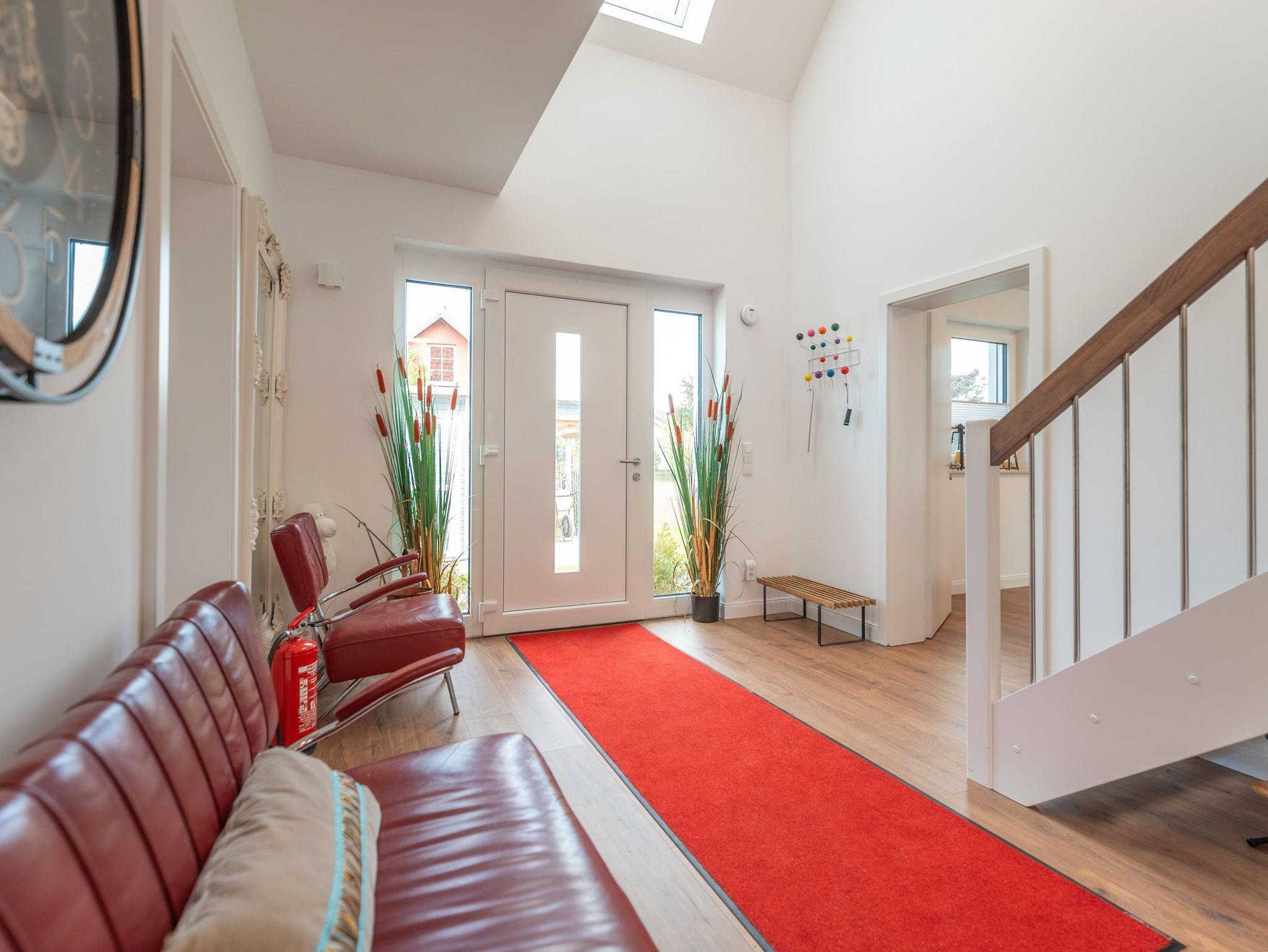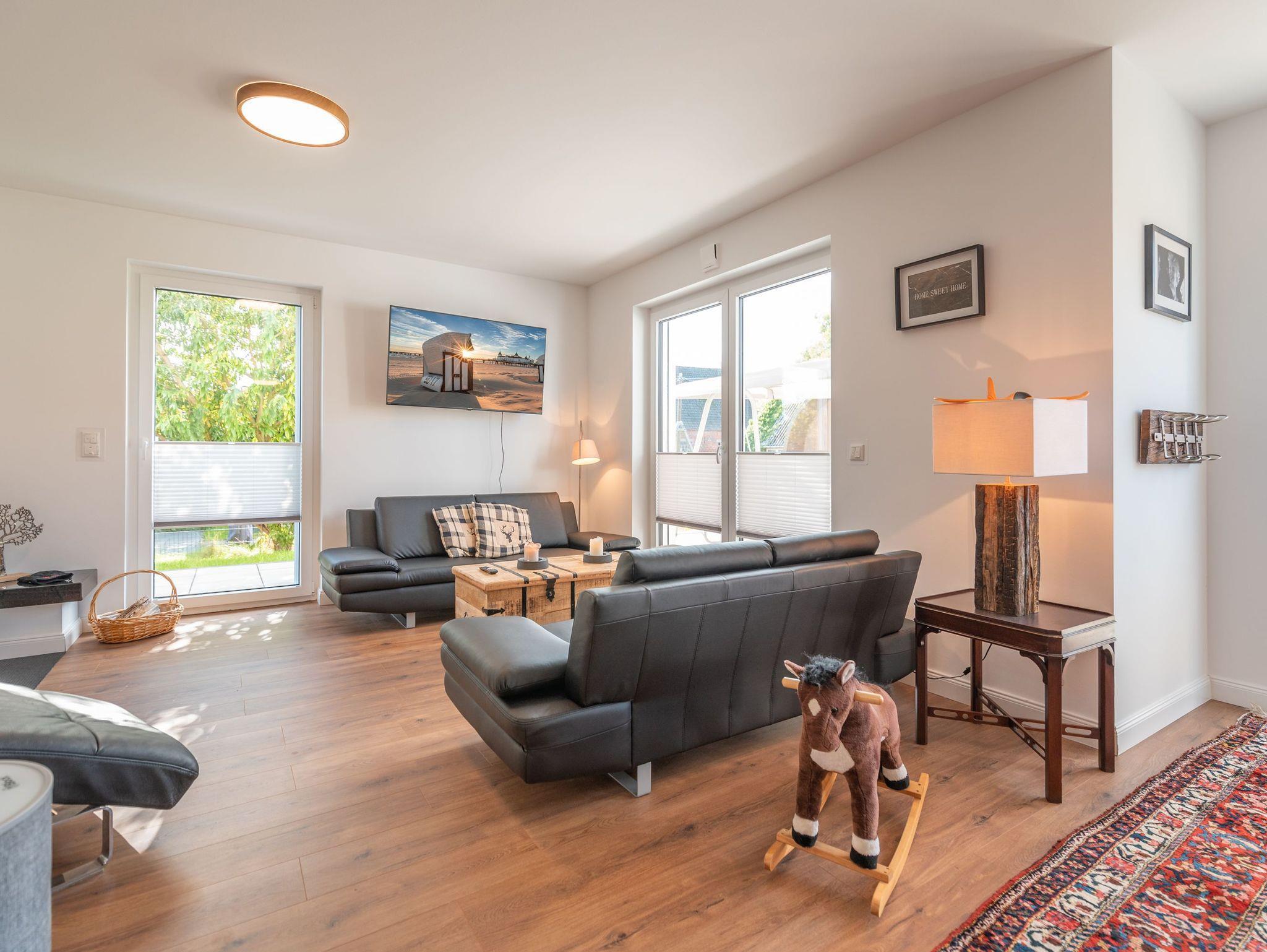 Bereits beim Betreten öffnet sich der weitläufige Wohnbereich, der mit viel Licht, gemütlichen Sofas und einem großen TV ausgestattet ist. Eine kleine Bibliotheksecke mit Kamin lädt dazu ein, sich mit einem Buch zurückzuziehen oder den Abend in wohliger Wärme ausklingen zu lassen.