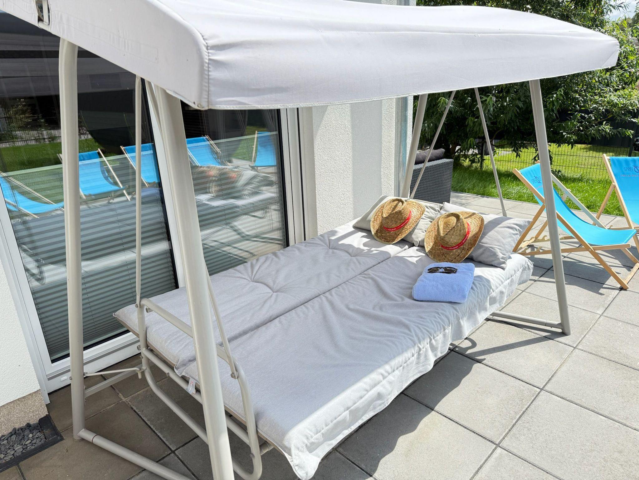 Der Außenbereich von DeRuhHus ist wie geschaffen für entspannte Urlaubstage im Freien. Auf der Terrasse stehen Ihnen ein großer Esstisch mit Stühlen, mehrere Sonnenliegen, gemütliche Loungemöbel, eine Hollywoodschaukel mit Liegefunktion sowie ein Grill zur Verfügung. Hier können Sie sonnige Stunden genießen, den Tag entspannt ausklingen lassen oder laue Sommerabende bei einem Glas Wein verbringen stets begleitet vom beruhigenden Flair der umliegenden Natur.